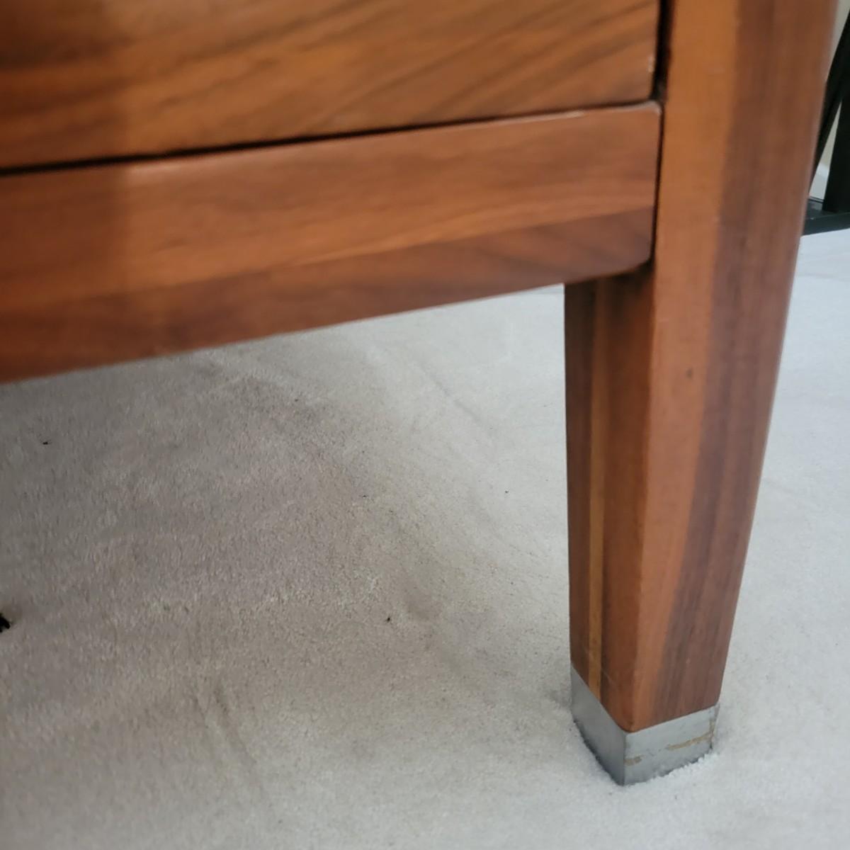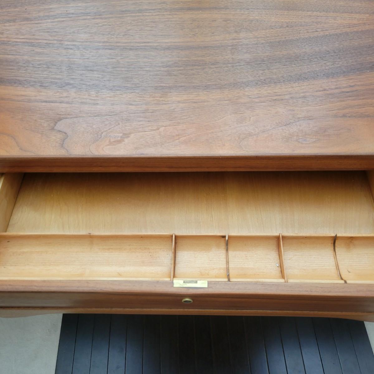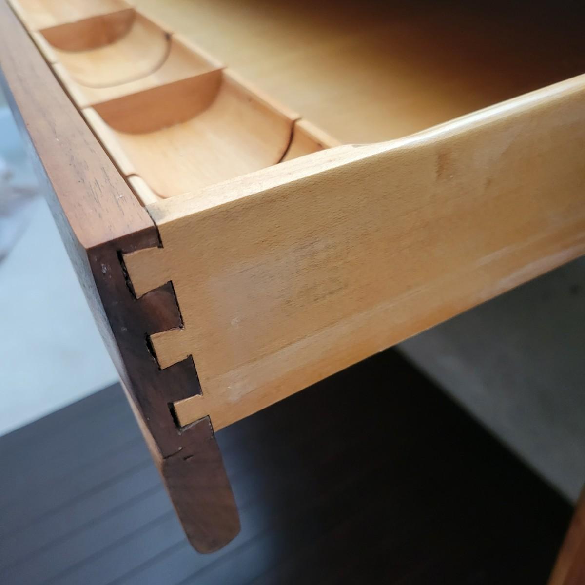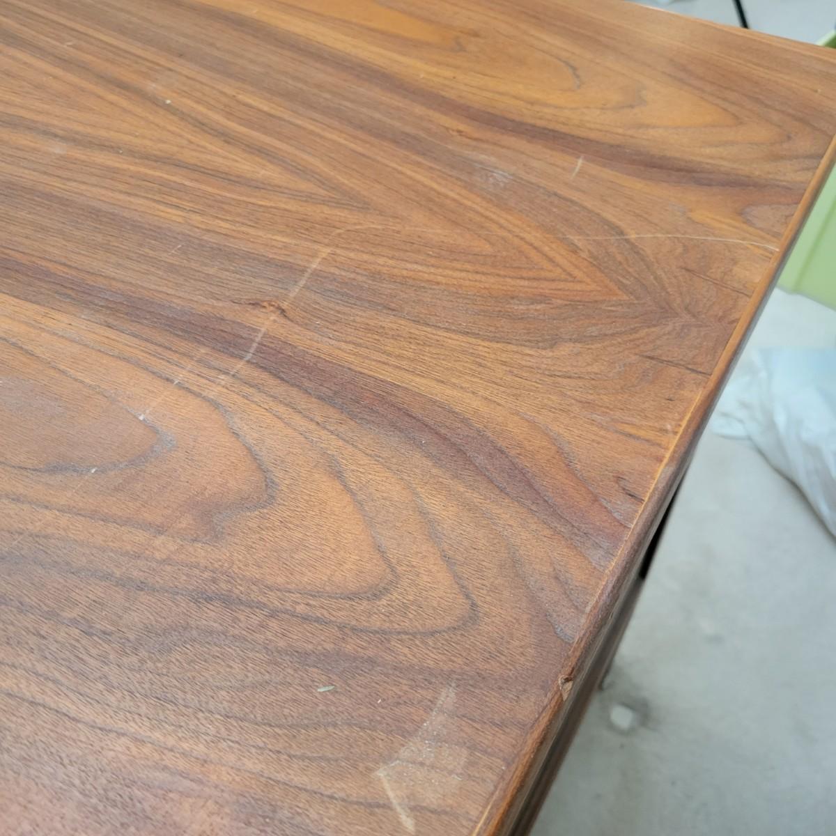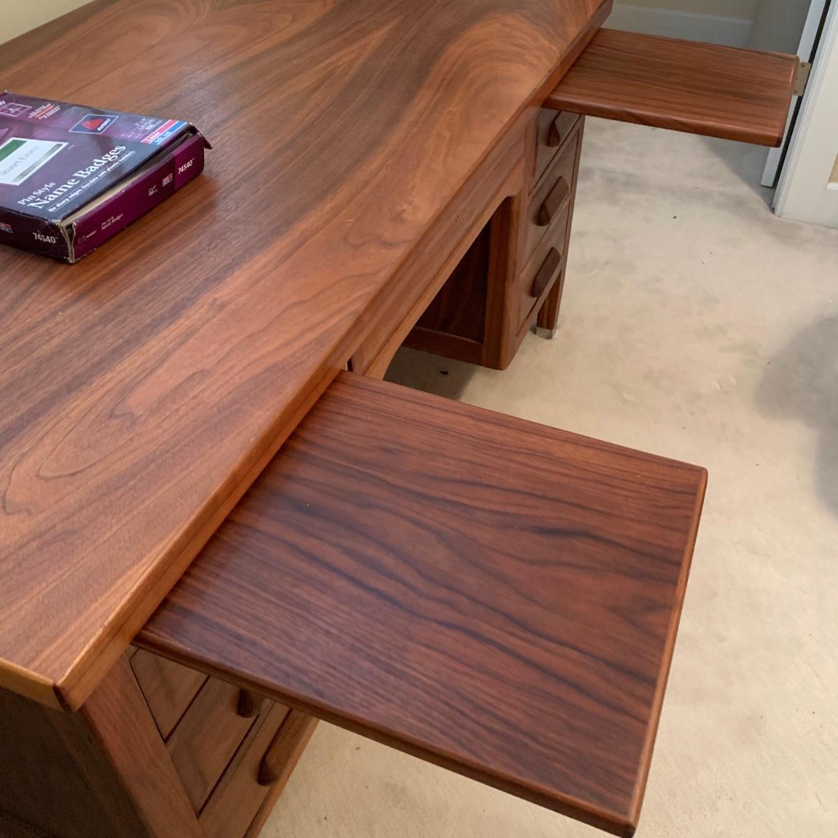 A wooden office desk in good condition with some minor scratches on its surface. This desk is solid wood with a light brown stain. It has six drawers that are dovetailed and two pullouts for additional surface area. It has six legs for support and is finished on its back so that it could be utilized mid room. Measures approximately 60" x 34" x 30". Local pickup only Winning bidder must bring assistance to help move and load this item due to its weight and/or size. This item will also need to go down a flight of stairs.