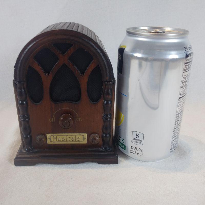 Wooden Music box in the shape of a radio. Plays "Those Were the Days". On/off knob vibrates when playing but it still works and sounds good.