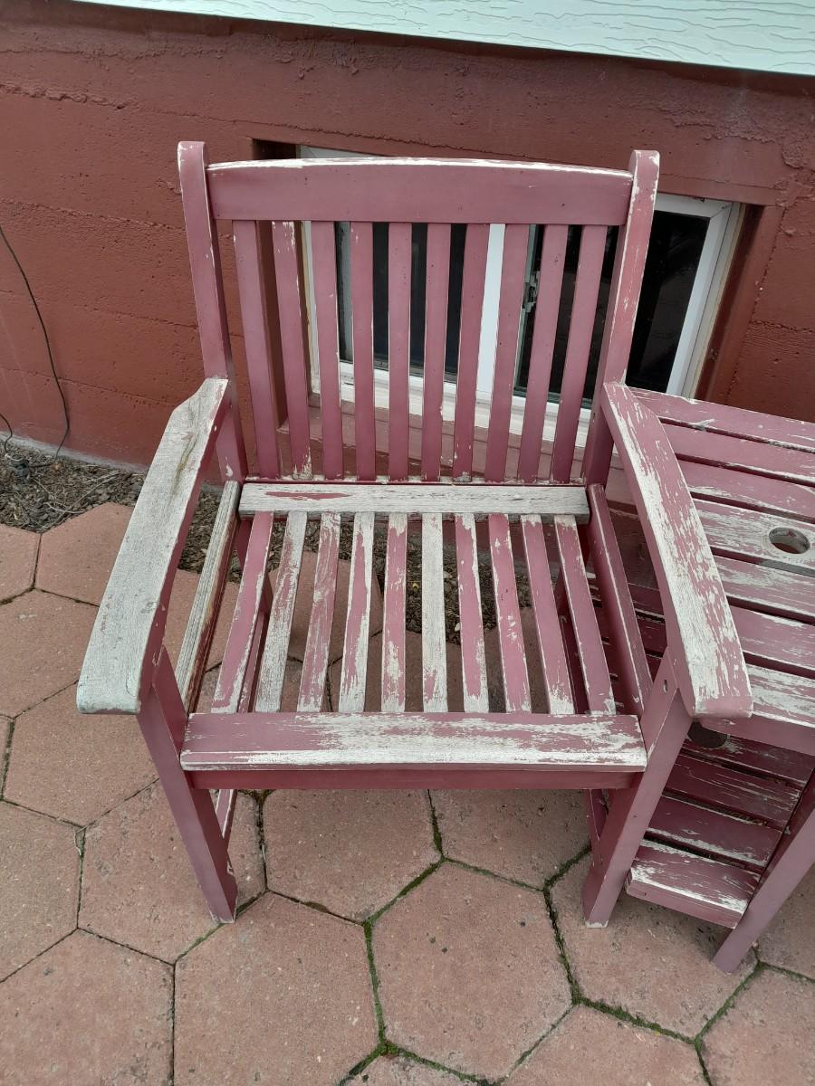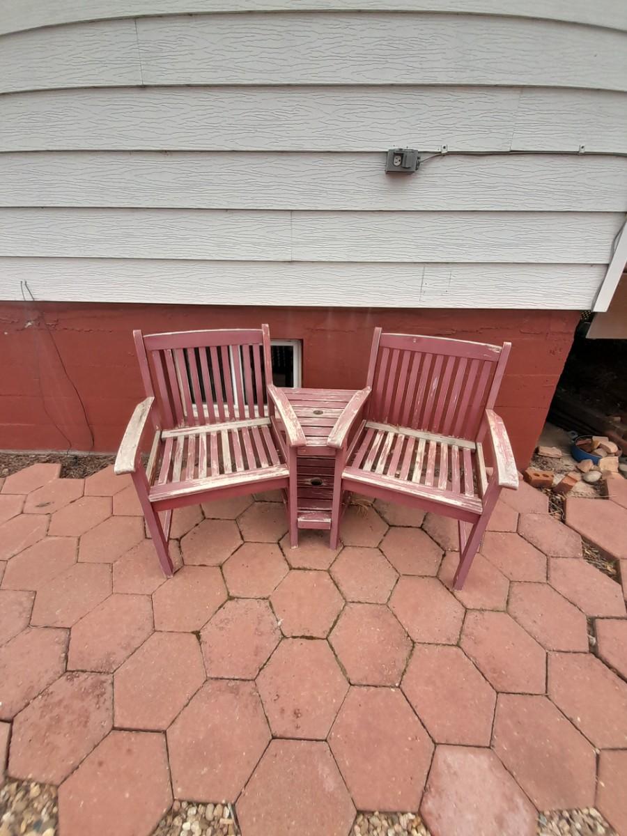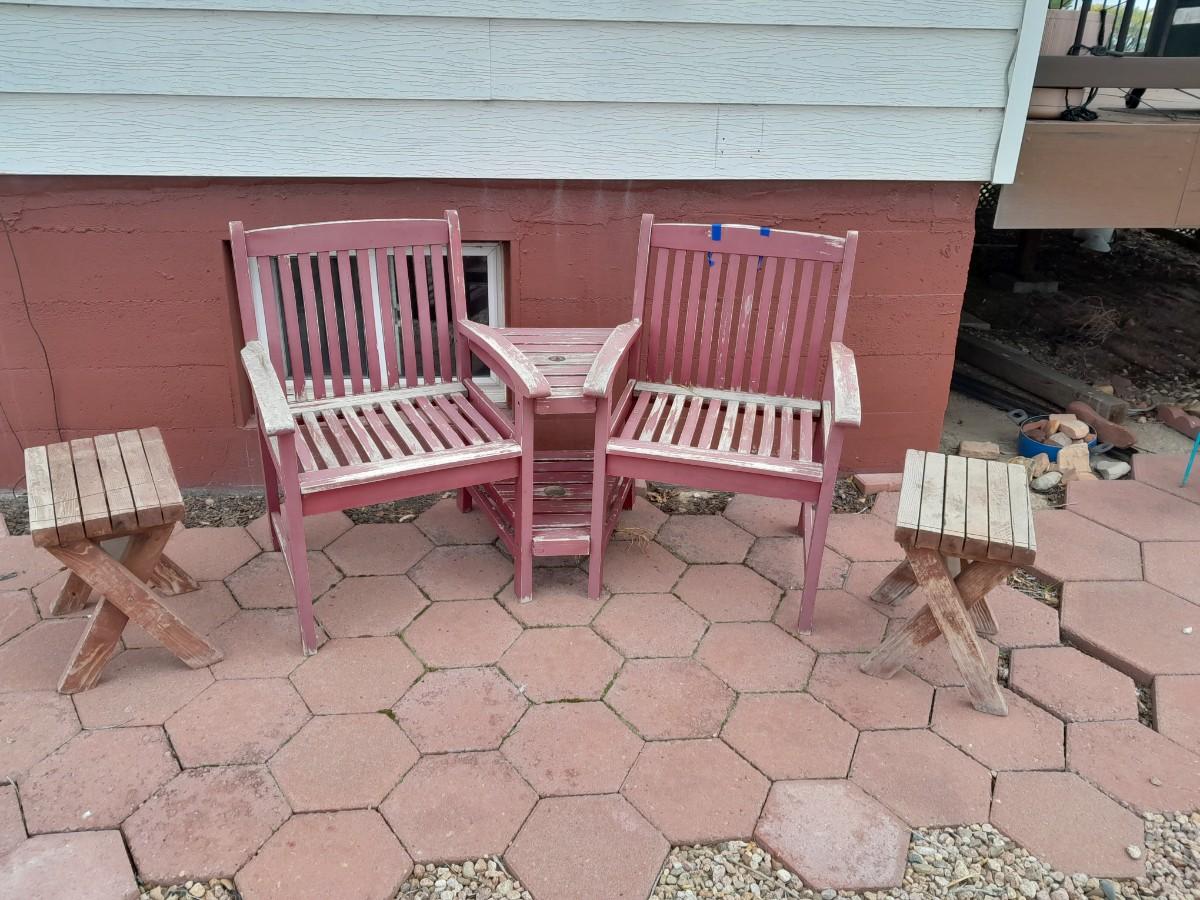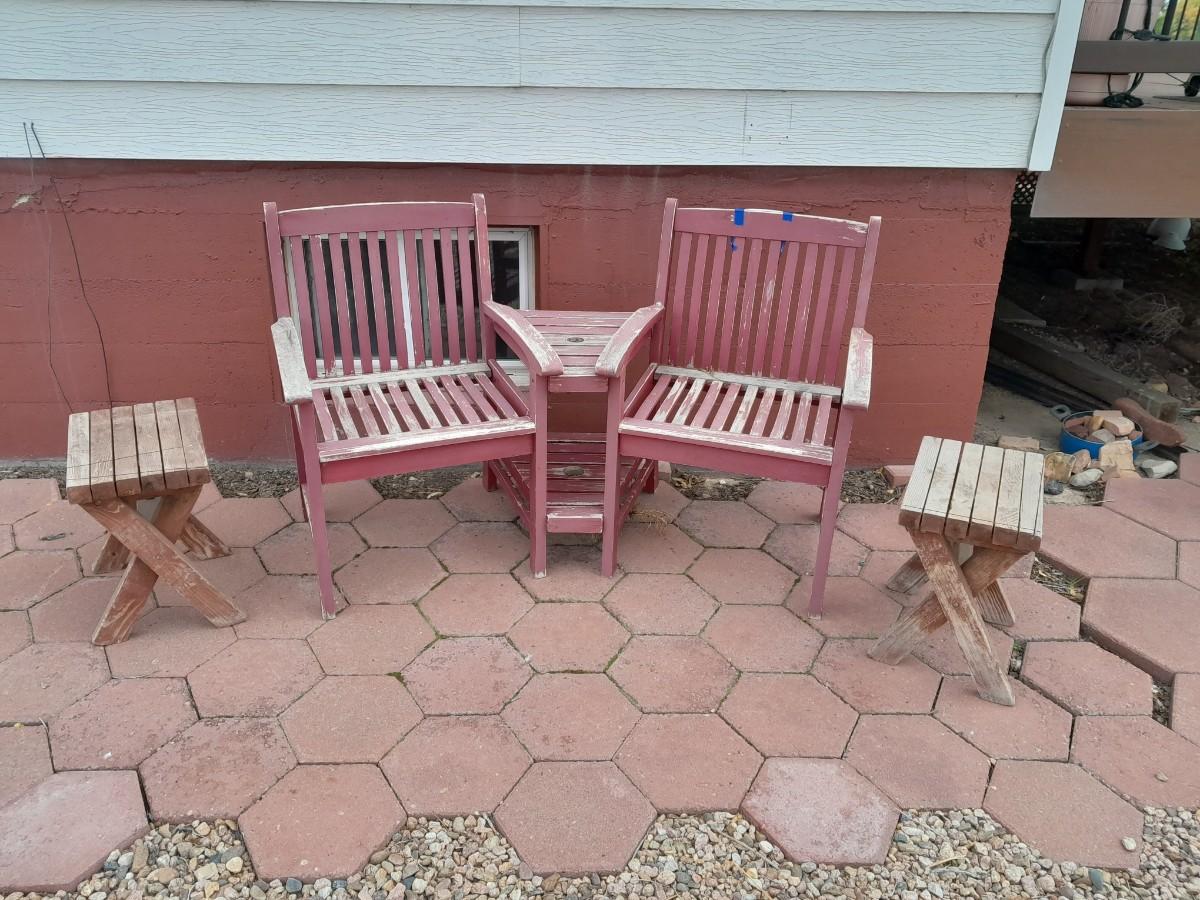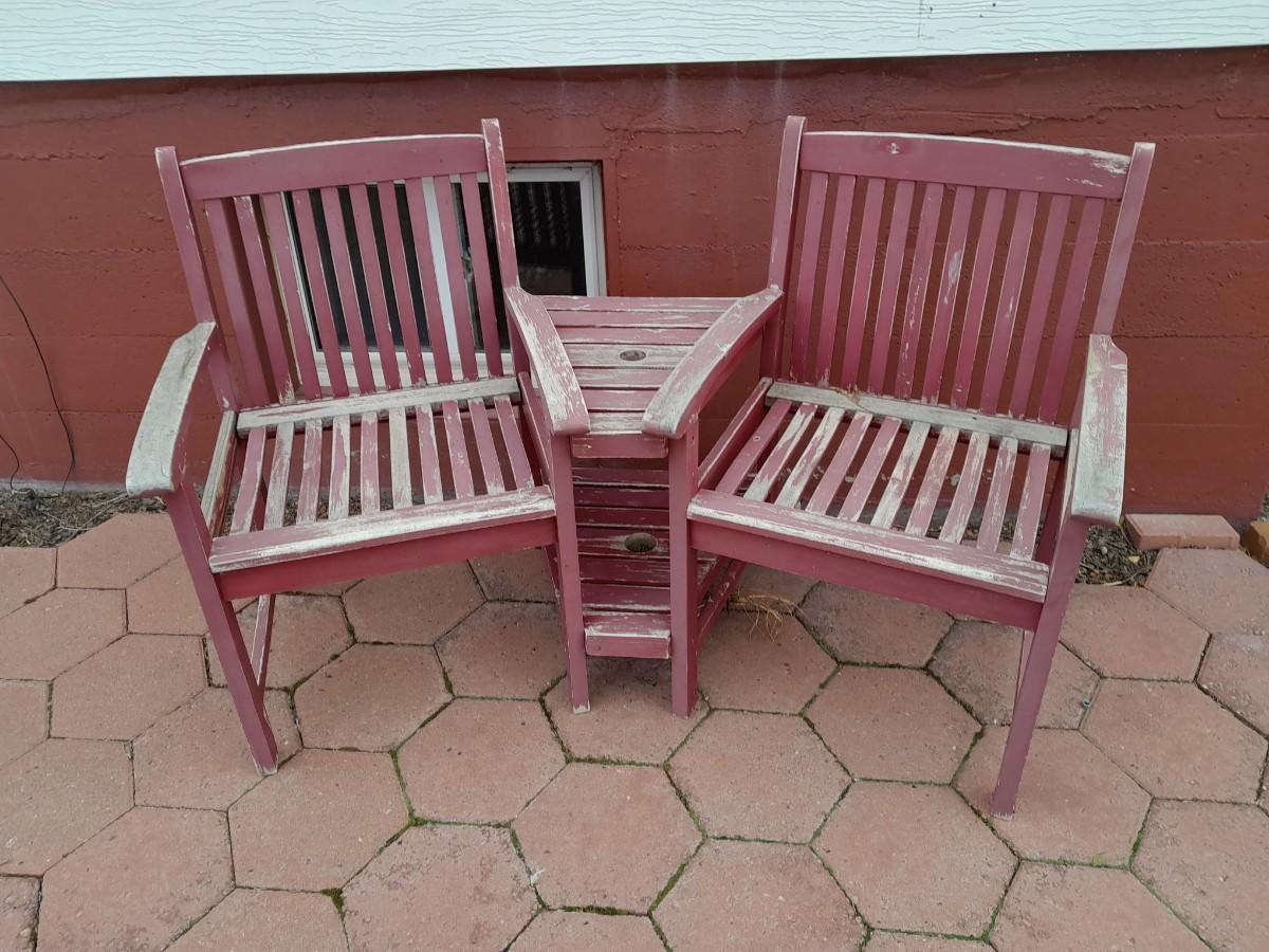 WOODEN ONE-PIECE TWO-SEATER PATIO FURNITURE WITH TABLE IN BETWEEN AND TWO WOODEN SIDE TABLES APPROX. 35" X 61" X 25"