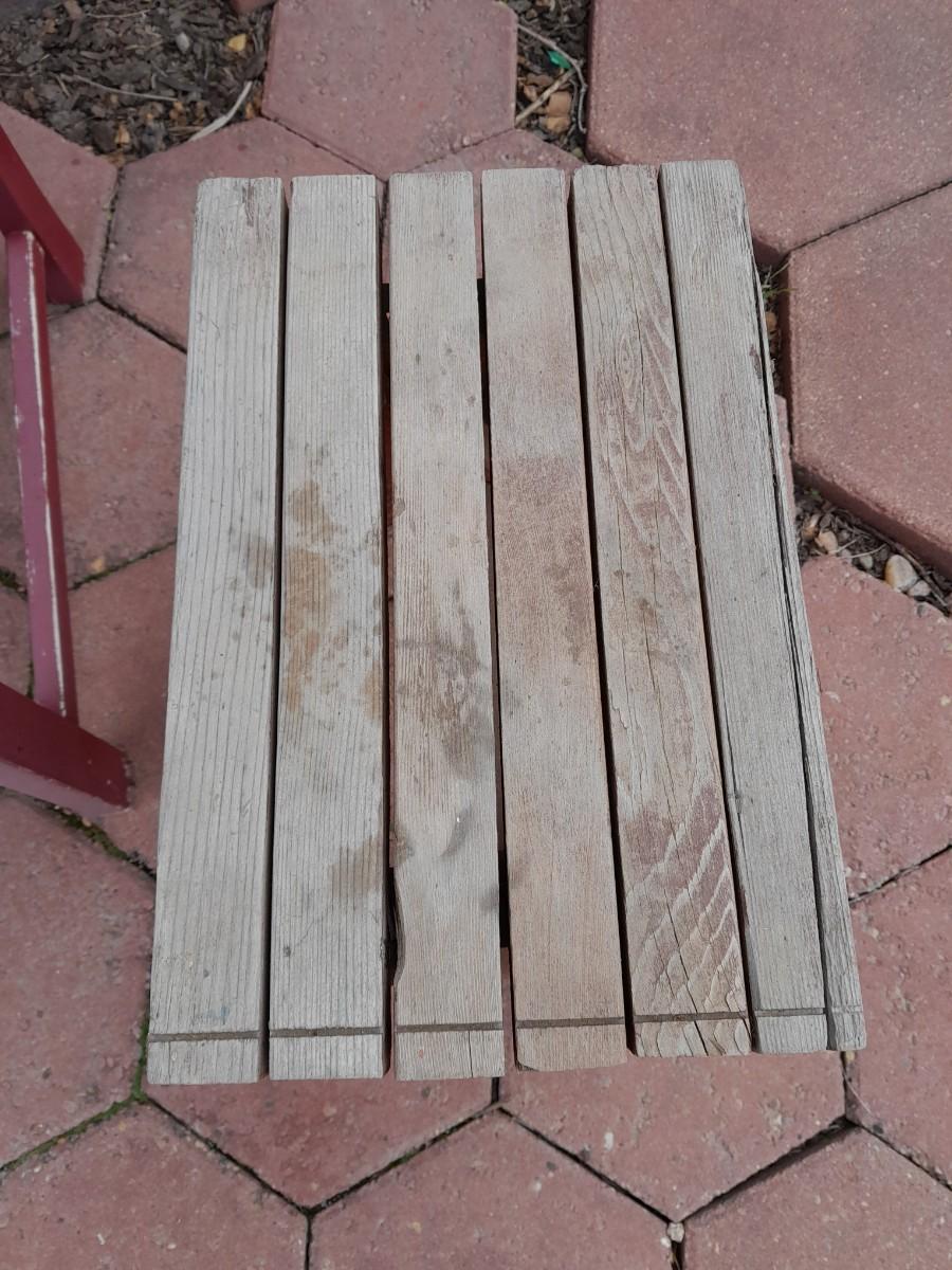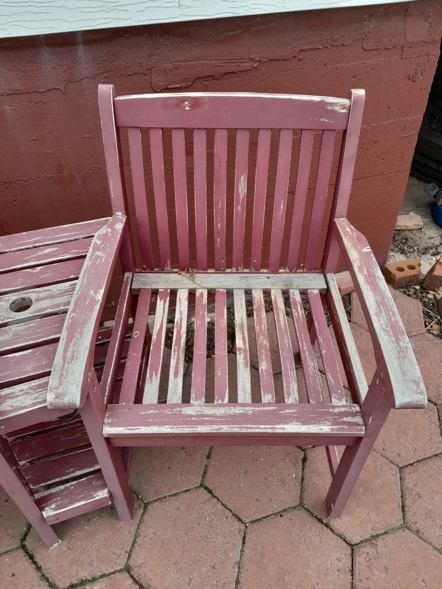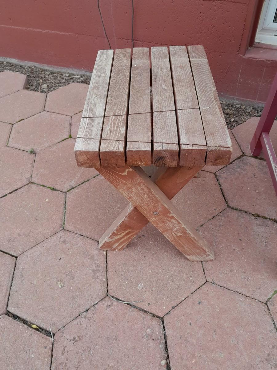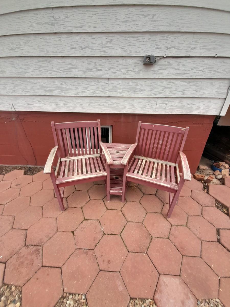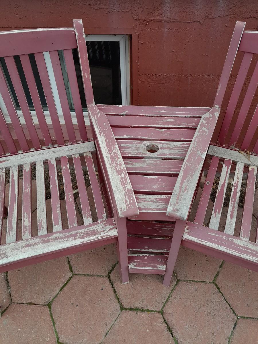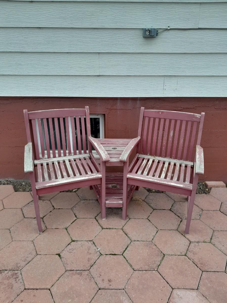 WOODEN ONE-PIECE TWO-SEATER PATIO FURNITURE WITH TABLE IN BETWEEN AND TWO WOODEN SIDE TABLES APPROX. 35" X 61" X 25"