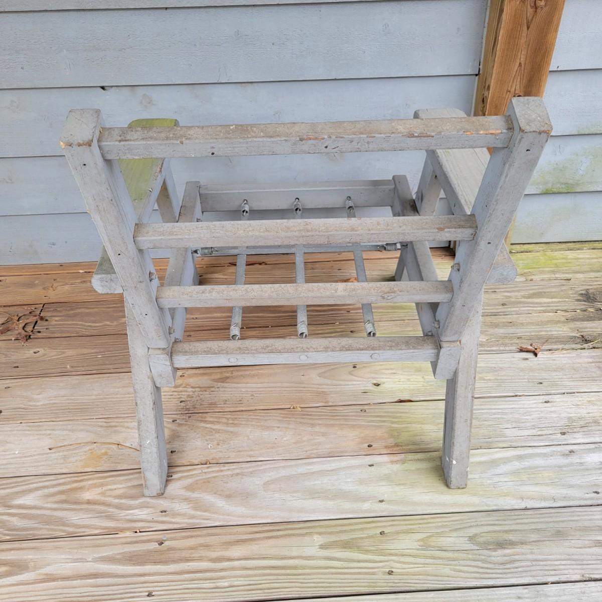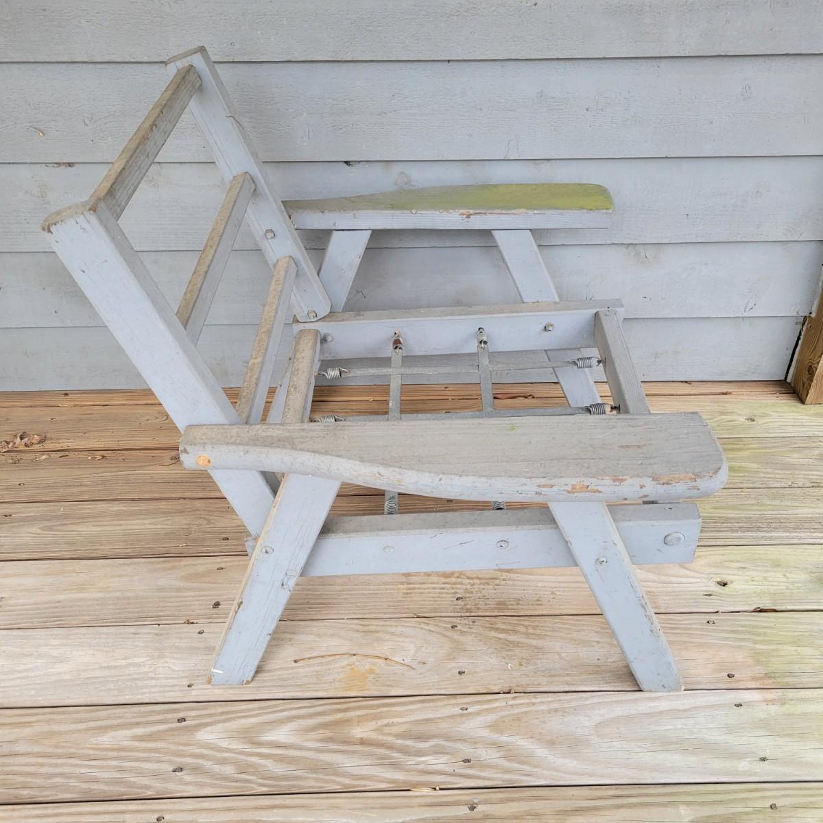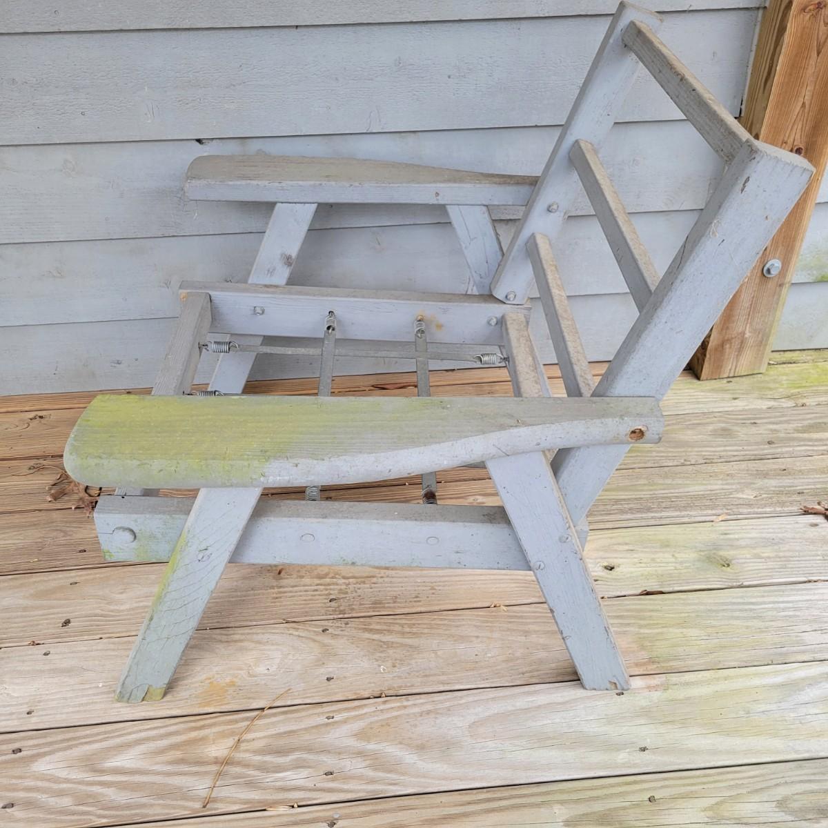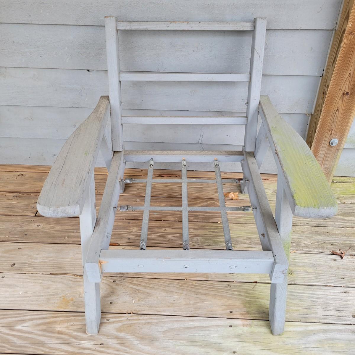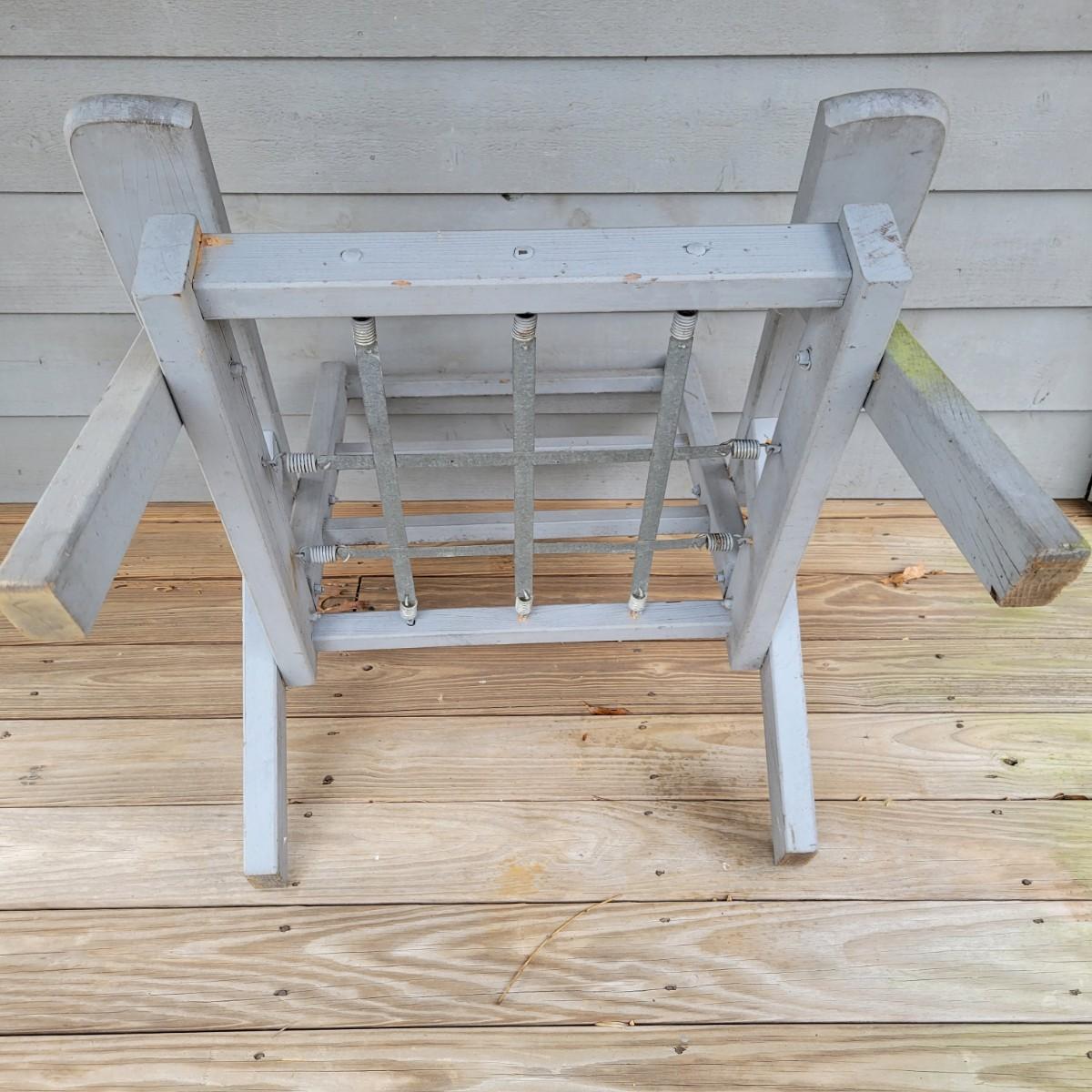 A wooden outdoor chair with some faded paint and staining from being outdoors. It has a metal and spring base and measures approximately 30" x 28" x 30"H with a seat height of 13". Local pickup only
