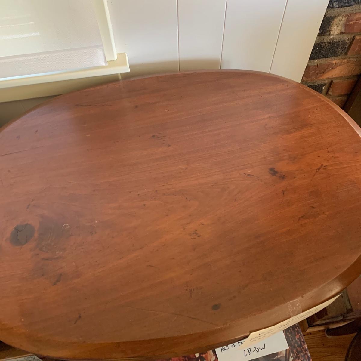 A vintage solid wood table with an oval top, a decorative base, and metal casters in good condition with some minor surface blemishes and scratches, pointed out in the photos. Table measures approximately 31" x 22" x 29". Local pickup only