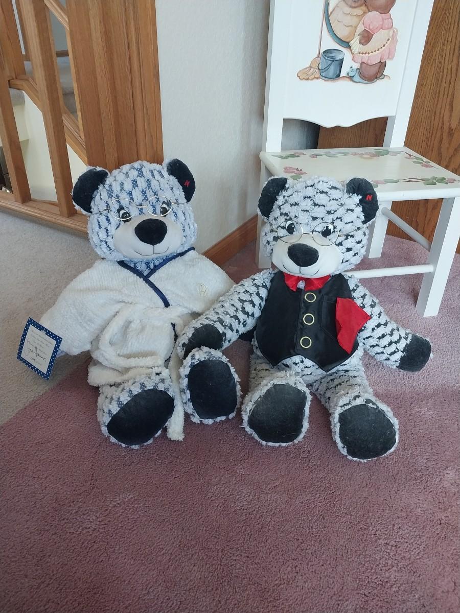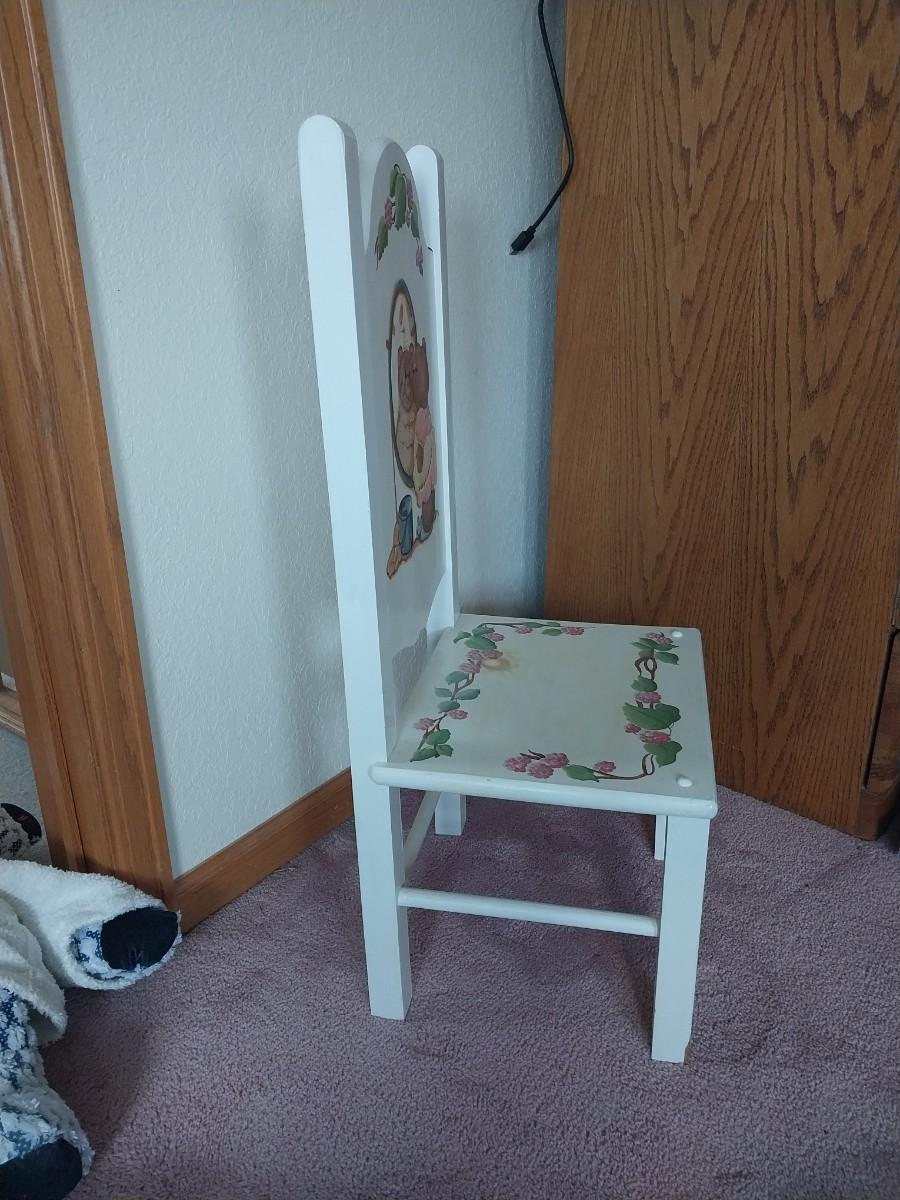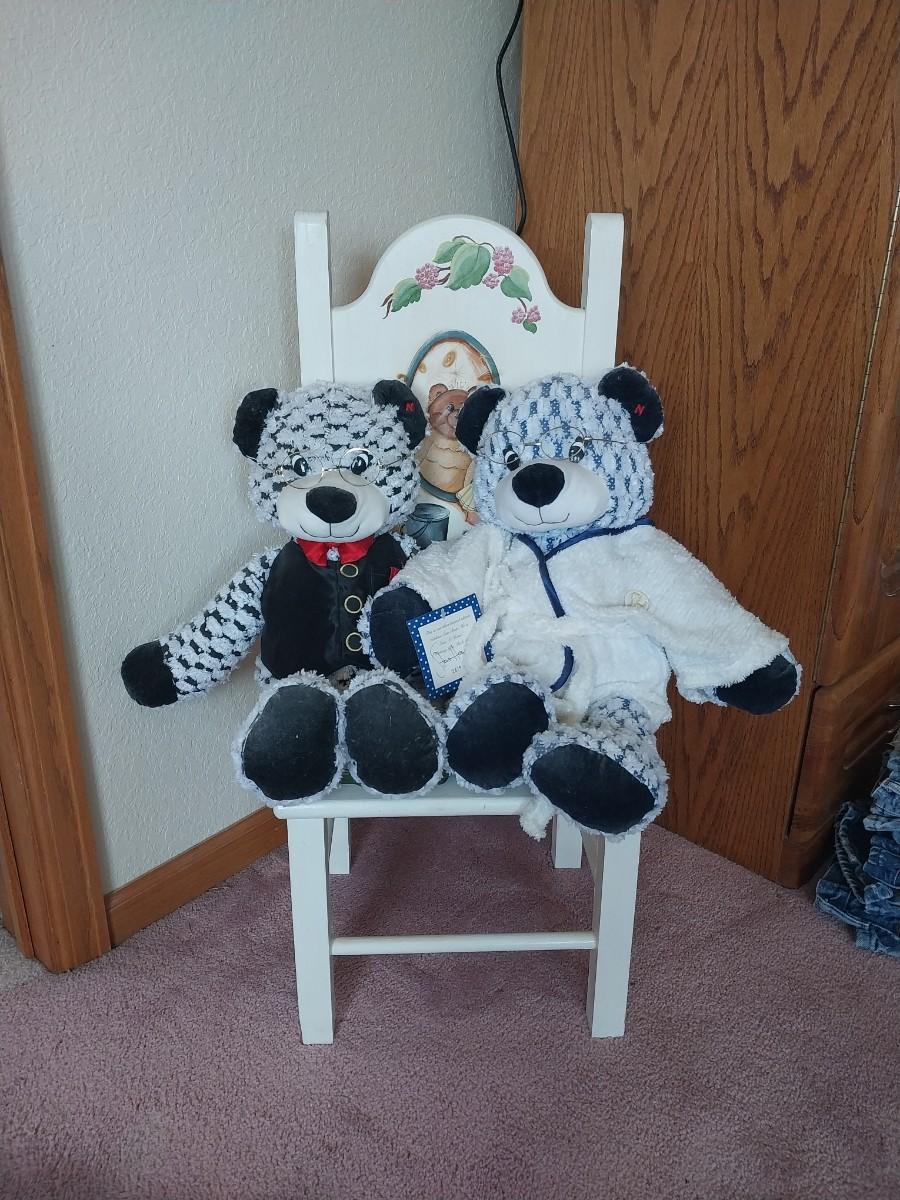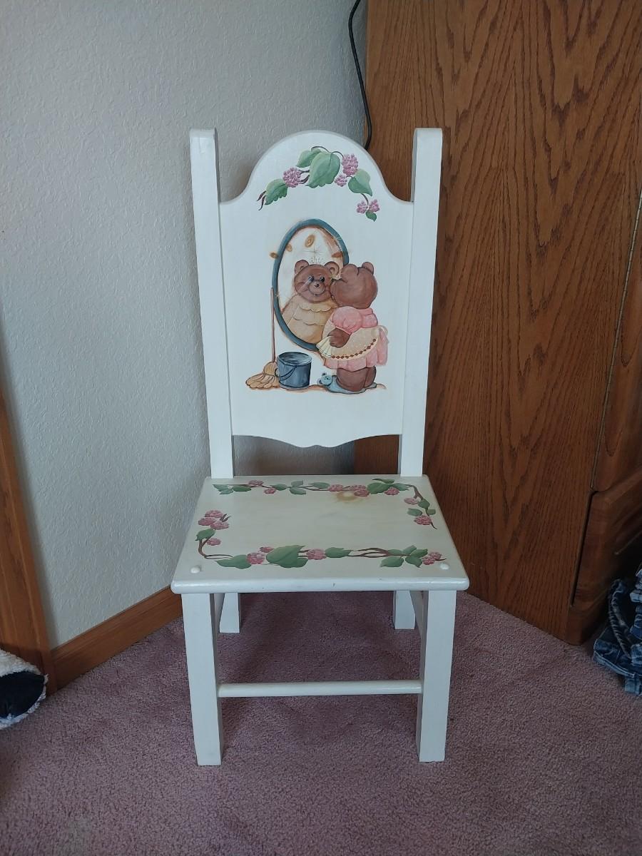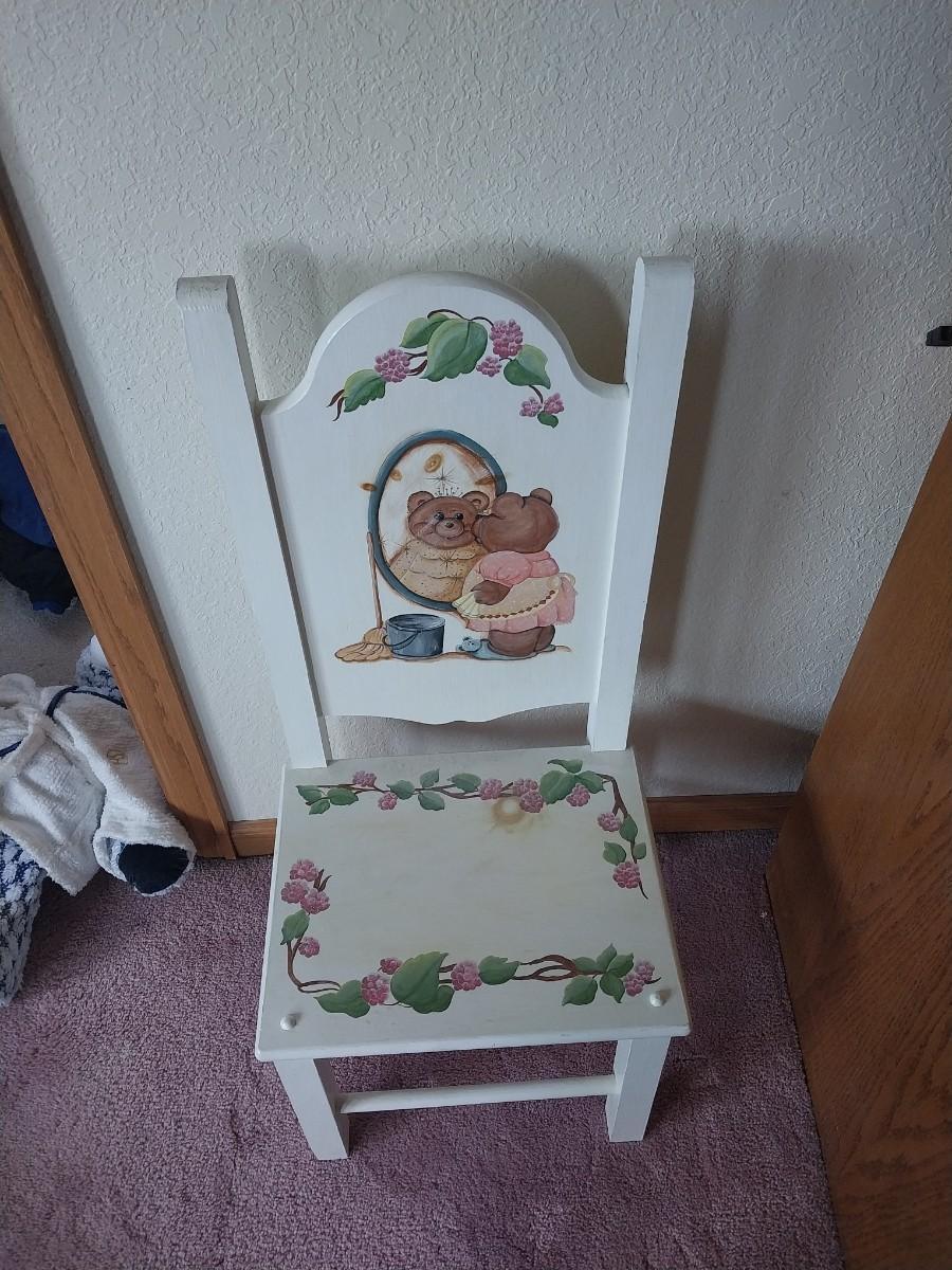 WOODEN PAINTED CHAIR WITH TWO PLUSH BEARS