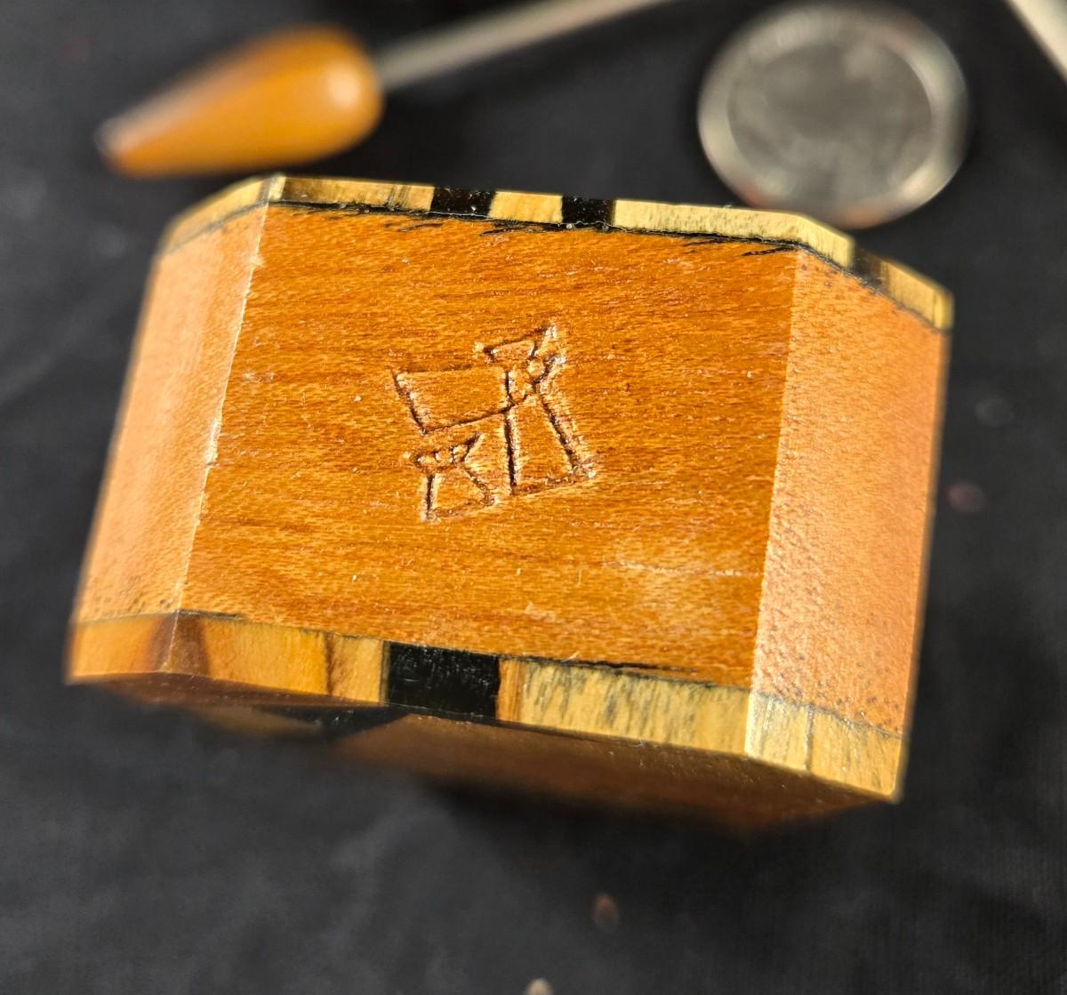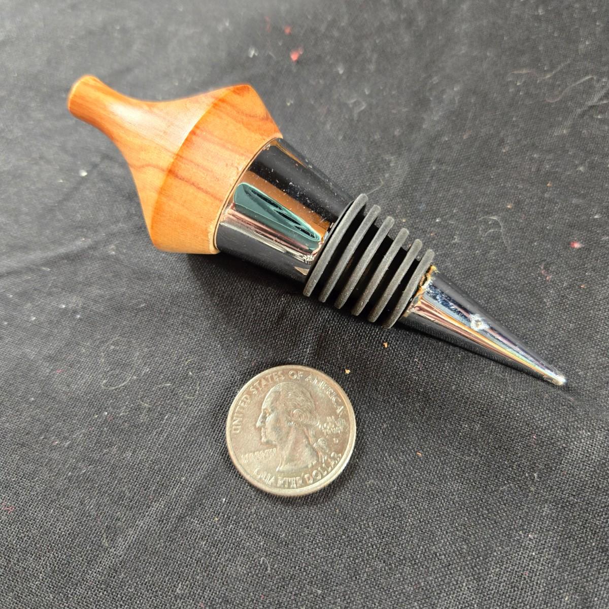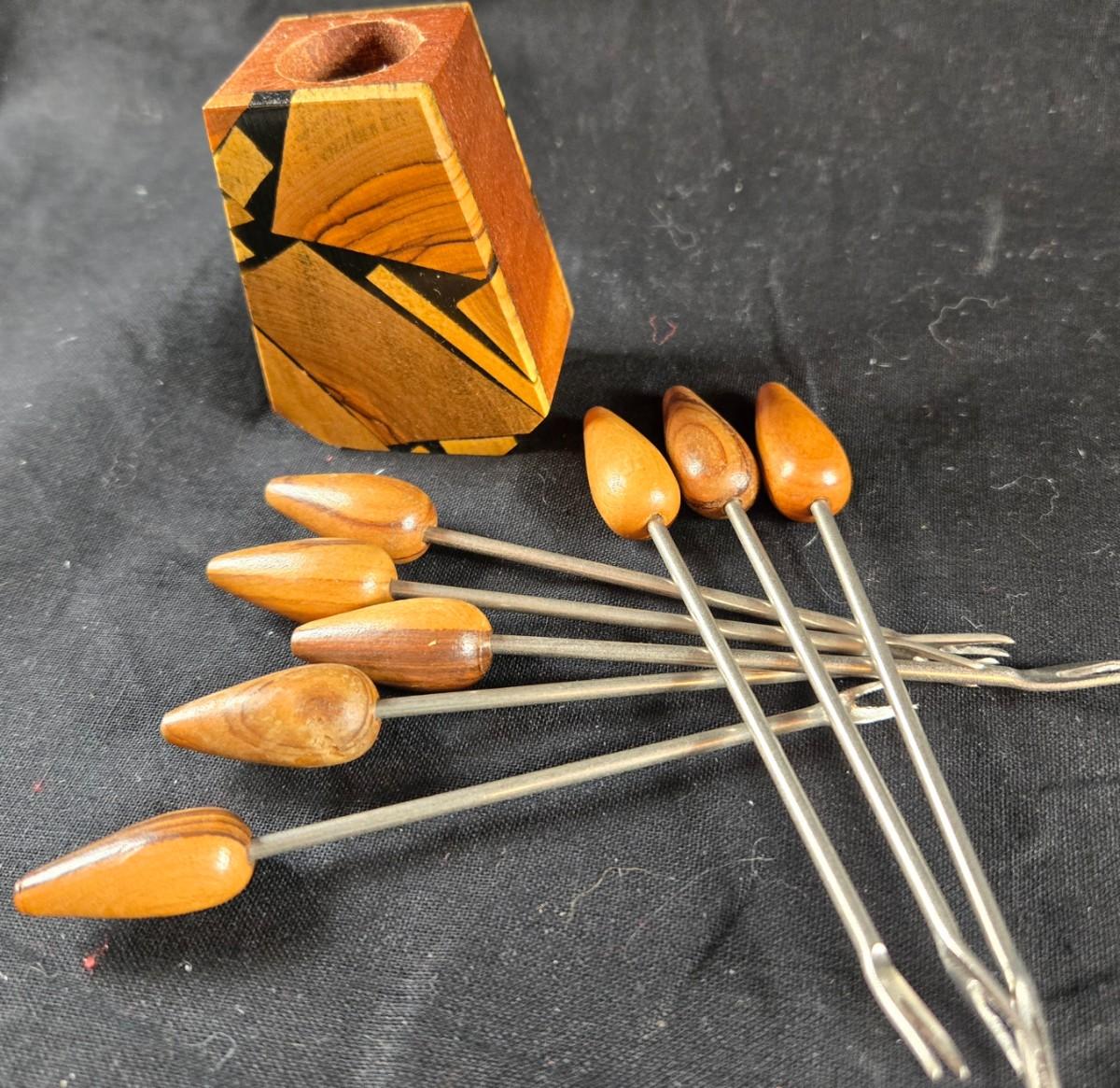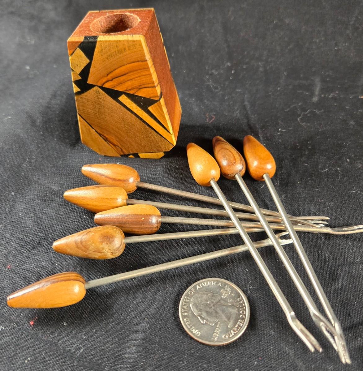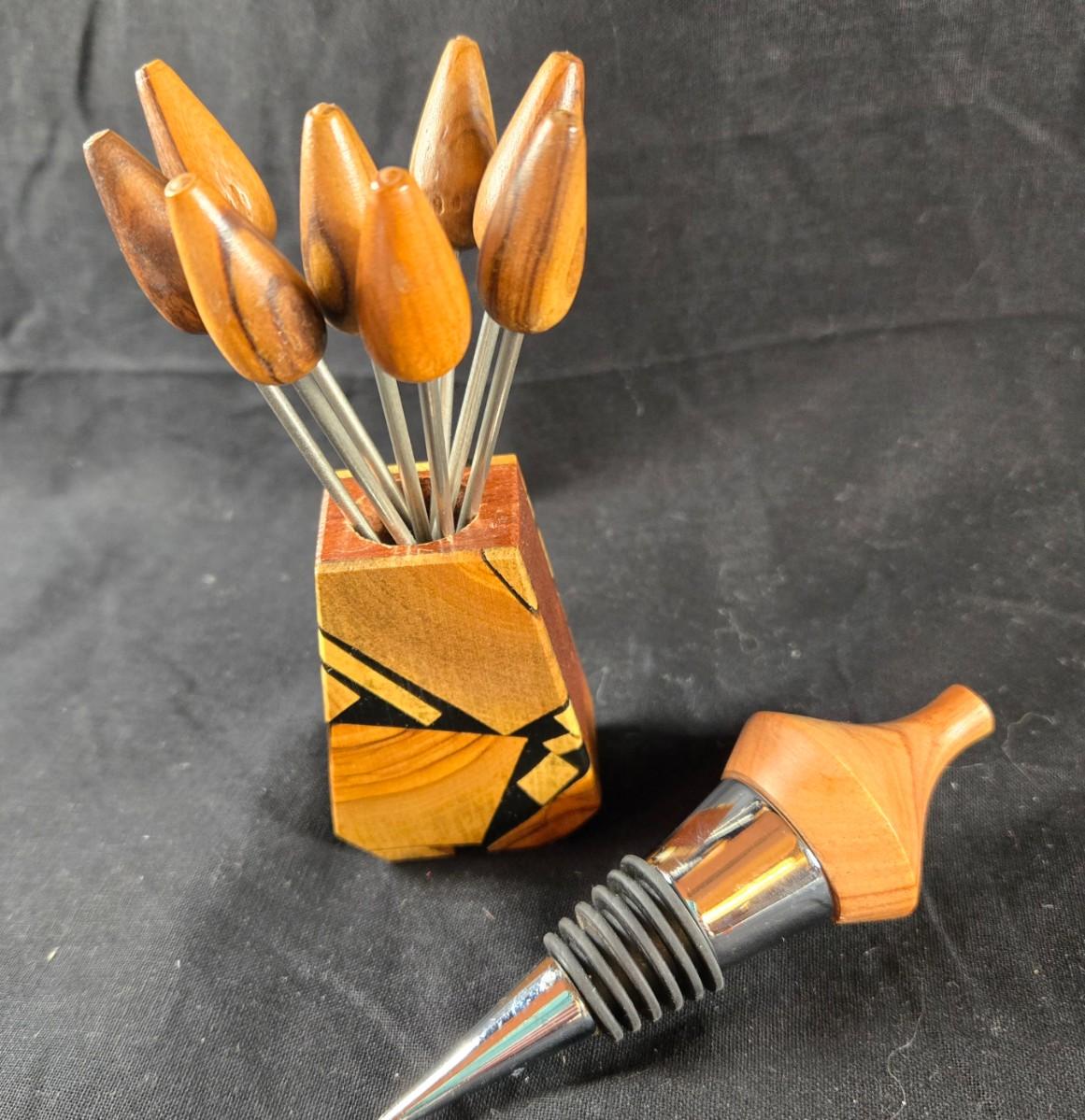 This auction lot is for a grouping of Wooden Party Items. The offering includes 8 Handmade vintage appetizer picks in a signed pick holder and a beautiful turned top wine stopper. Both appear unused.