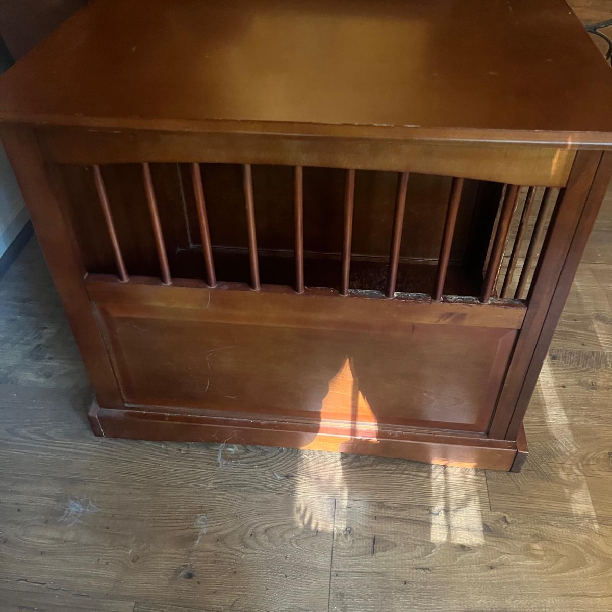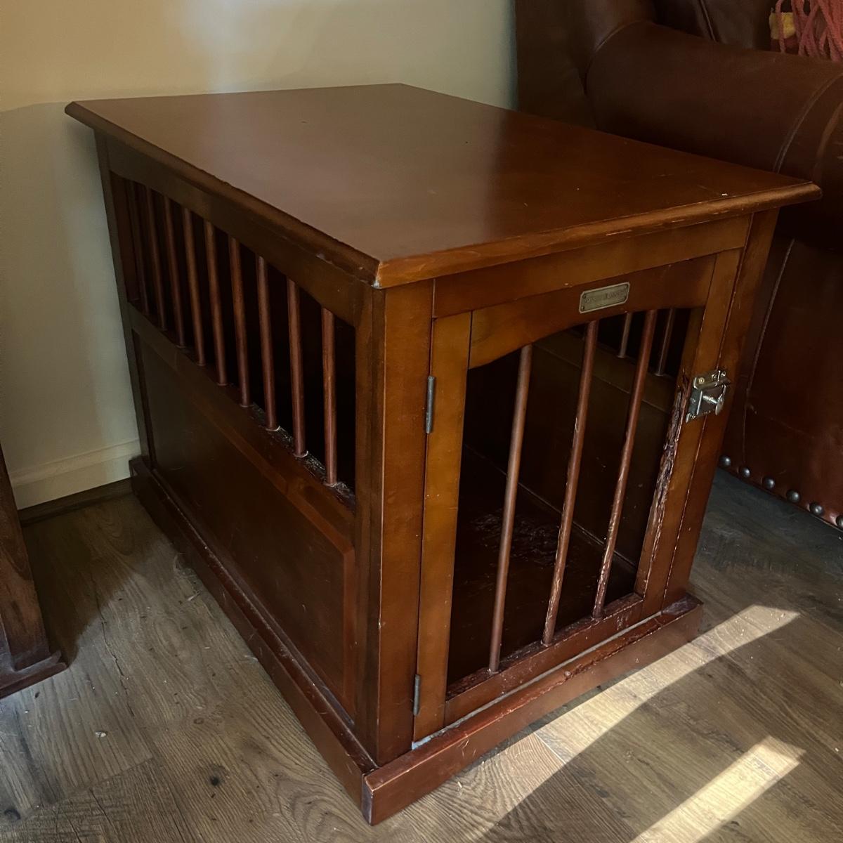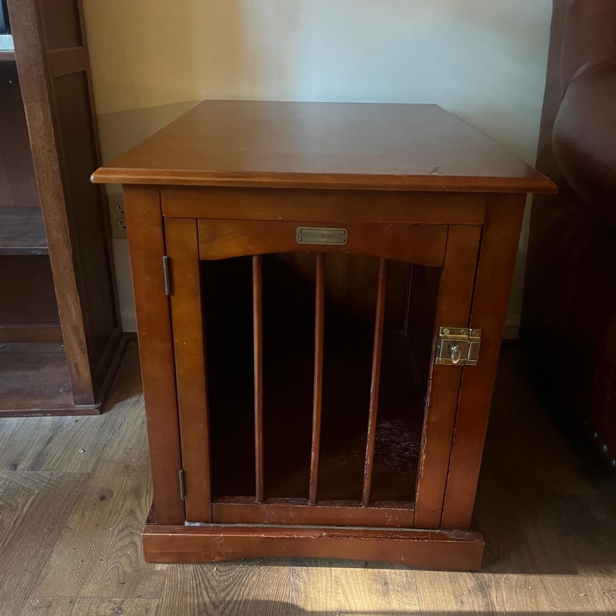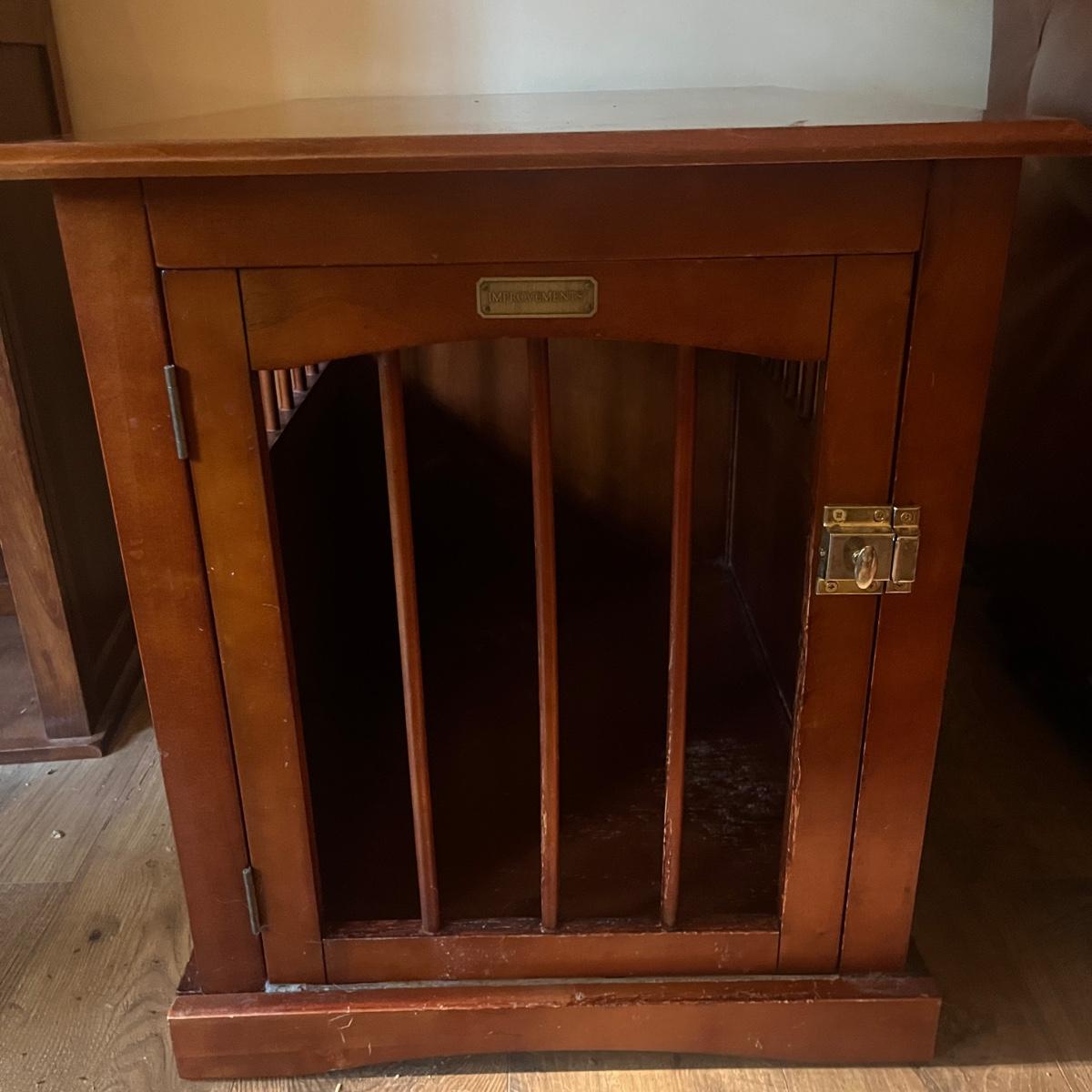 This wooden end table/pet cage that measures 21” x 30” x 24.5”H. has a few scratches and nicks with some pet hair inside. Brand name label reads "Improvements".