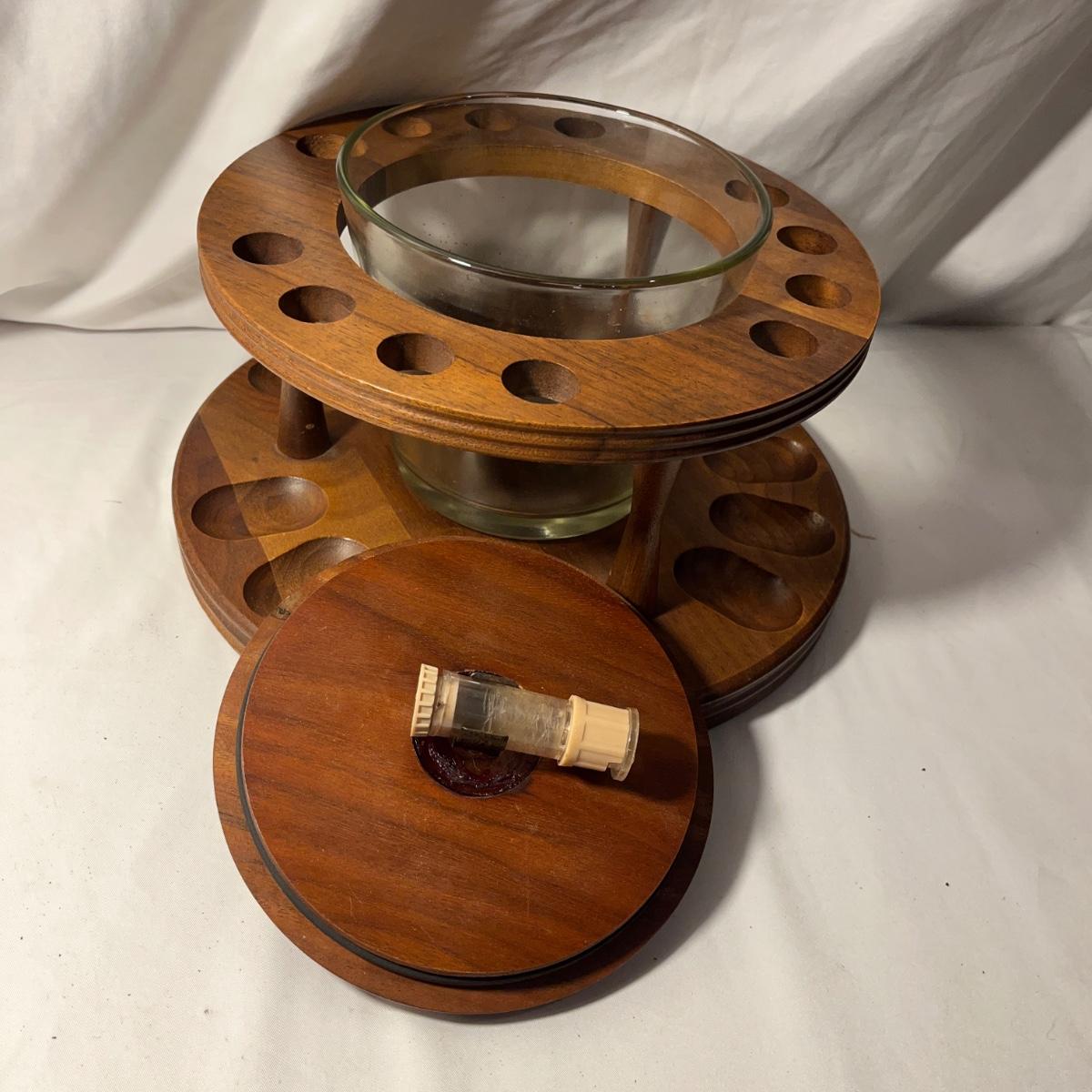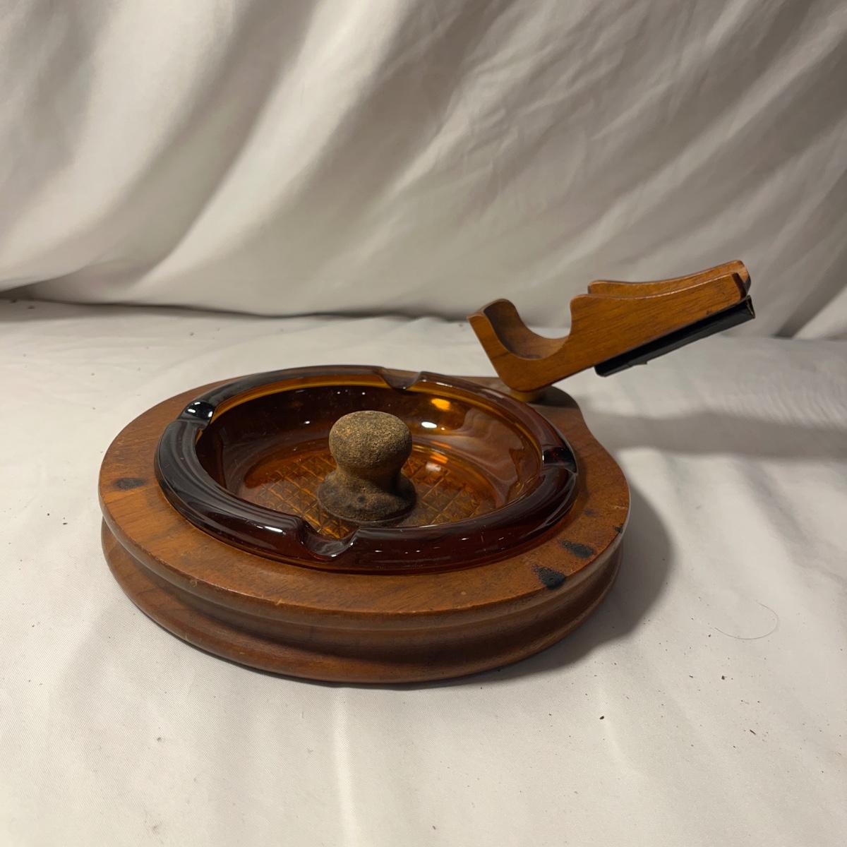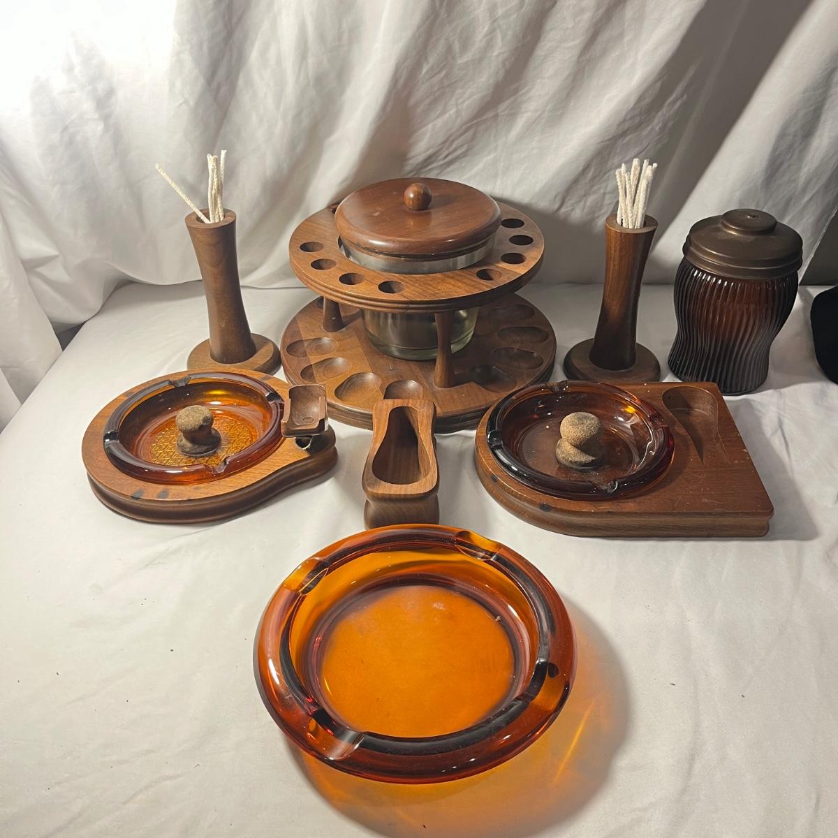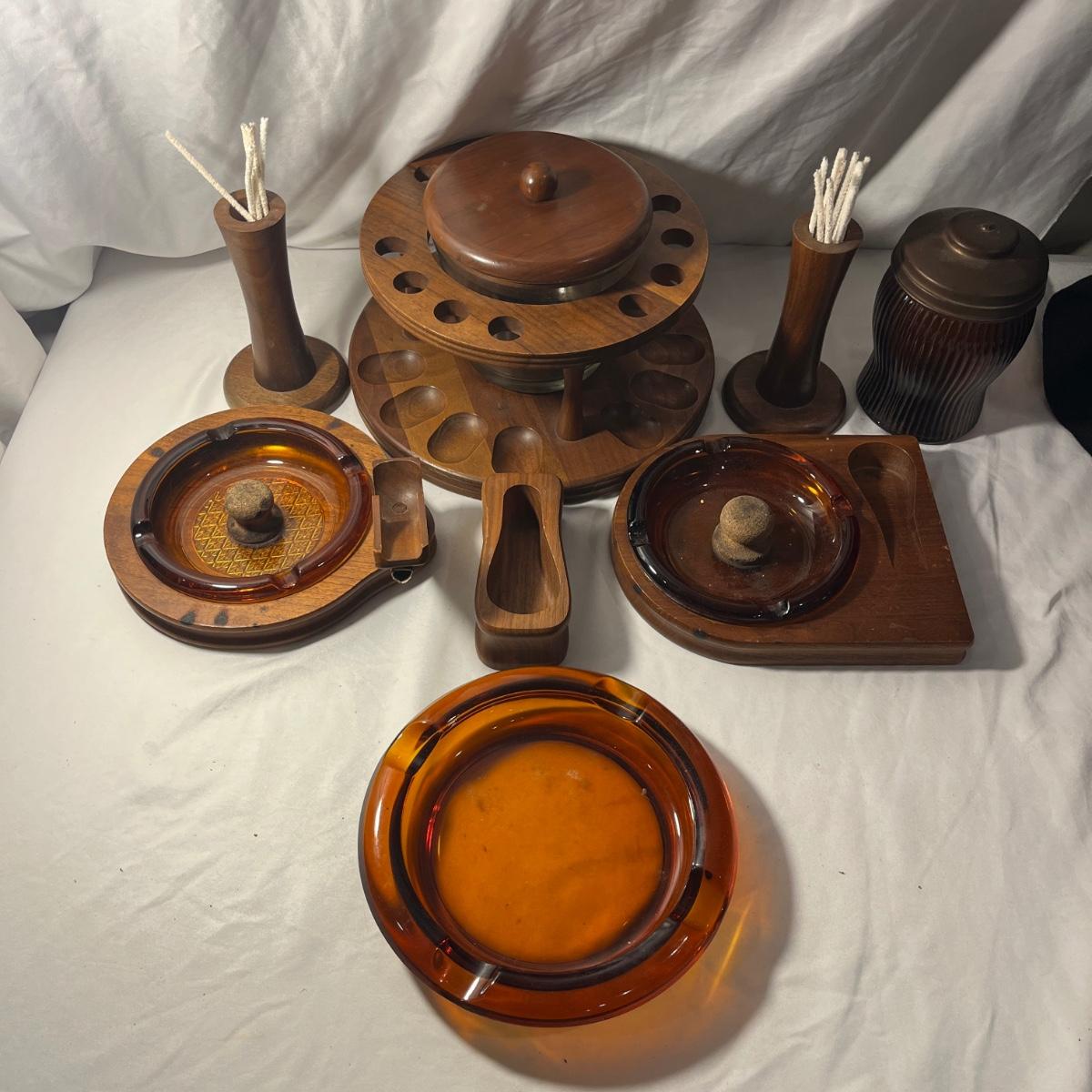 Lot includes a wooden pipe holder with glass jar, two wooden ashtray holders with built in pipe holders with ashtray, two wooden pipe cleaner holder, wooden pipe holder and more. Pipe rack measures 11”D x 7.5”H.