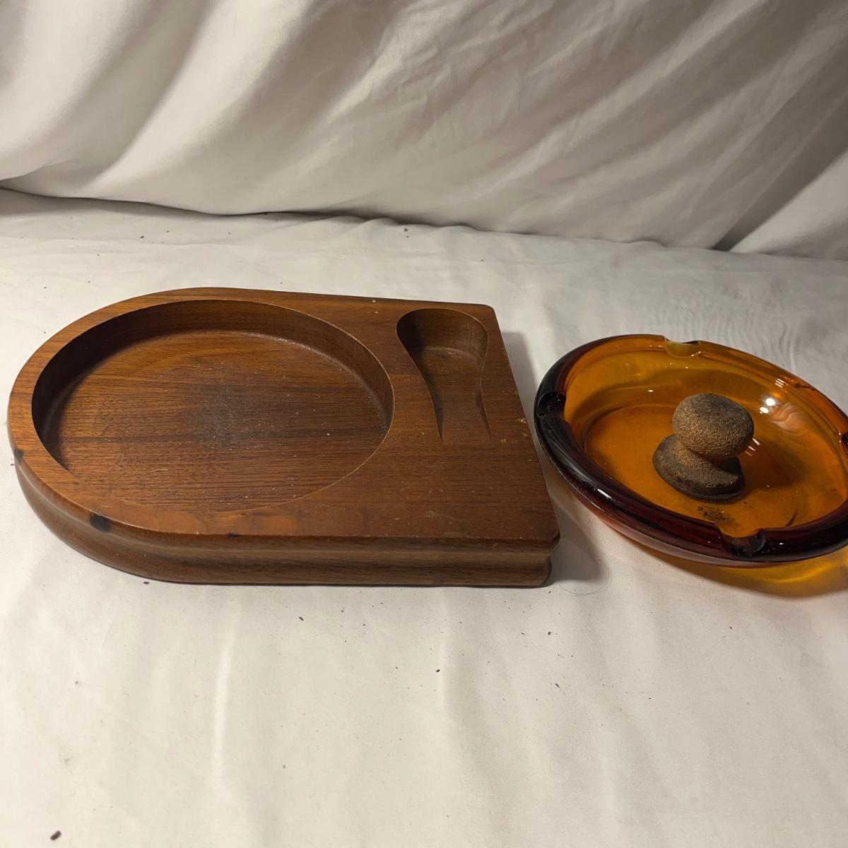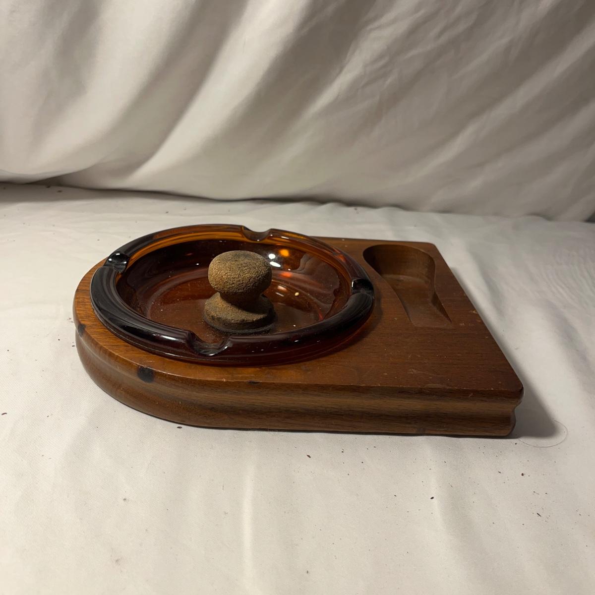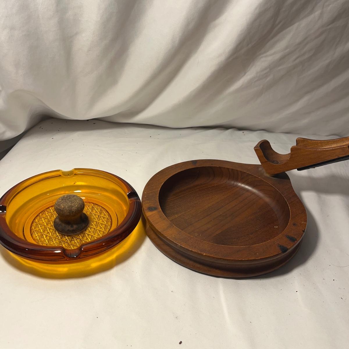 Lot includes a wooden pipe holder with glass jar, two wooden ashtray holders with built in pipe holders with ashtray, two wooden pipe cleaner holder, wooden pipe holder and more. Pipe rack measures 11”D x 7.5”H.