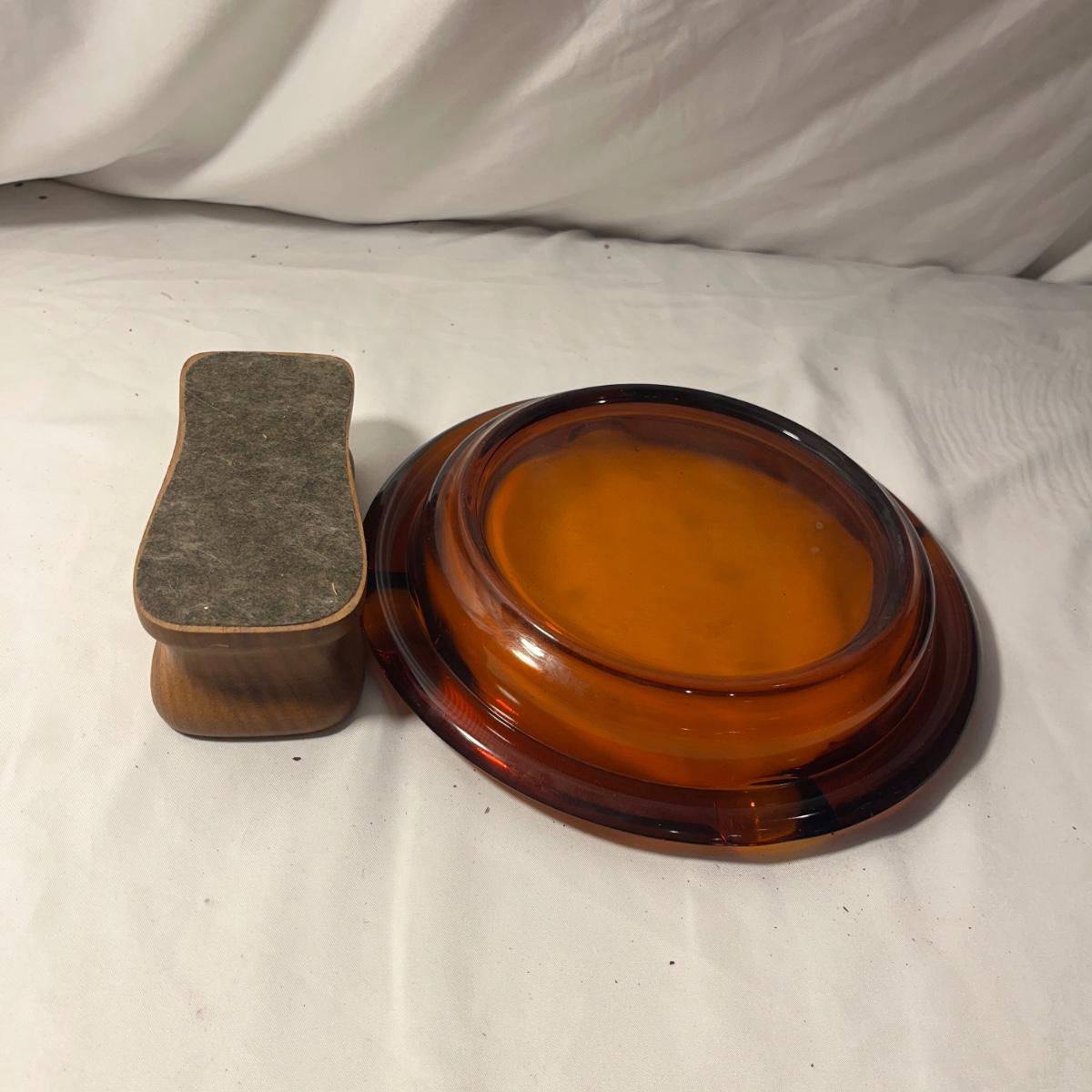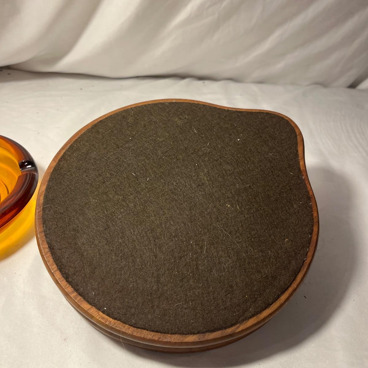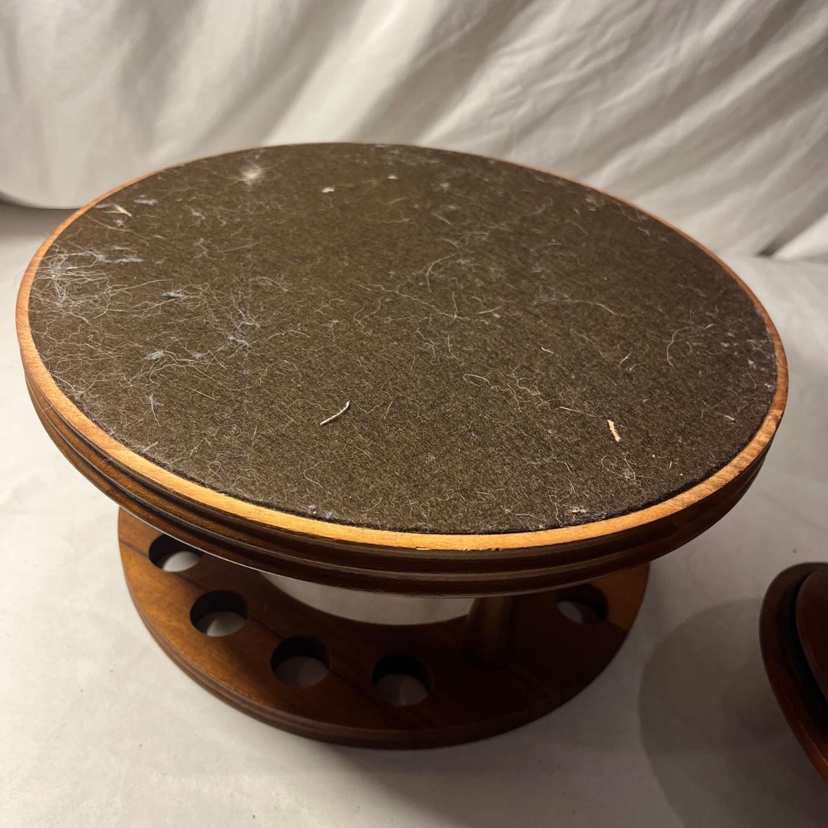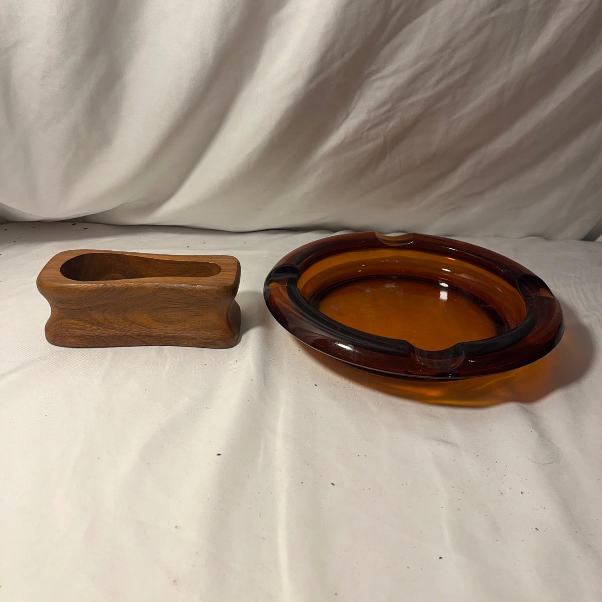 Lot includes a wooden pipe holder with glass jar, two wooden ashtray holders with built in pipe holders with ashtray, two wooden pipe cleaner holder, wooden pipe holder and more. Pipe rack measures 11”D x 7.5”H.