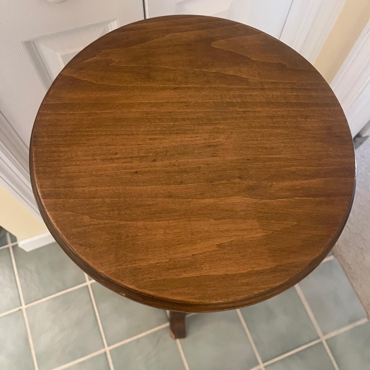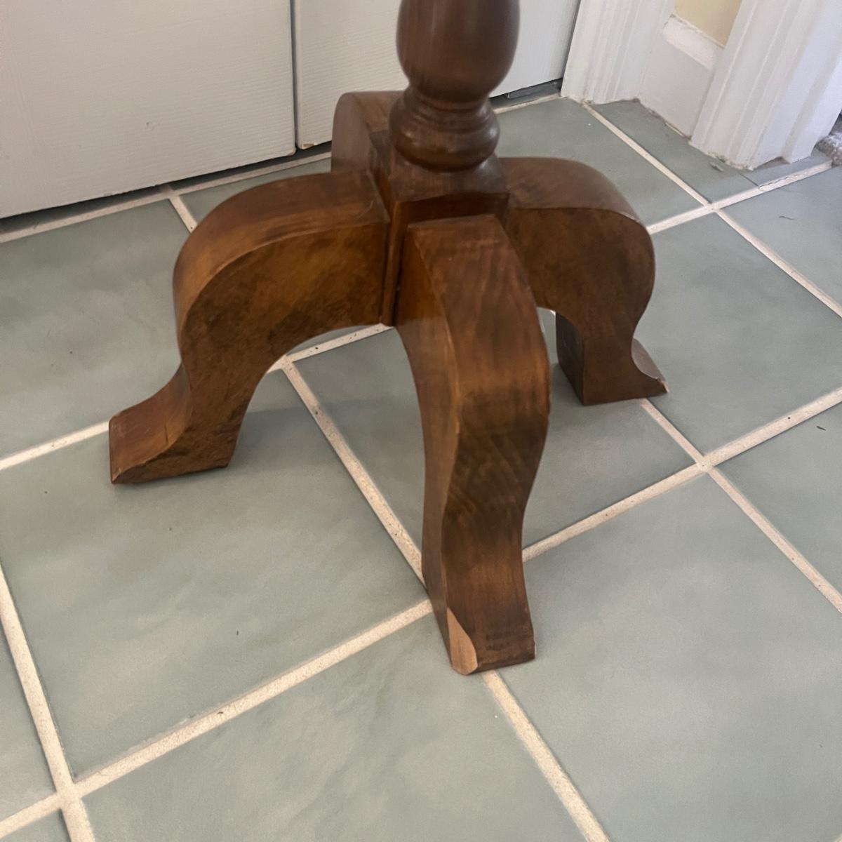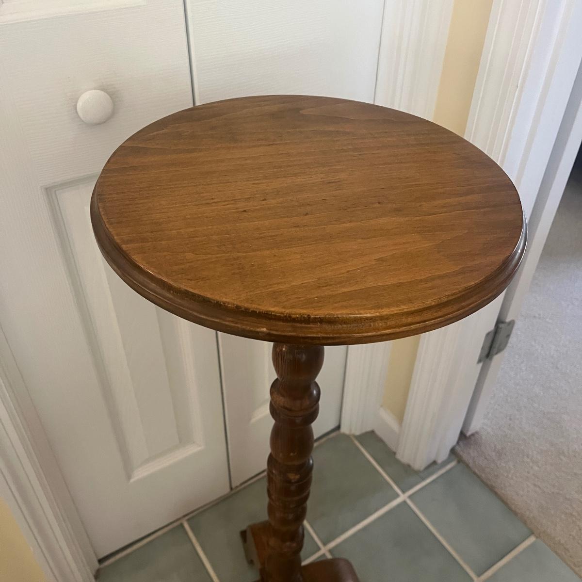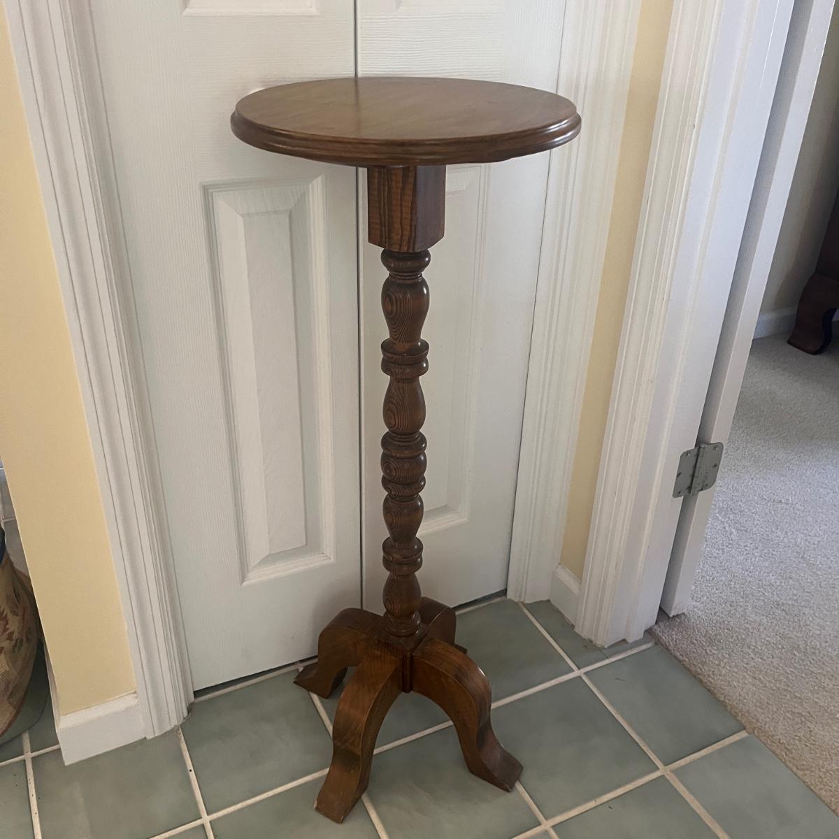Lot includes a solid wood plant stand with four feet. Stand measures 13”D x 36”H. One foot has chip, see pictures.