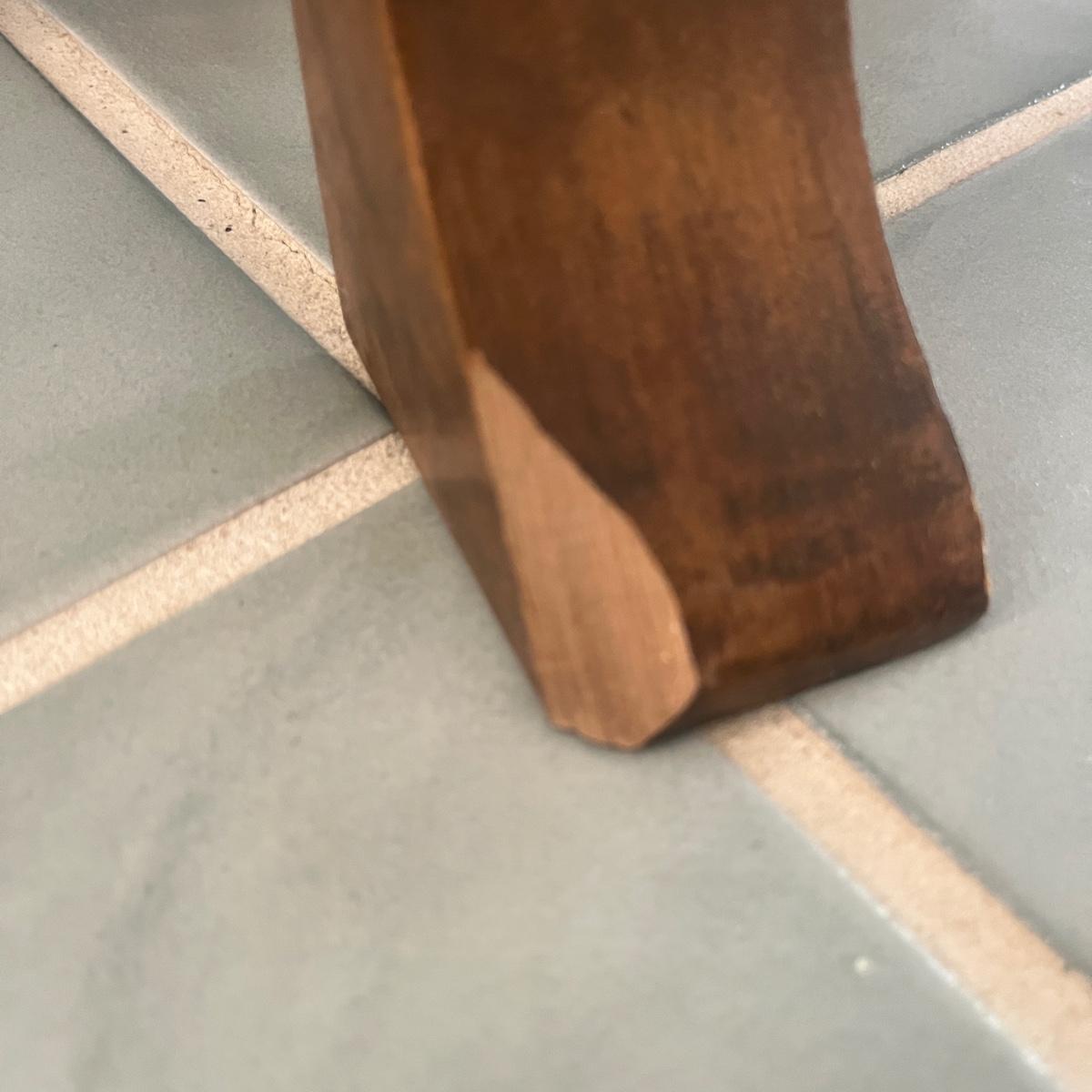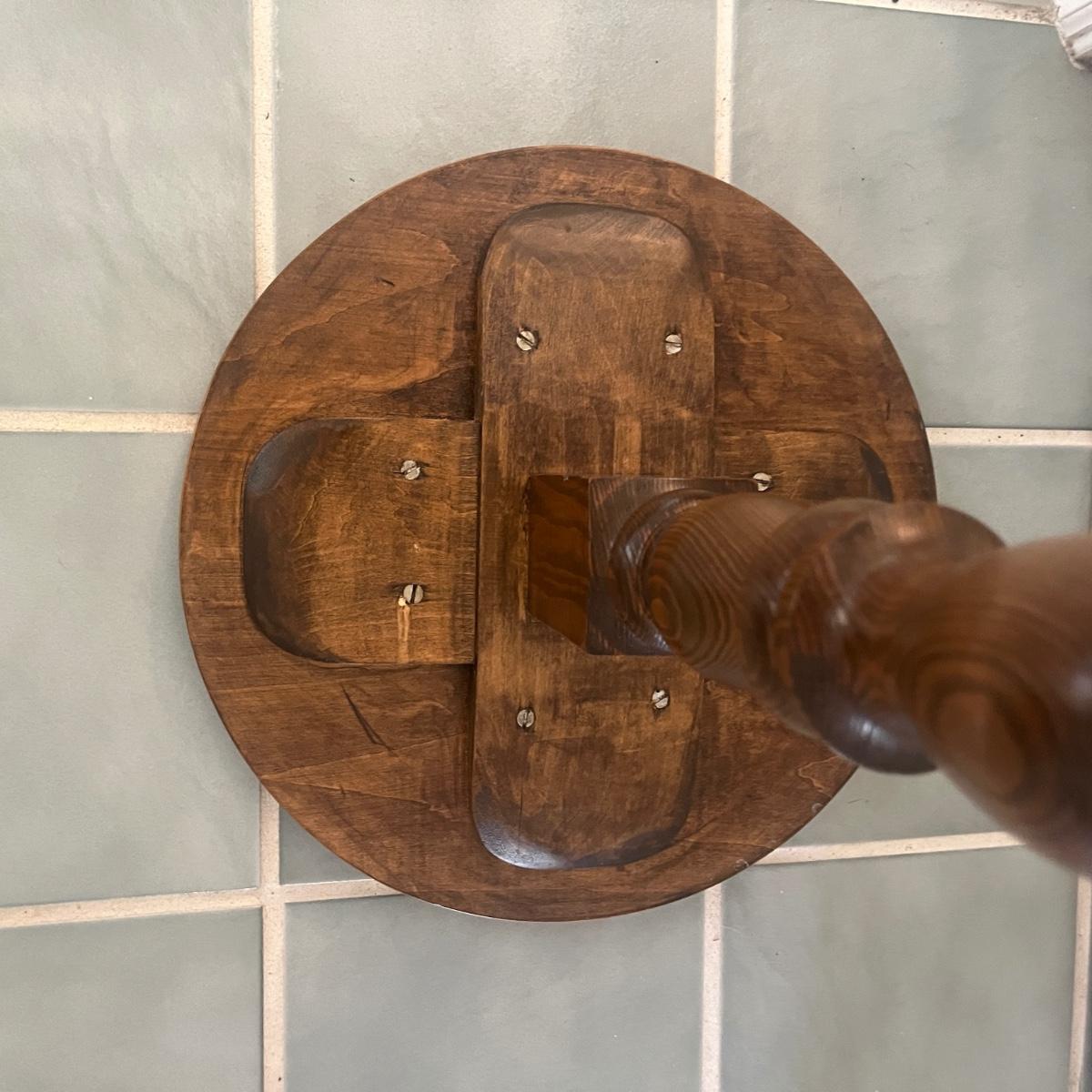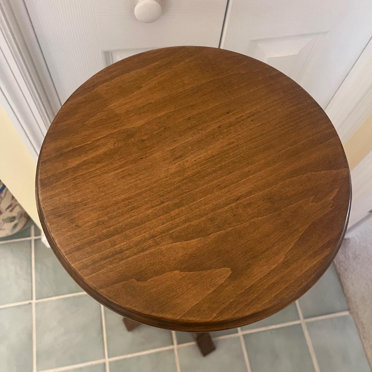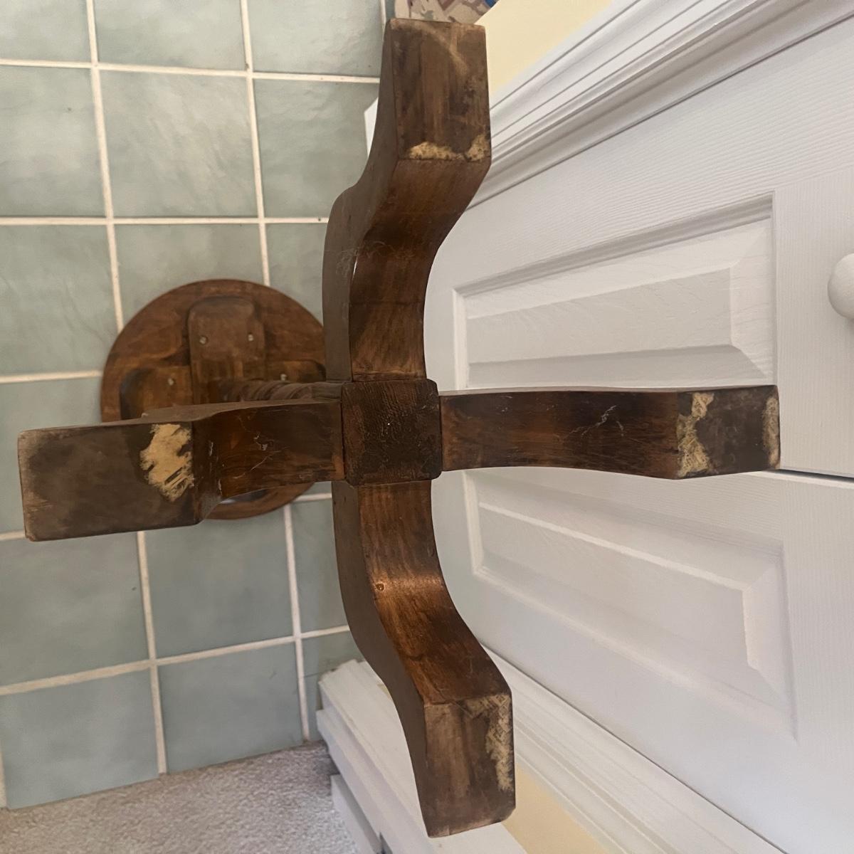 Lot includes a solid wood plant stand with four feet. Stand measures 13”D x 36”H. One foot has chip, see pictures.