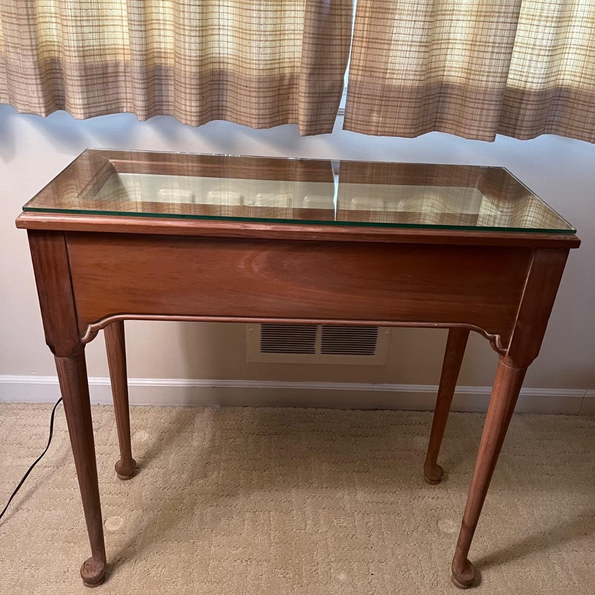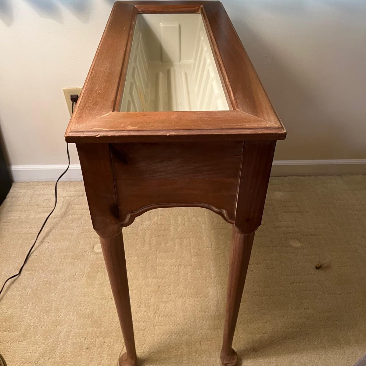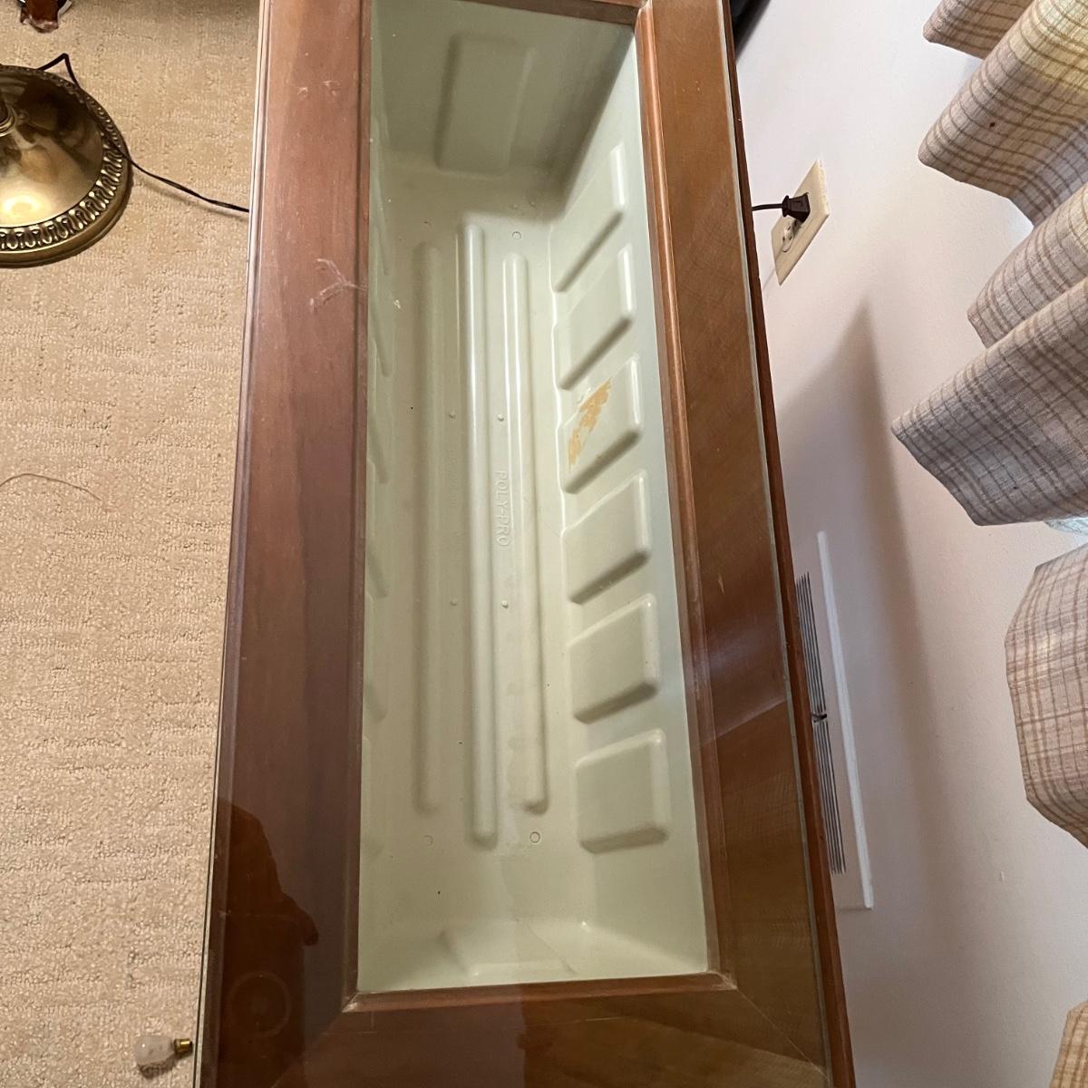 Lot includes a wooden planter with a glass top and plastic insert. It appears you can use it as a planter or a display case with the glass on. Planter measures 12” x 27.5” x 27”.