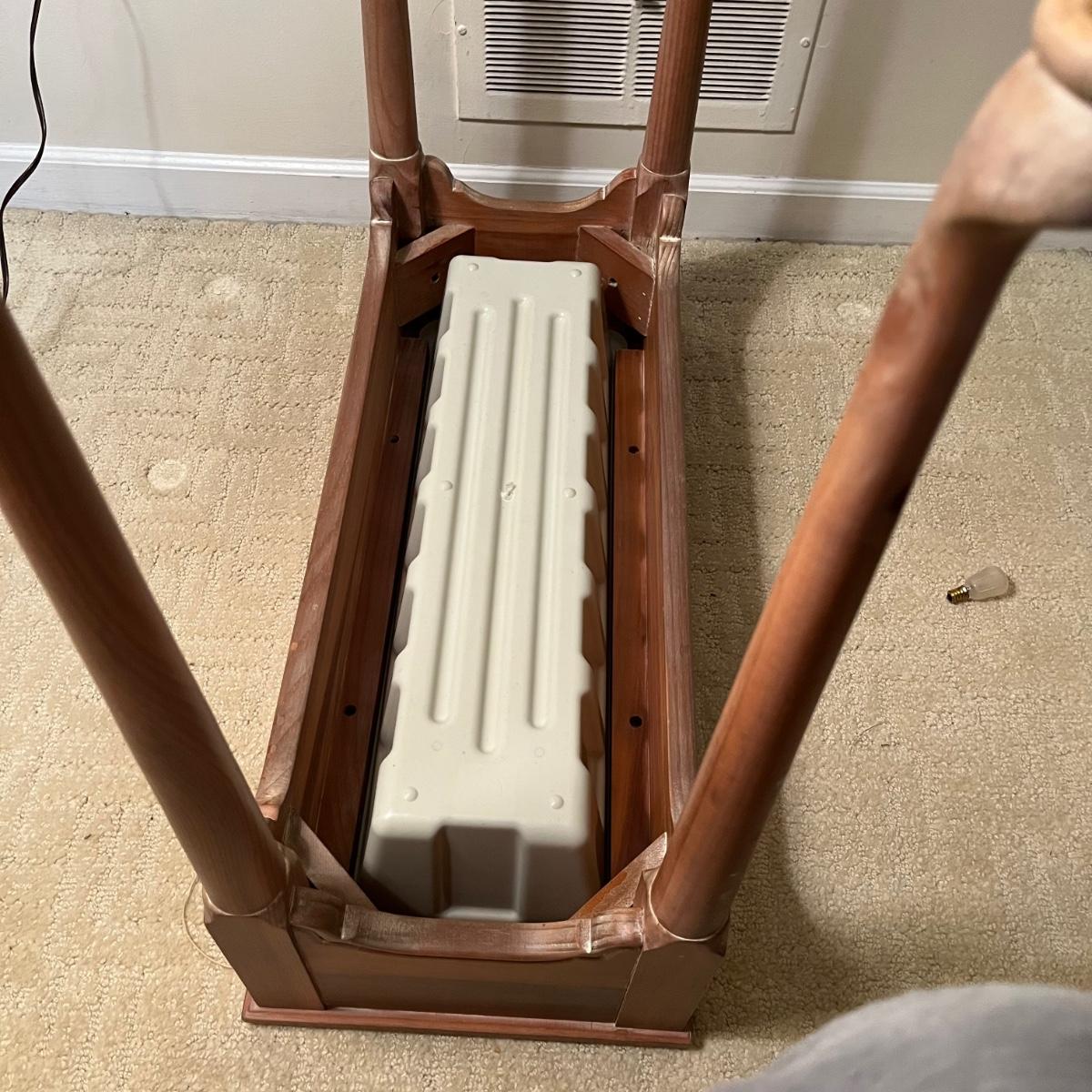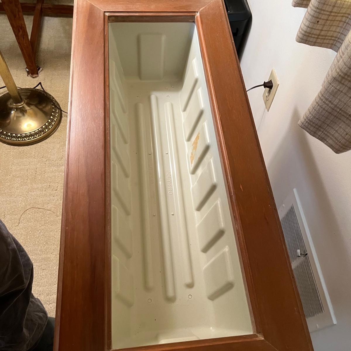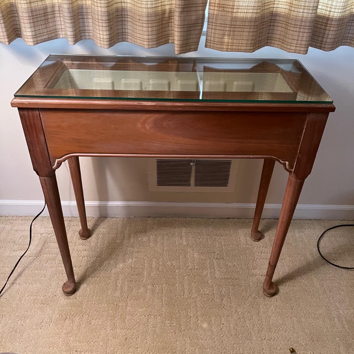 Lot includes a wooden planter with a glass top and plastic insert. It appears you can use it as a planter or a display case with the glass on. Planter measures 12” x 27.5” x 27”.