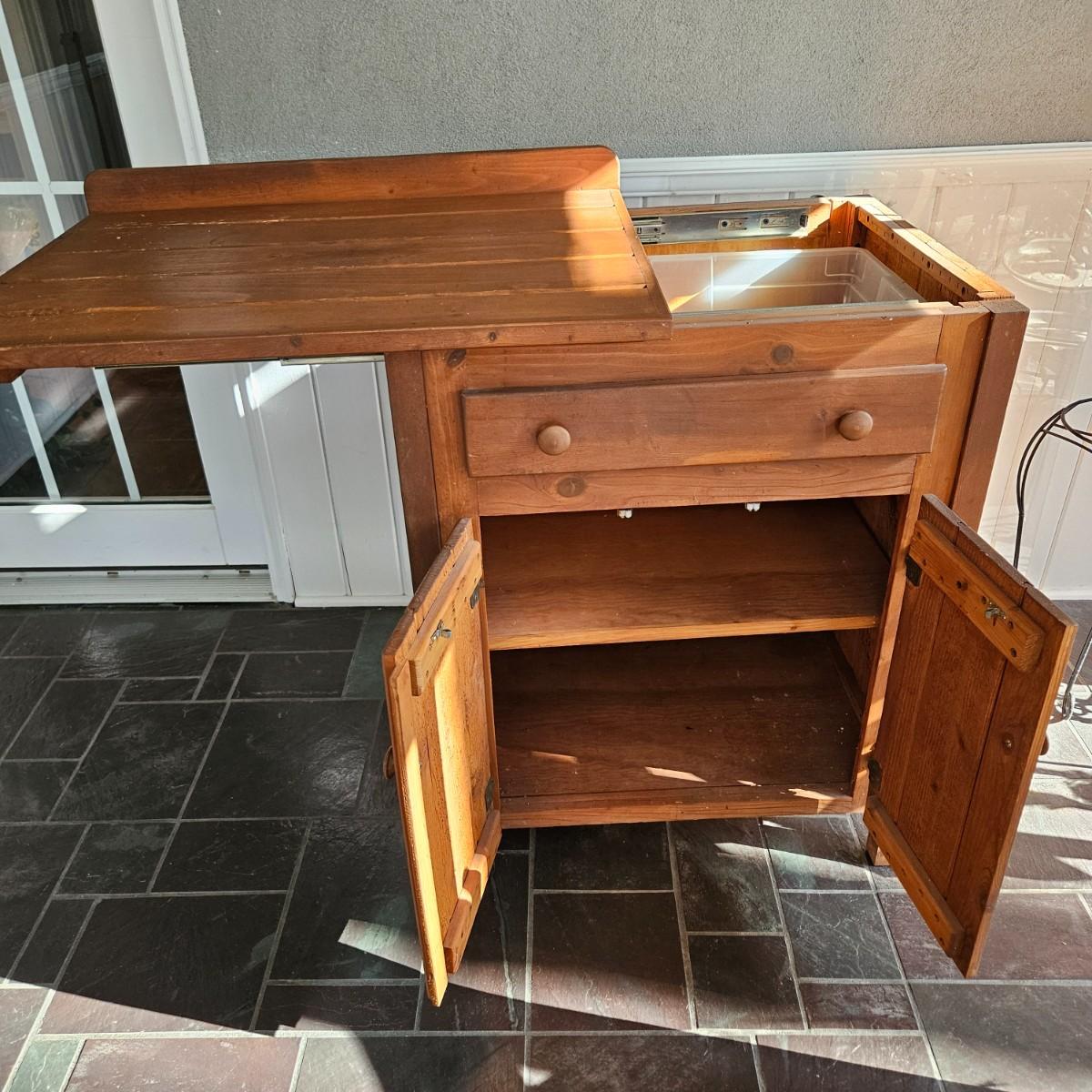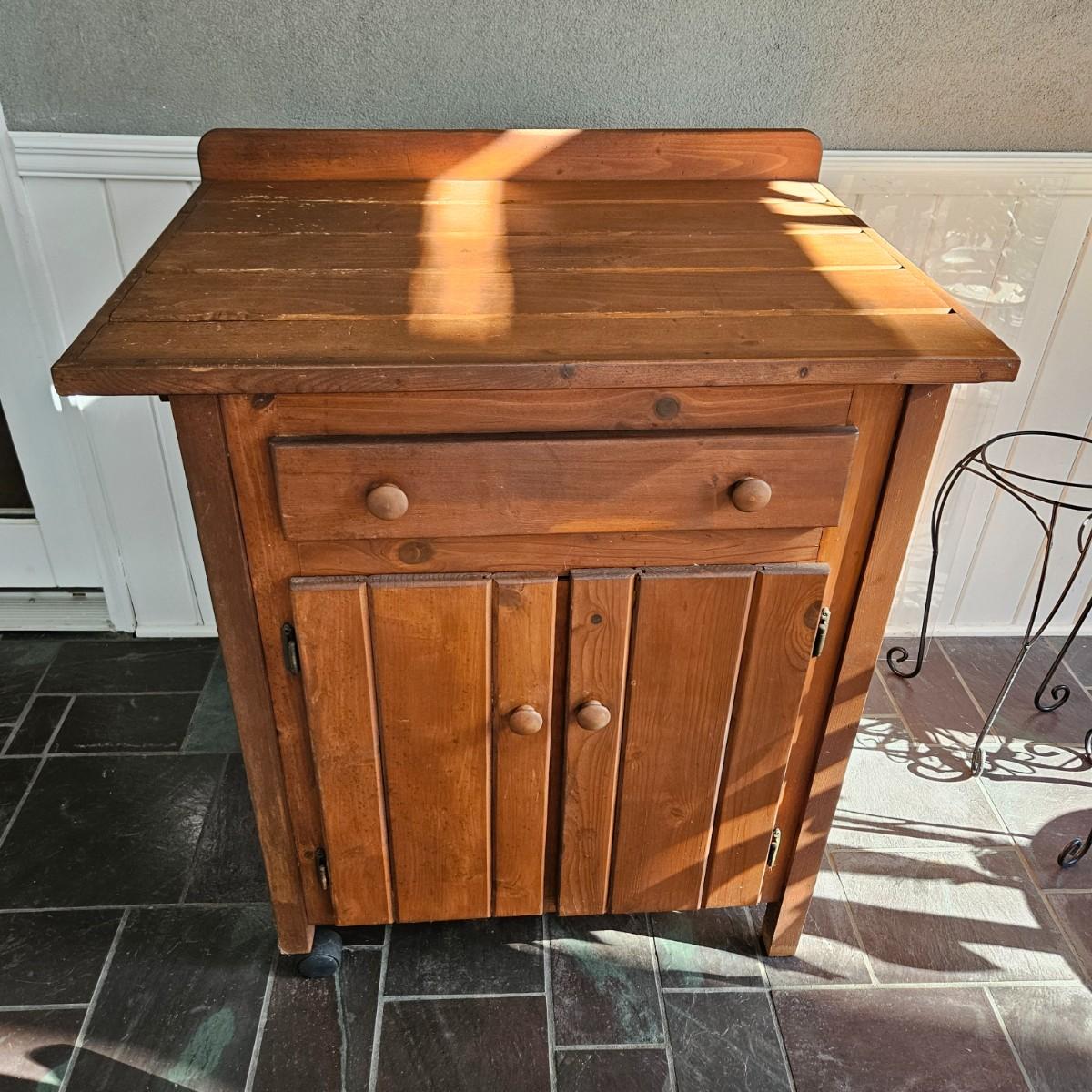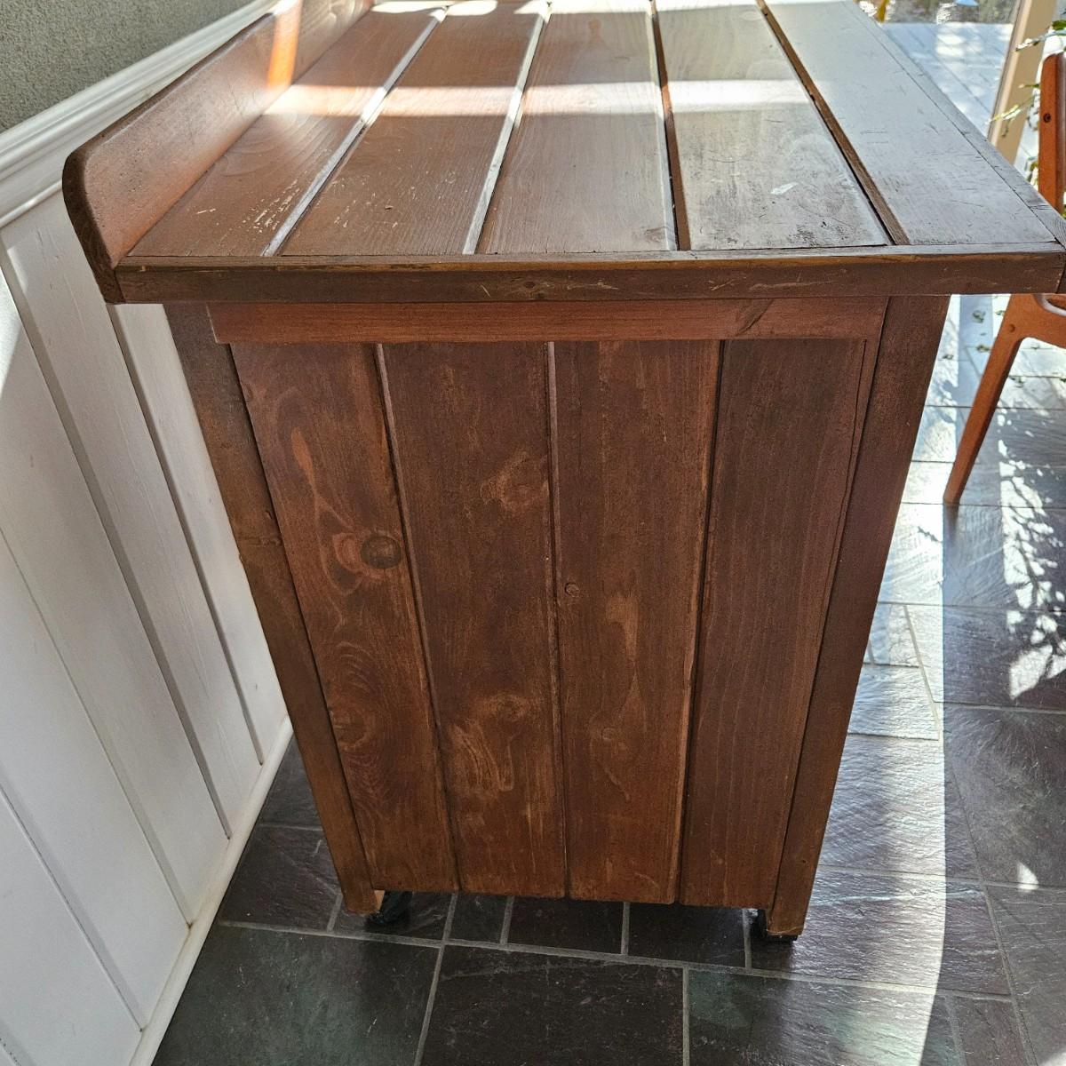 A wooden planting cabinet that has a sliding top, a two door cabinet for storage and casters. It measures approximately 32.5" x 23.5" x 39.5"H. Local pickup only. Winning bidder must bring assistance to help move and load this item due to its weight and/or size.