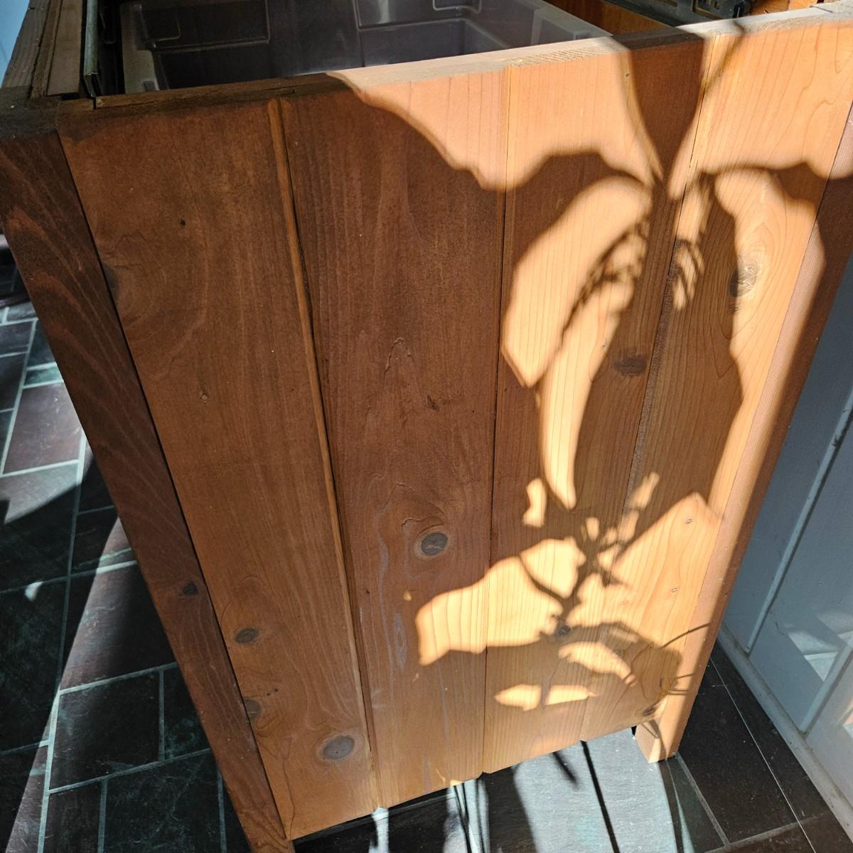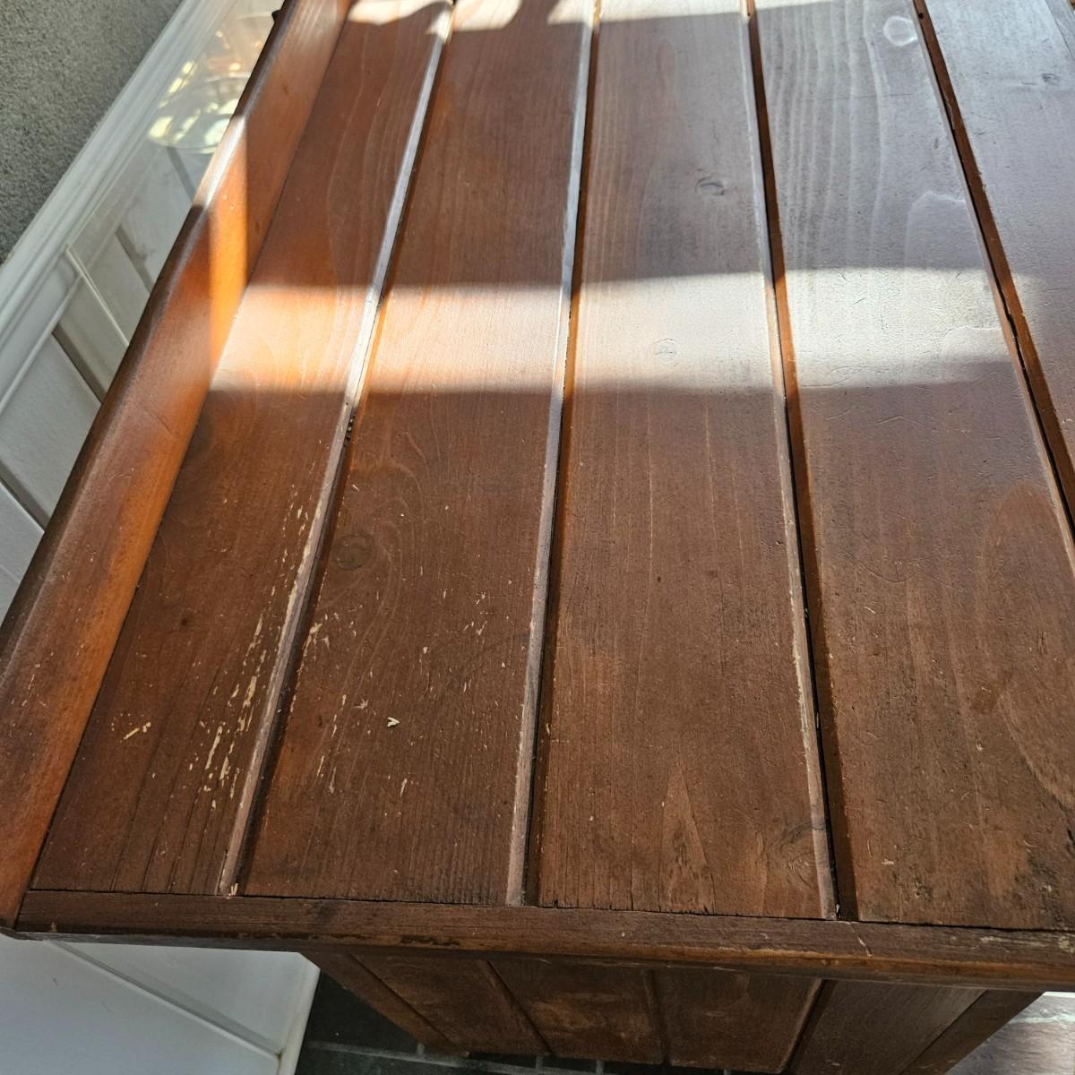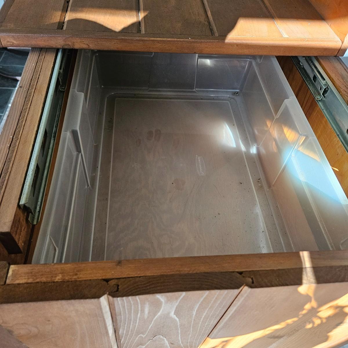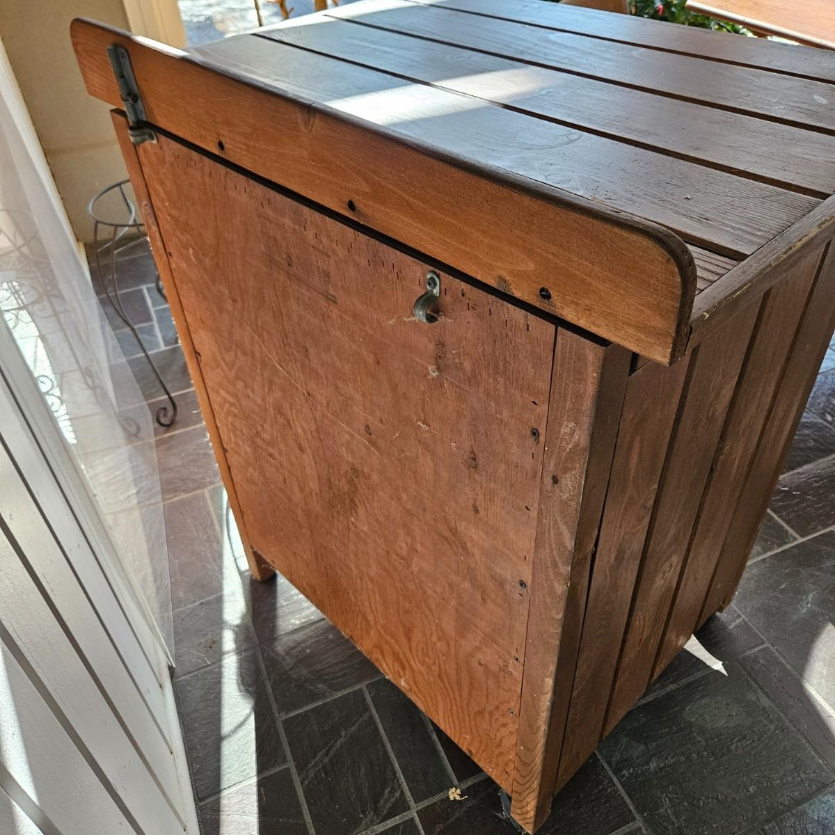 A wooden planting cabinet that has a sliding top, a two door cabinet for storage and casters. It measures approximately 32.5" x 23.5" x 39.5"H. Local pickup only. Winning bidder must bring assistance to help move and load this item due to its weight and/or size.