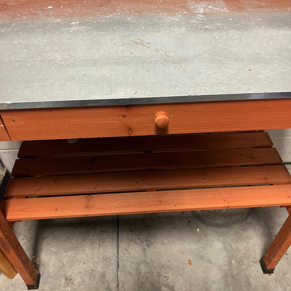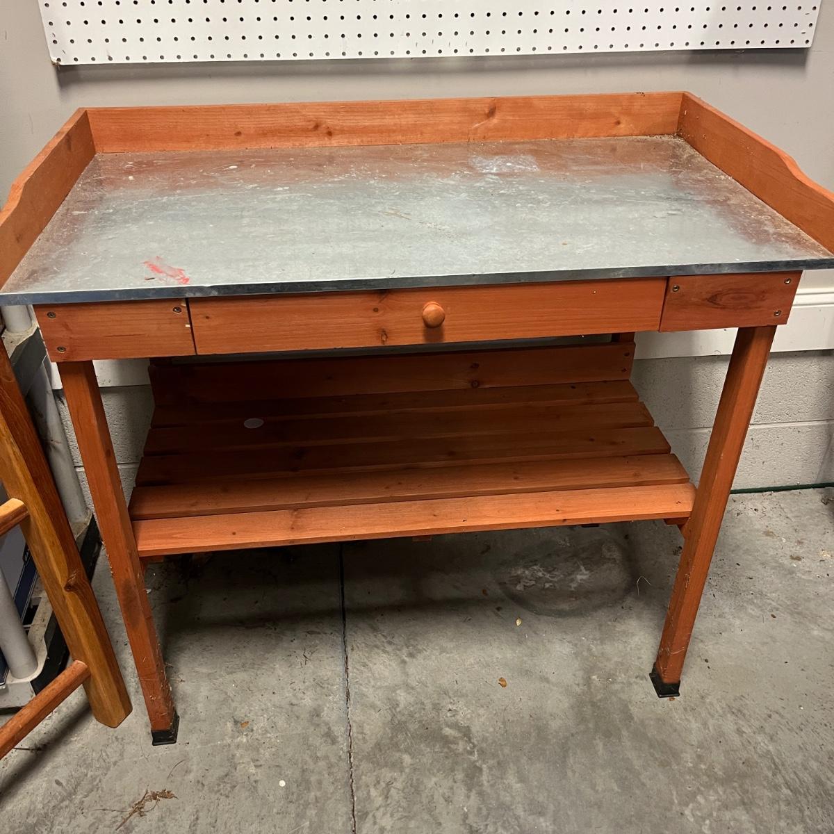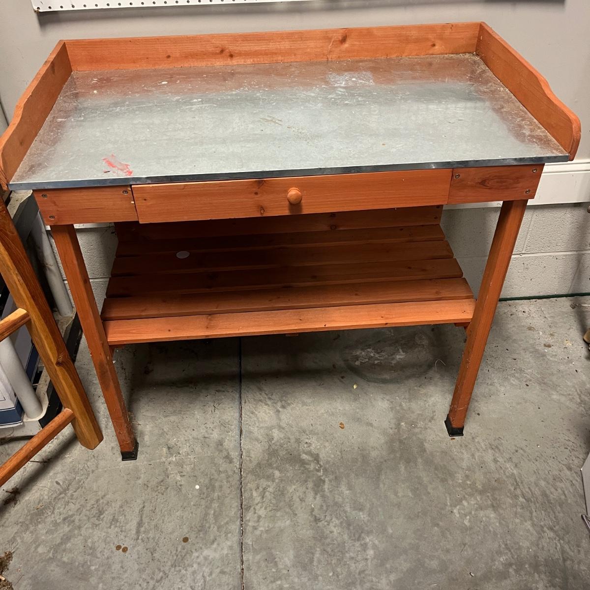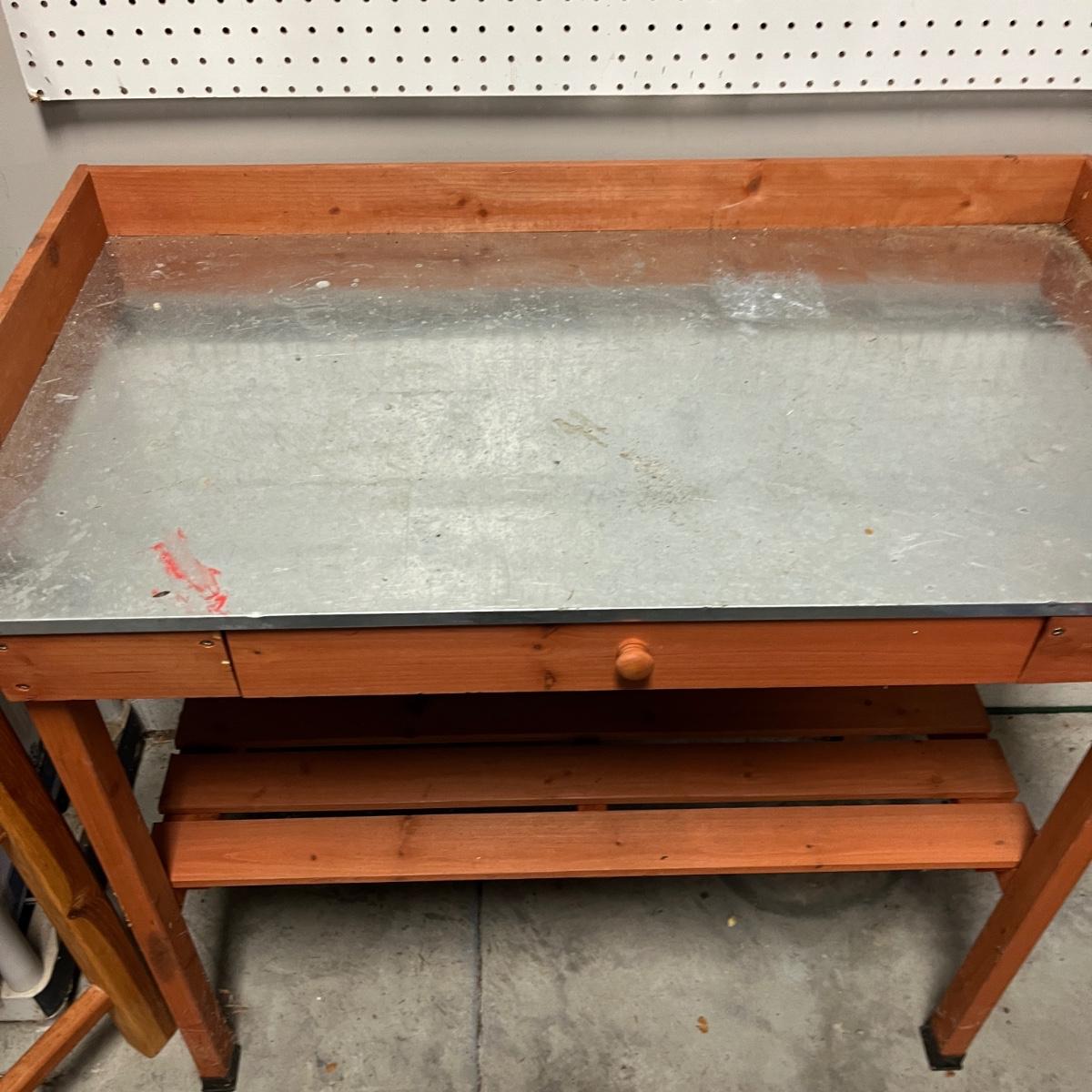 Lot includes a wooden potting bench with one drawer and shelf underneath and a metal covered top. Bench measures 39” x 23” x 36”H.