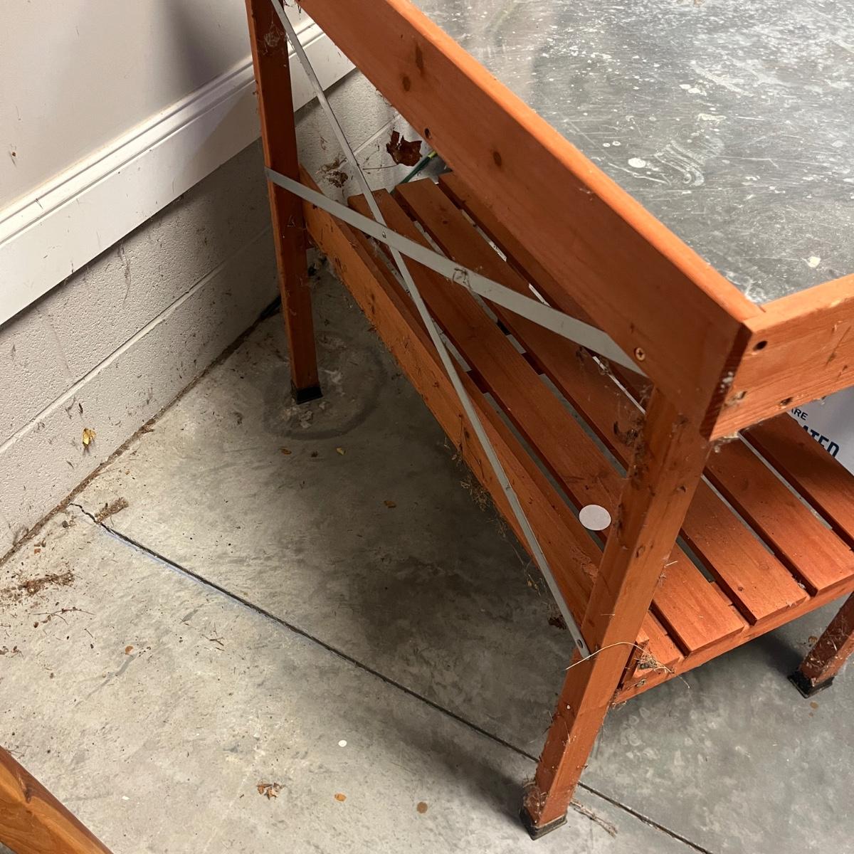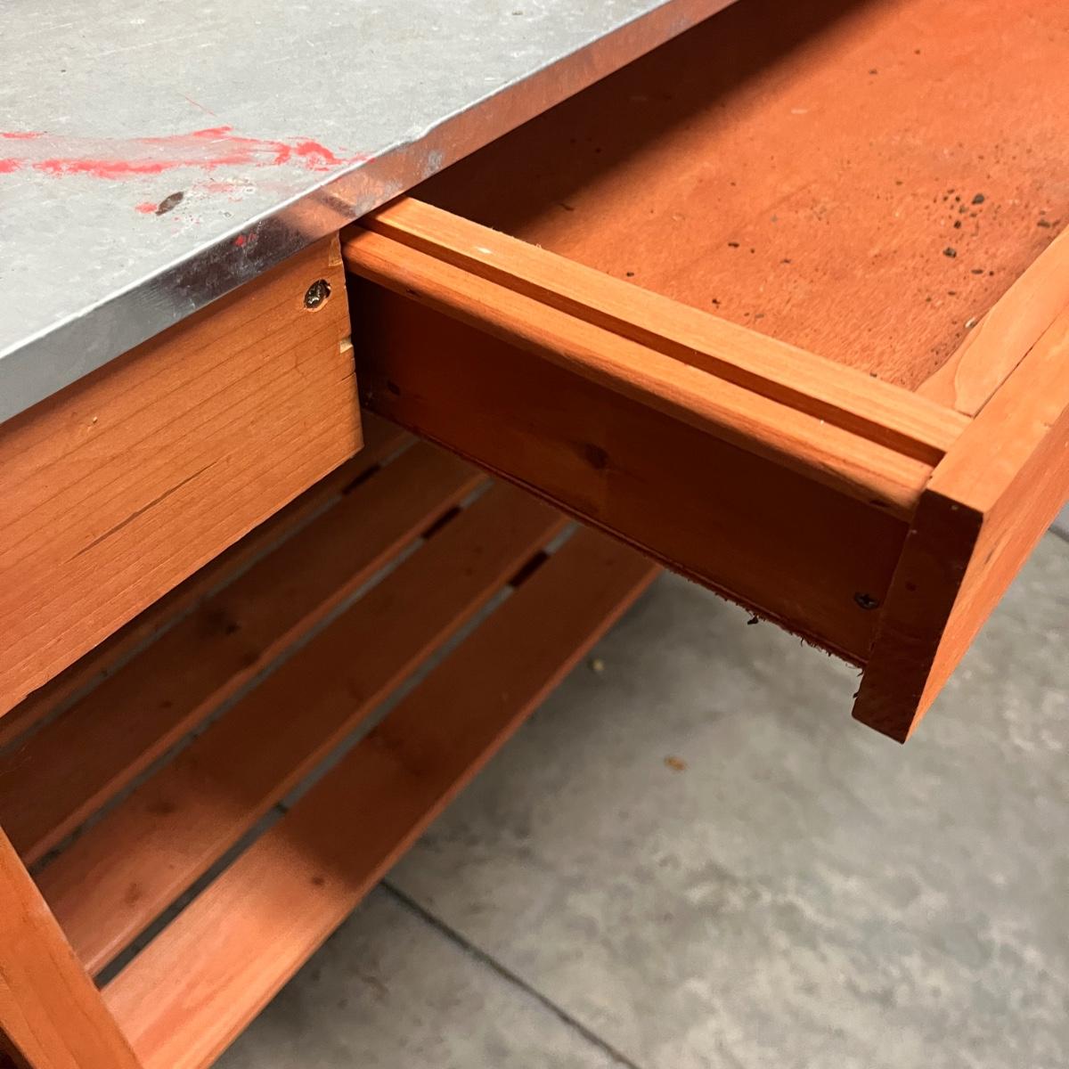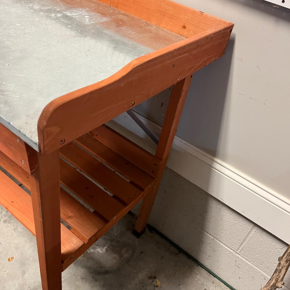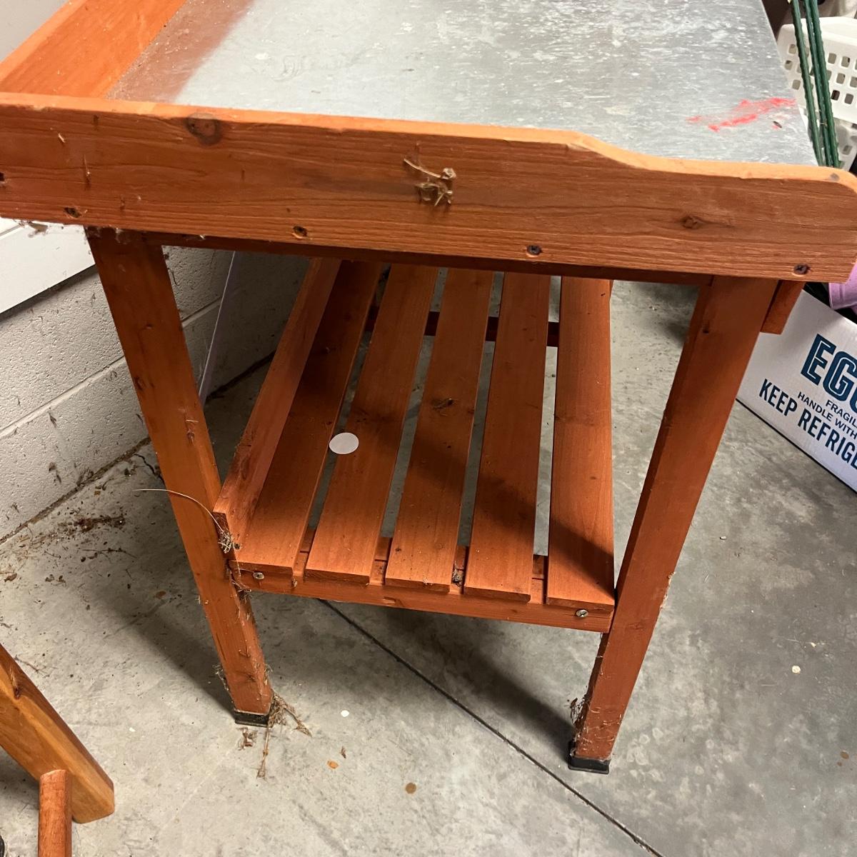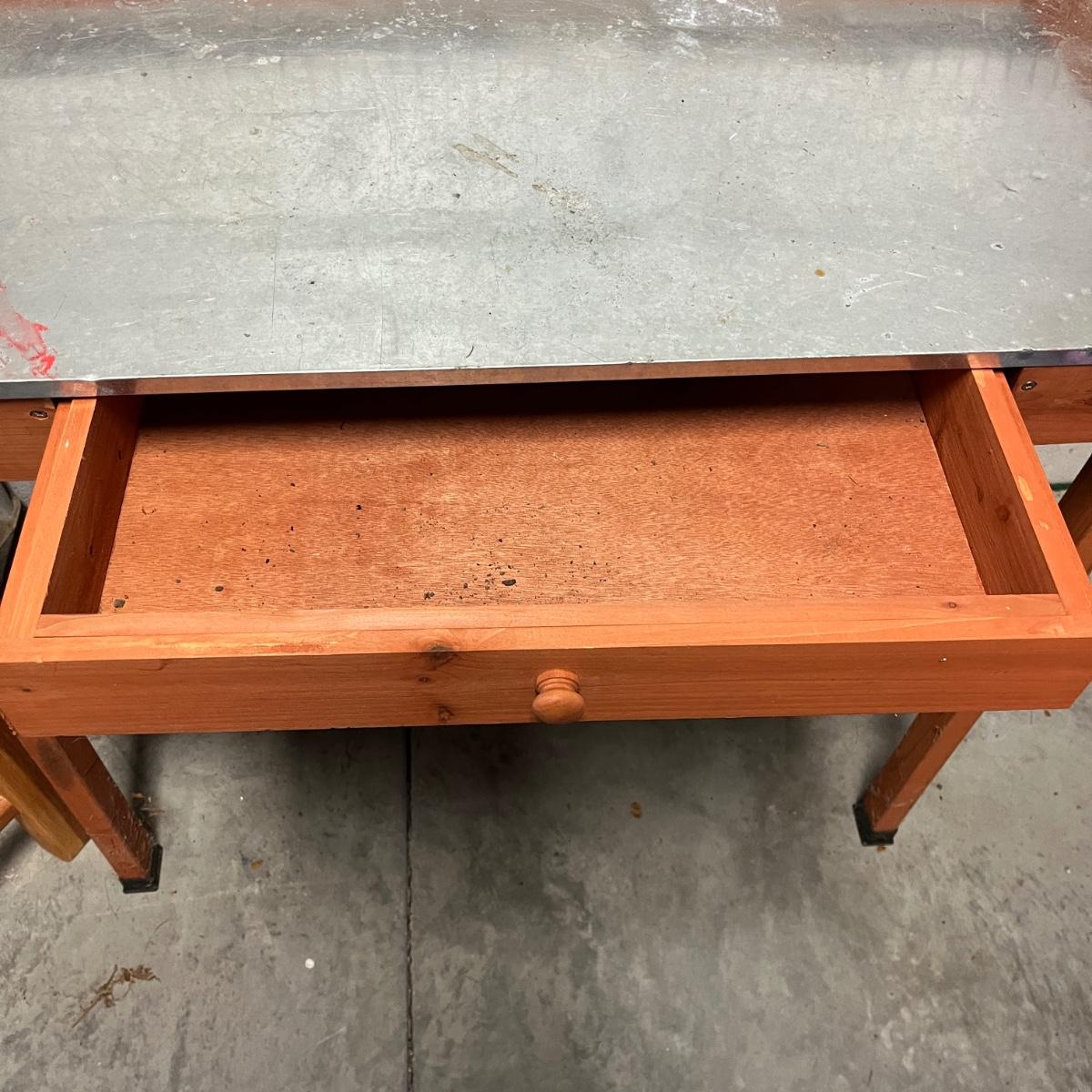 Lot includes a wooden potting bench with one drawer and shelf underneath and a metal covered top. Bench measures 39” x 23” x 36”H.