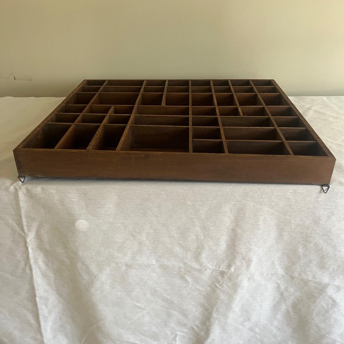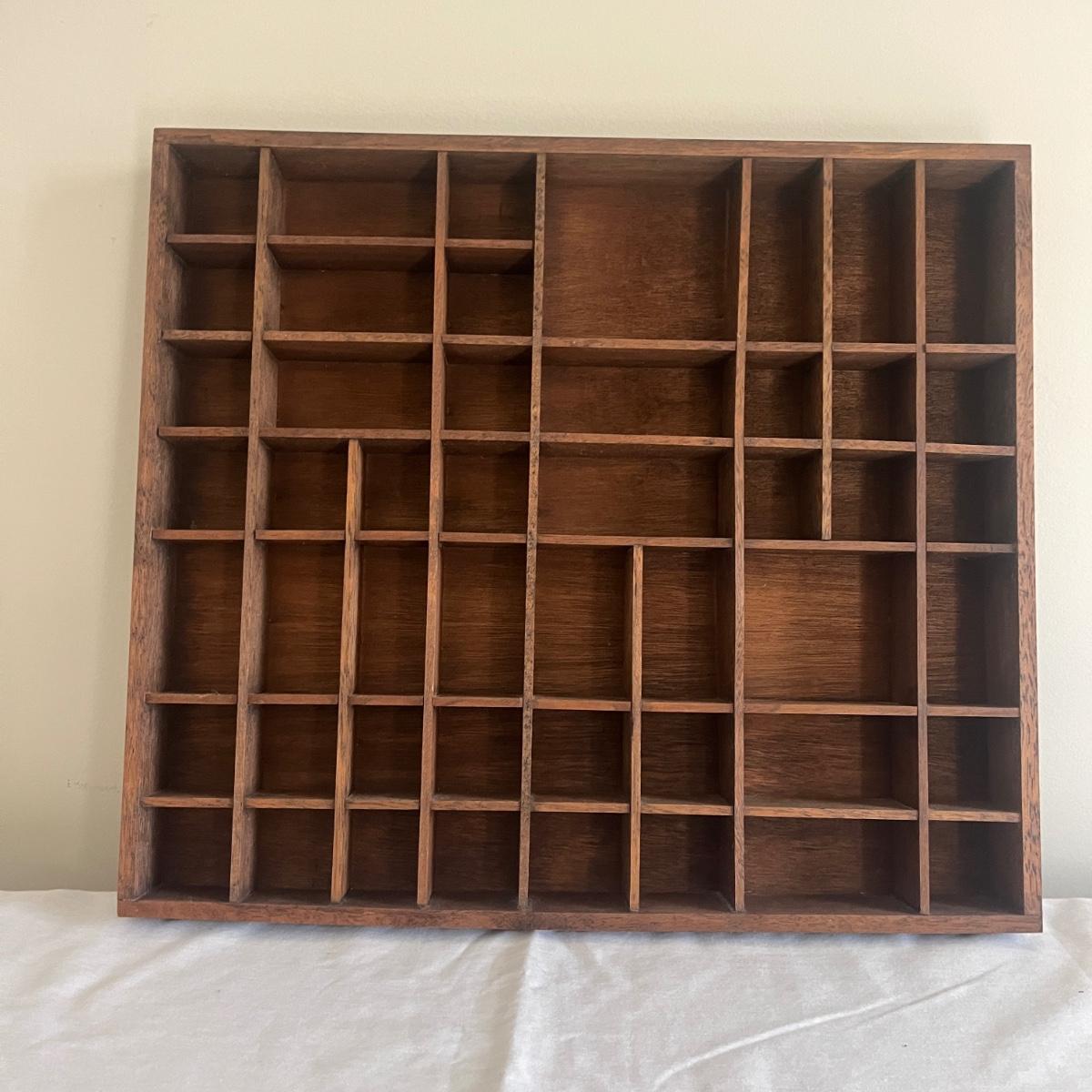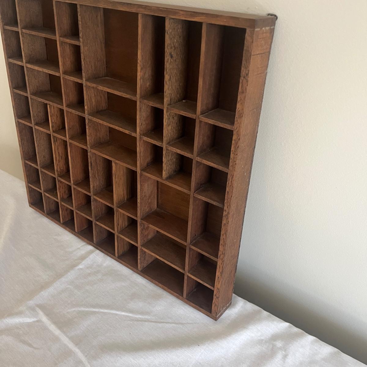 Lot includes a wooden printers tray with wall mounts. Piece measures 20.5” x 2” x 18”H.