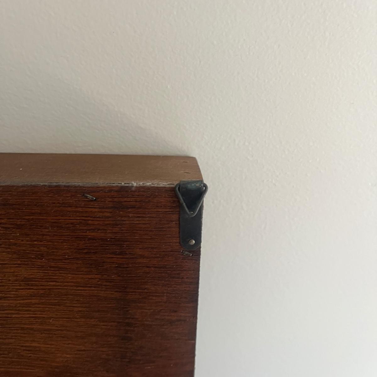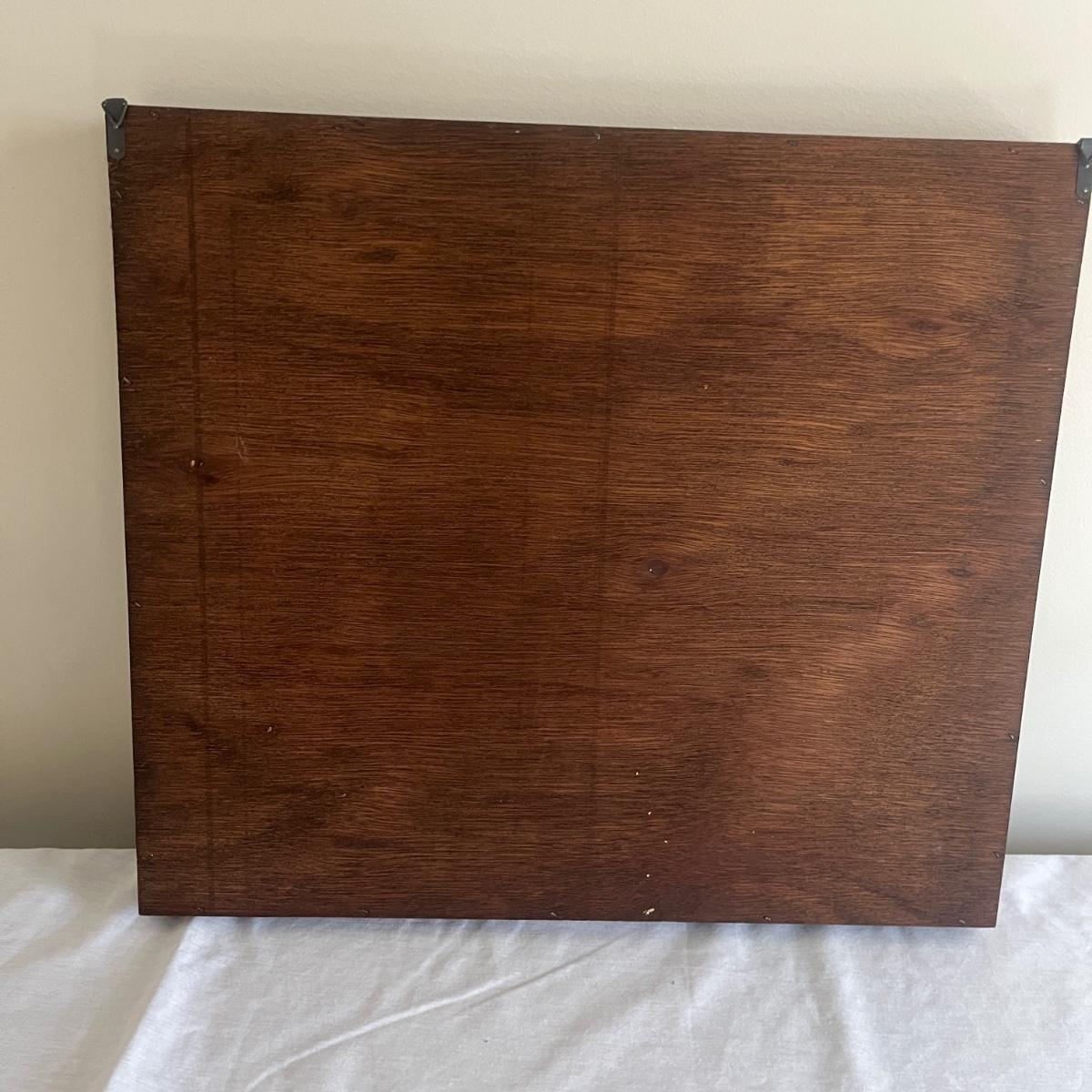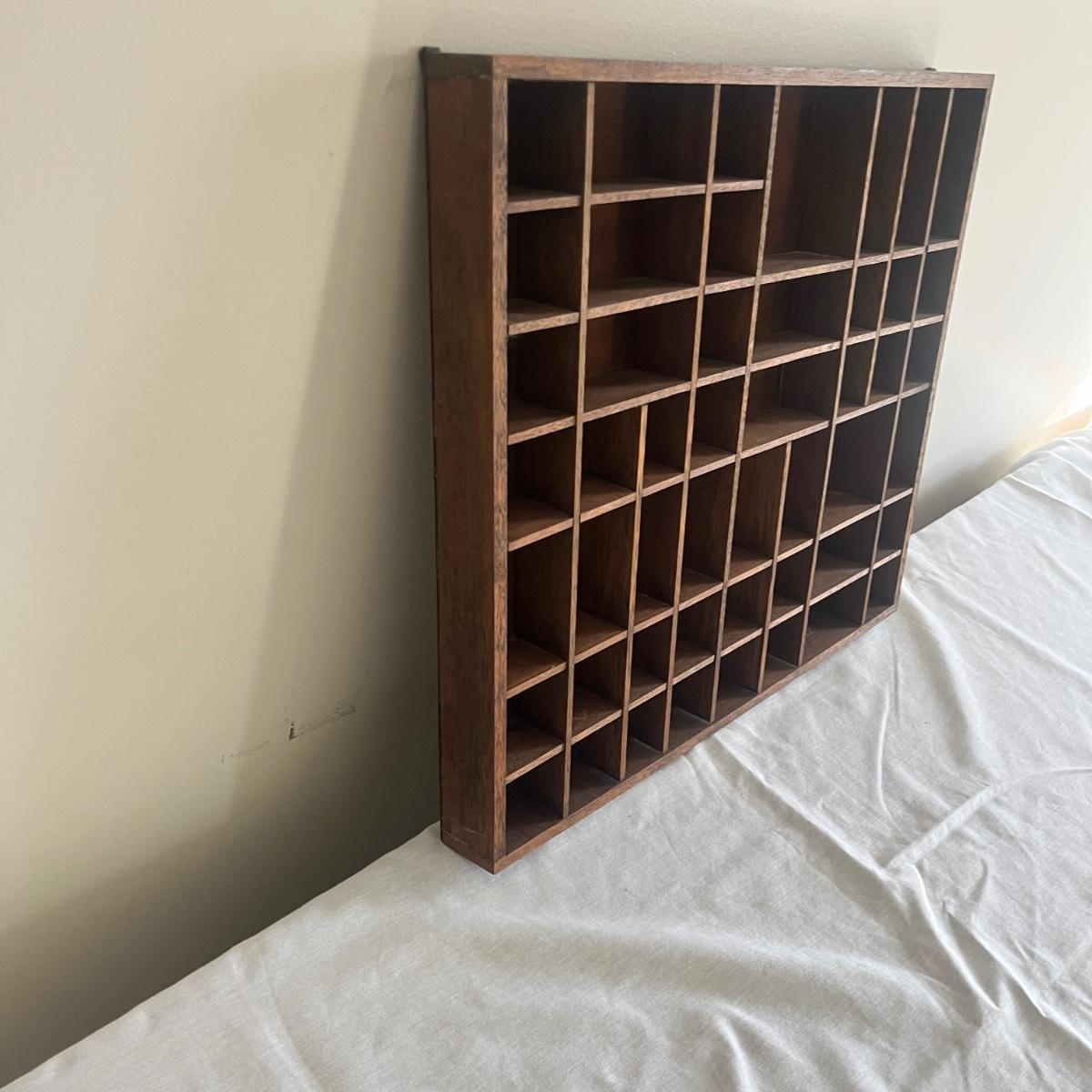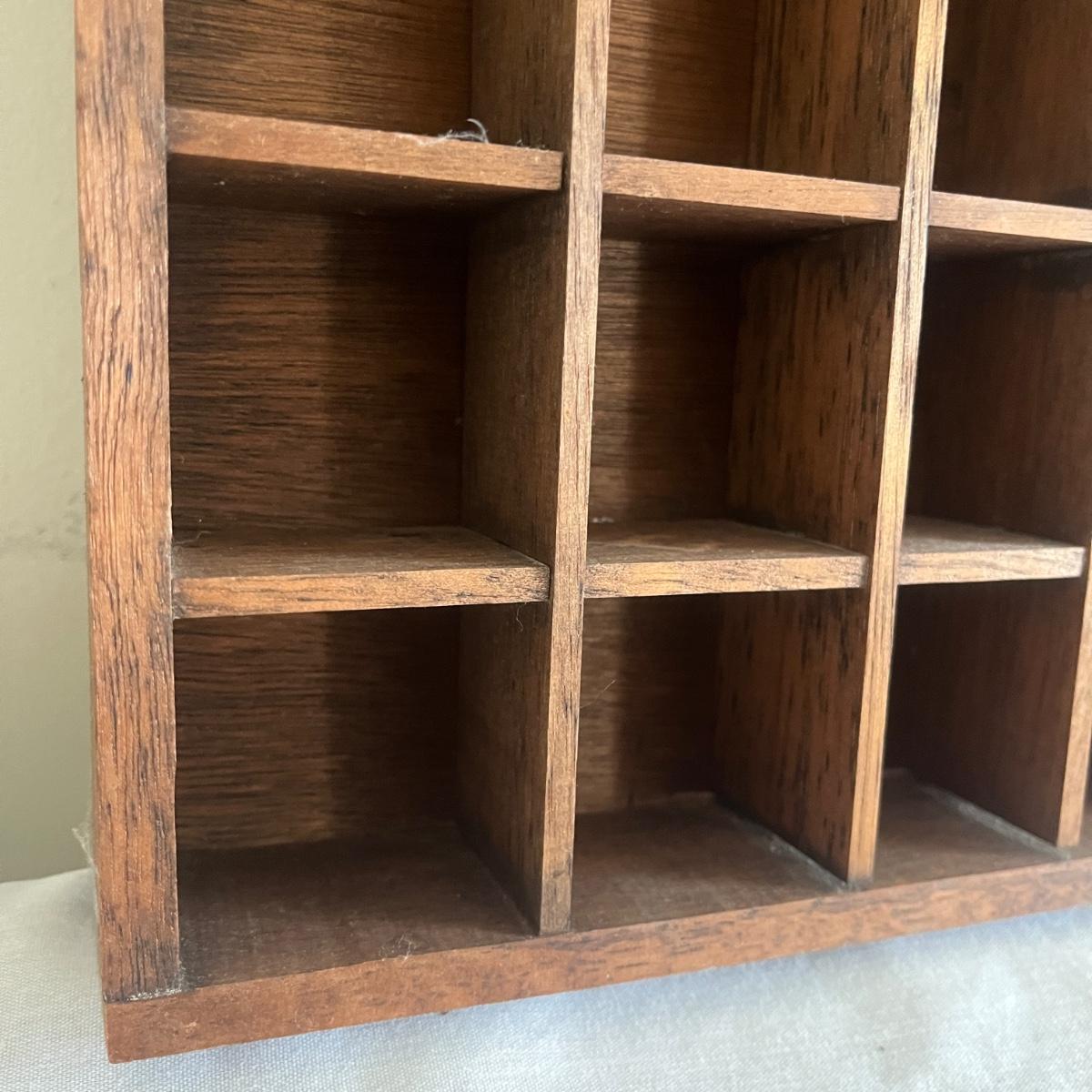 Lot includes a wooden printers tray with wall mounts. Piece measures 20.5” x 2” x 18”H.