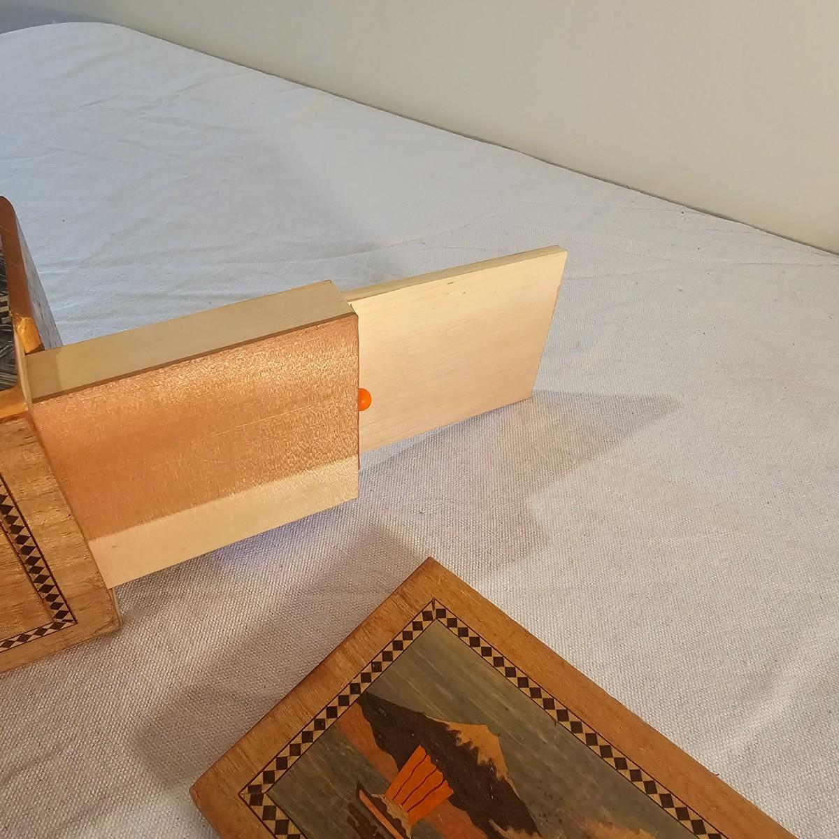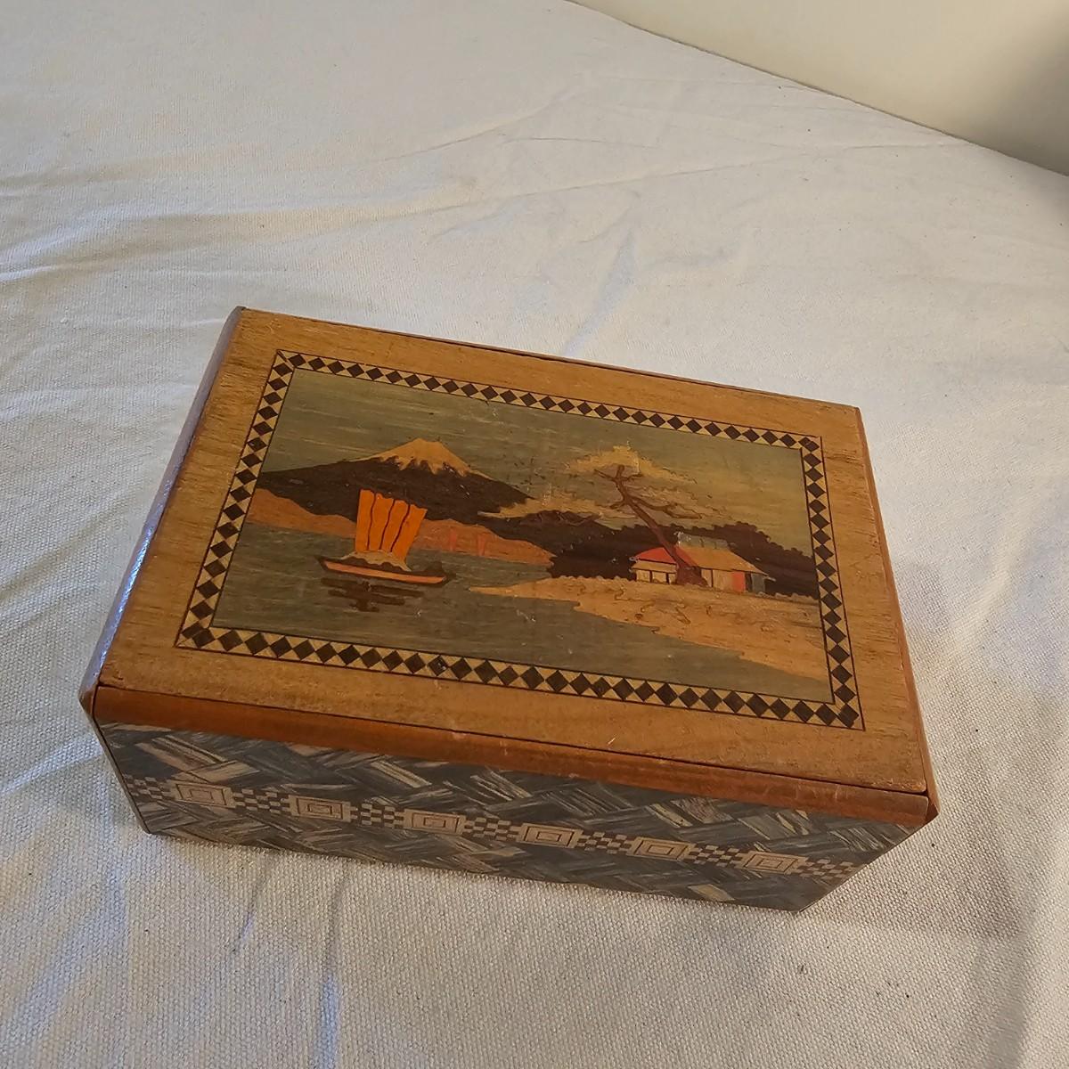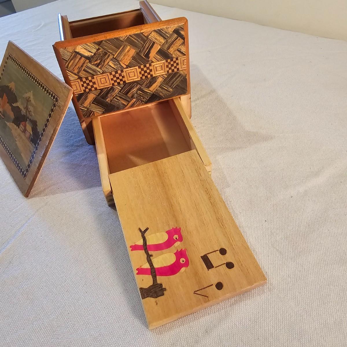 Wooden box with trick opening sequence. Painted scenes and inlaid designs abound. Box measures 6" x 4" x 2.5"H. Puzzle solution included. See photos for details. Shipping available.