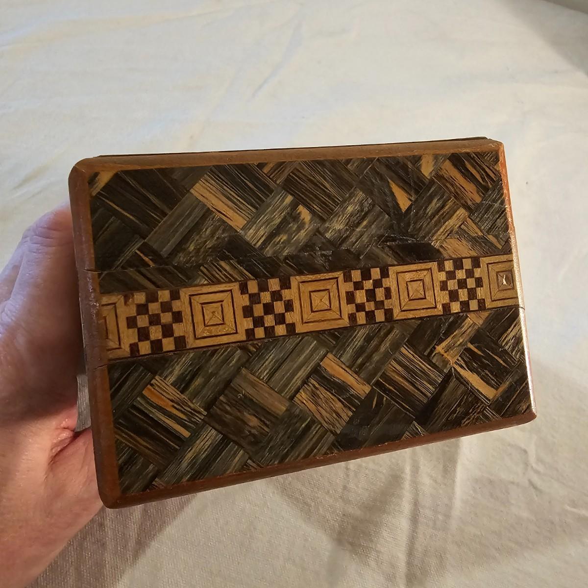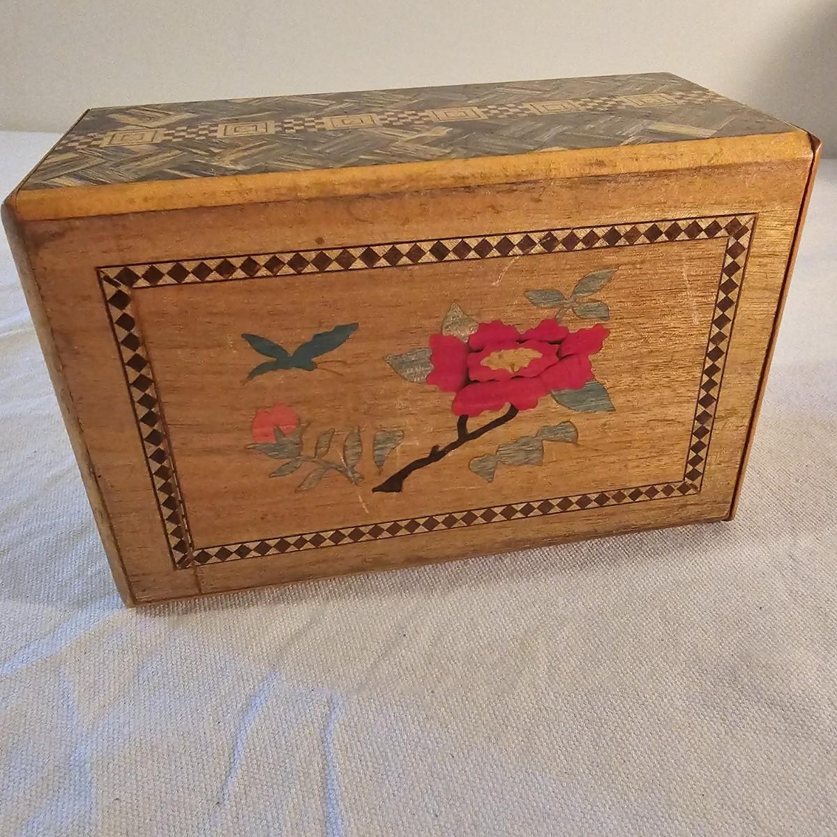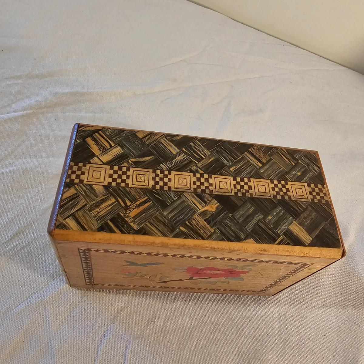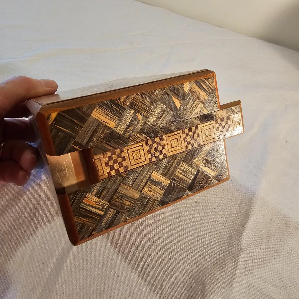Wooden box with trick opening sequence. Painted scenes and inlaid designs abound. Box measures 6" x 4" x 2.5"H. Puzzle solution included. See photos for details. Shipping available.