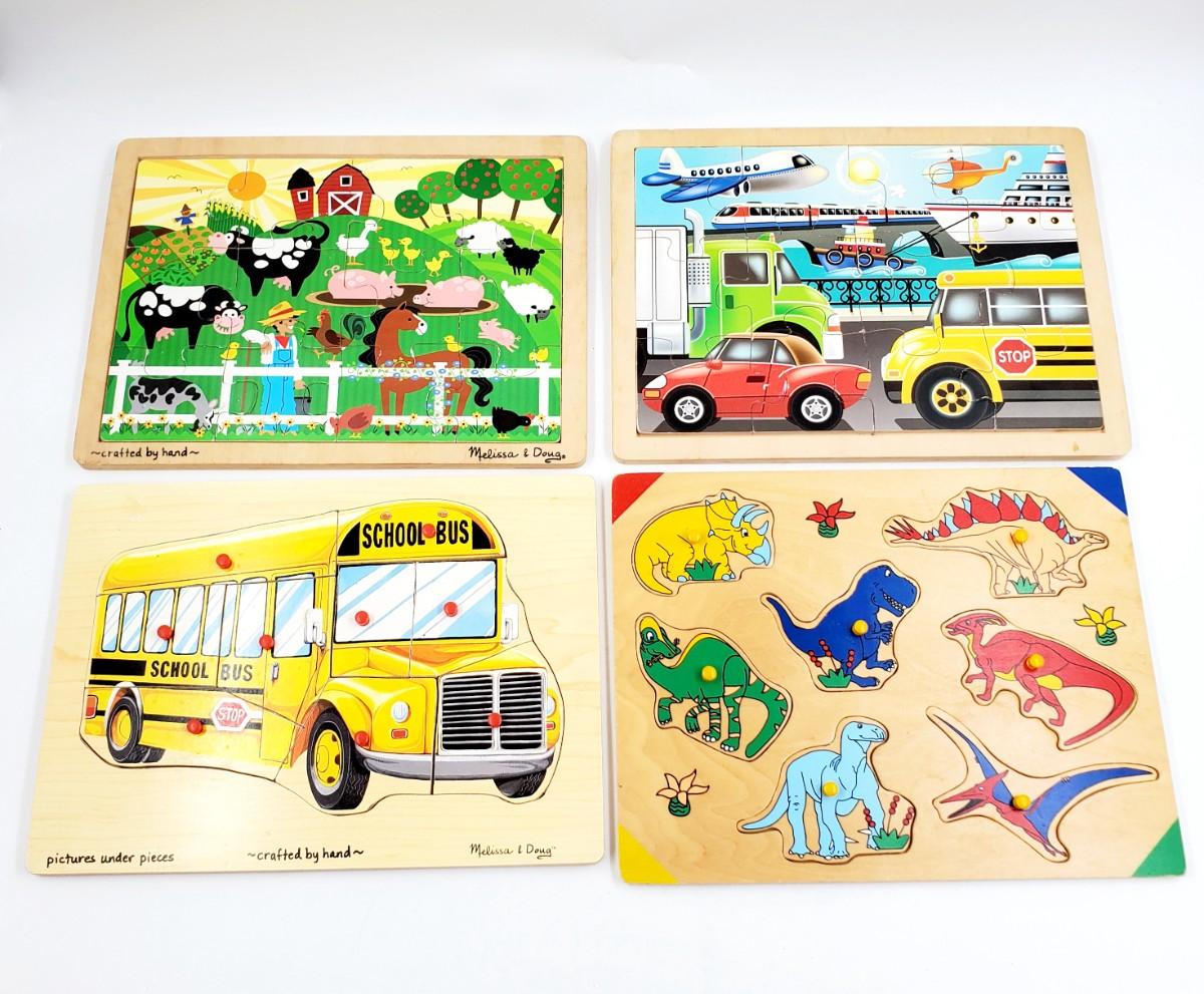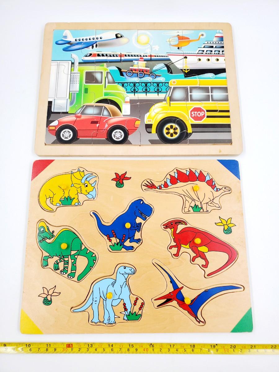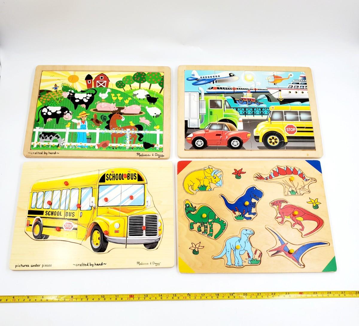 WOODEN PUZZLE LOT OF 4 ~DINOS, VEHICLES, FARM ANIMALS AND SCHOOL BUS BUNDLE