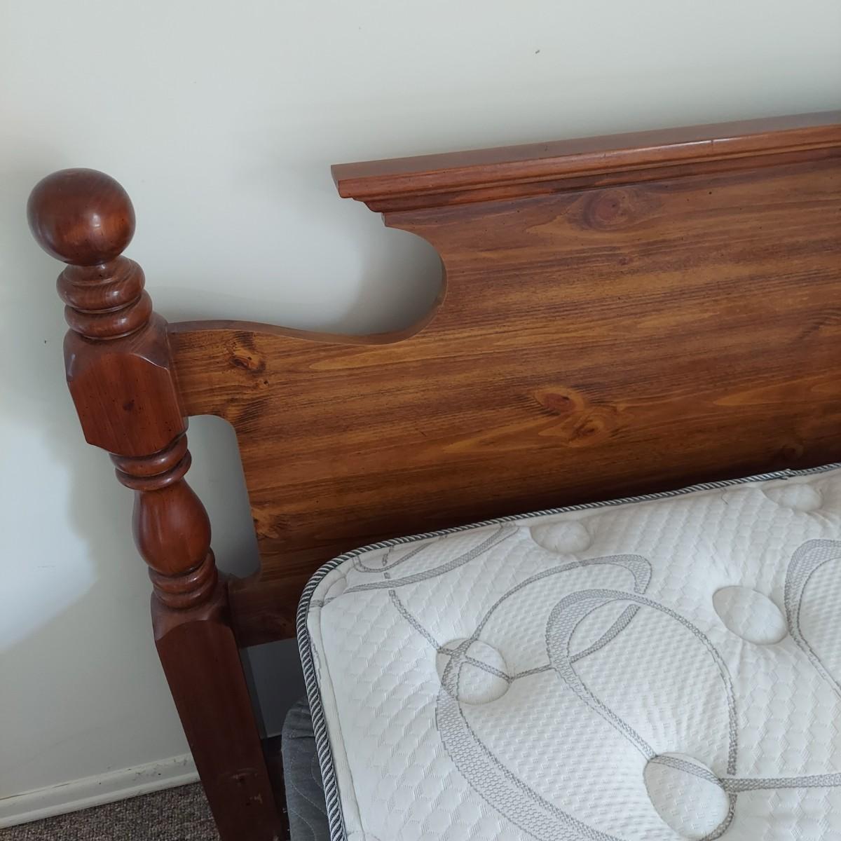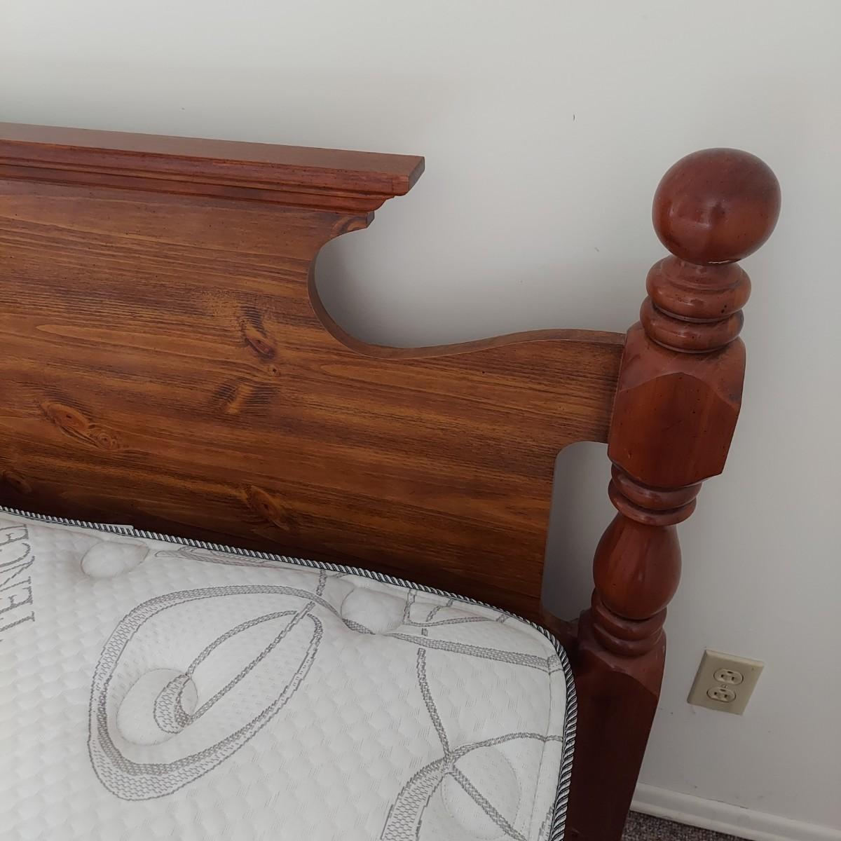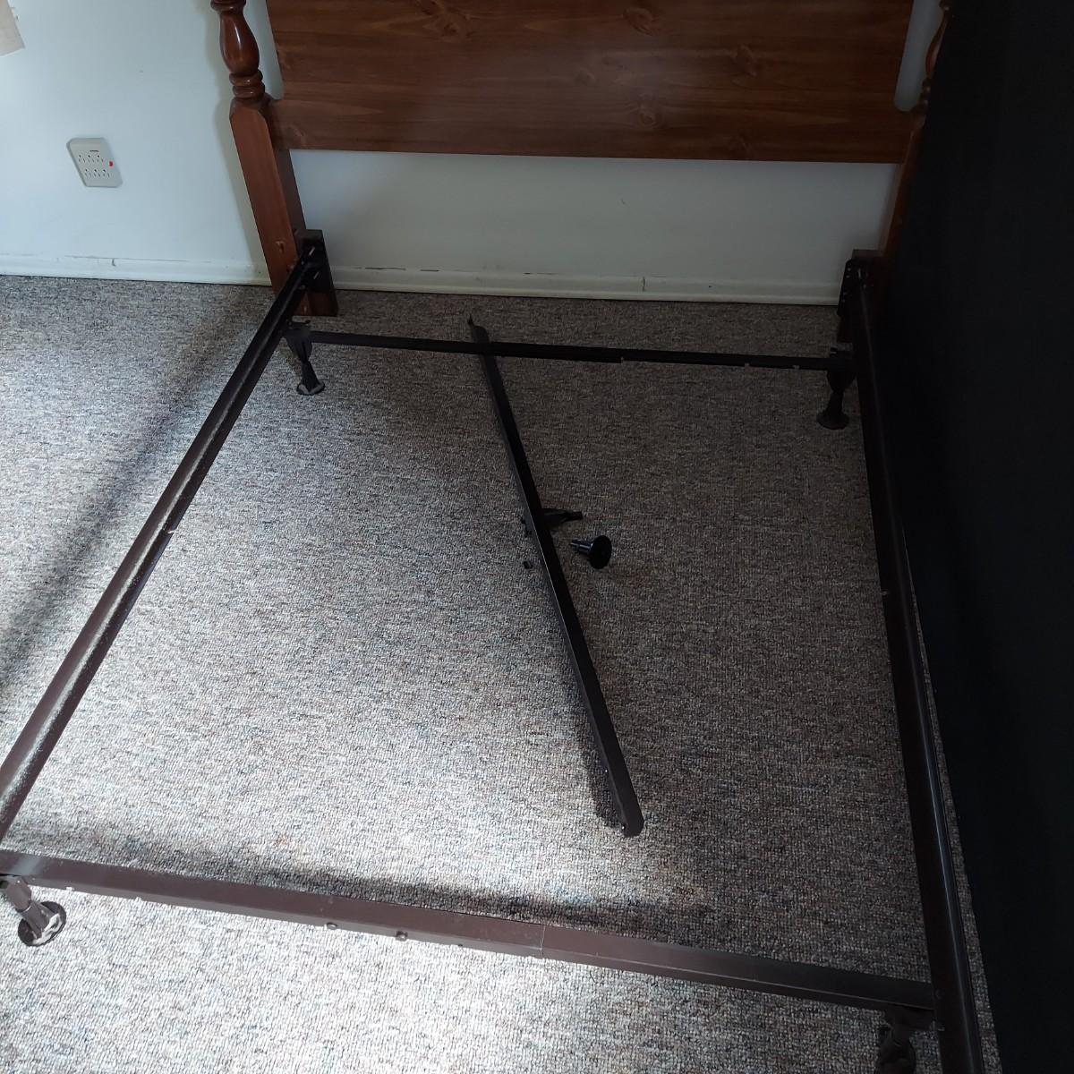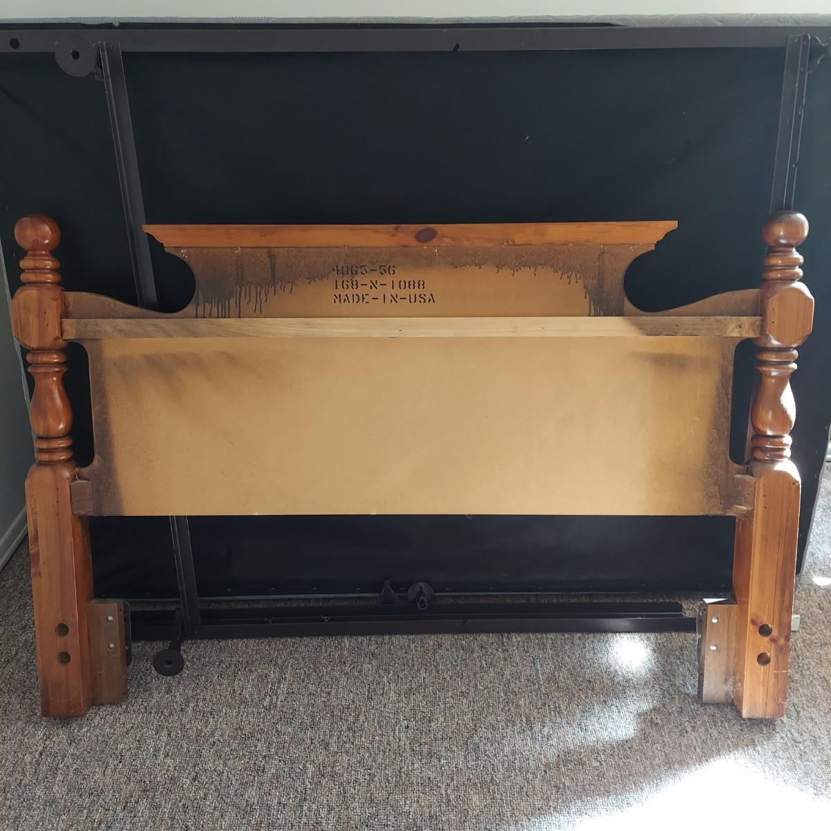 Wooden bed frame that measures 64" x 79" x 42"H. The mattress measures 53" x 74". It appears that a full size mattress and box spring is mounted on a queen frame. The mattress is available to the winning bidder if desired, but the winning bidder is not required to take it. Please be prepared to take the frame apart when item is picked up. Local Pickup Only