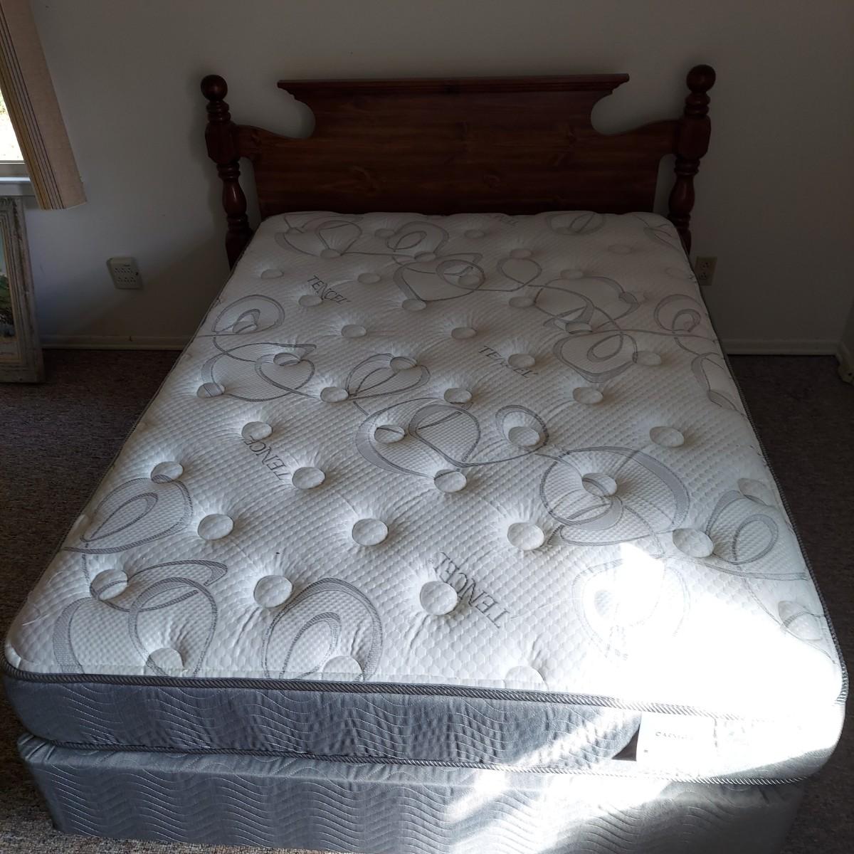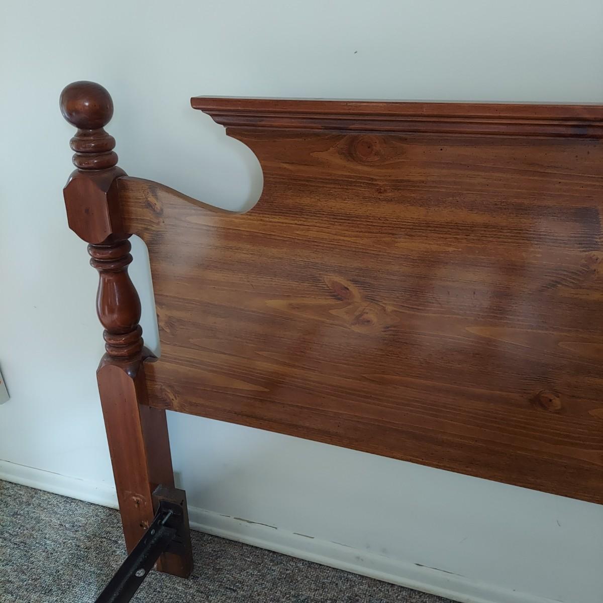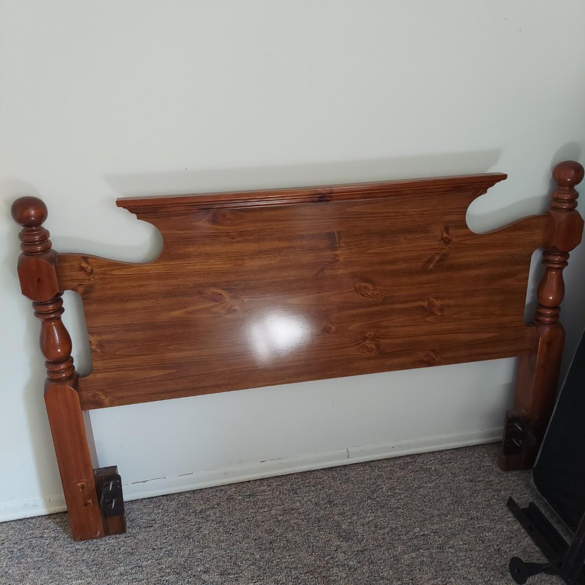 Wooden bed frame that measures 64" x 79" x 42"H. The mattress measures 53" x 74". It appears that a full size mattress and box spring is mounted on a queen frame. The mattress is available to the winning bidder if desired, but the winning bidder is not required to take it. Please be prepared to take the frame apart when item is picked up. Local Pickup Only