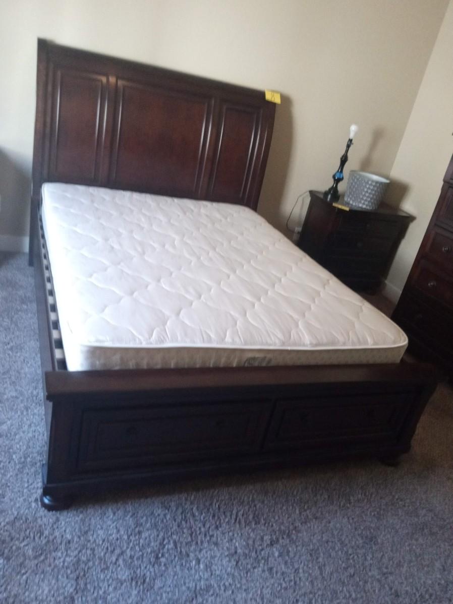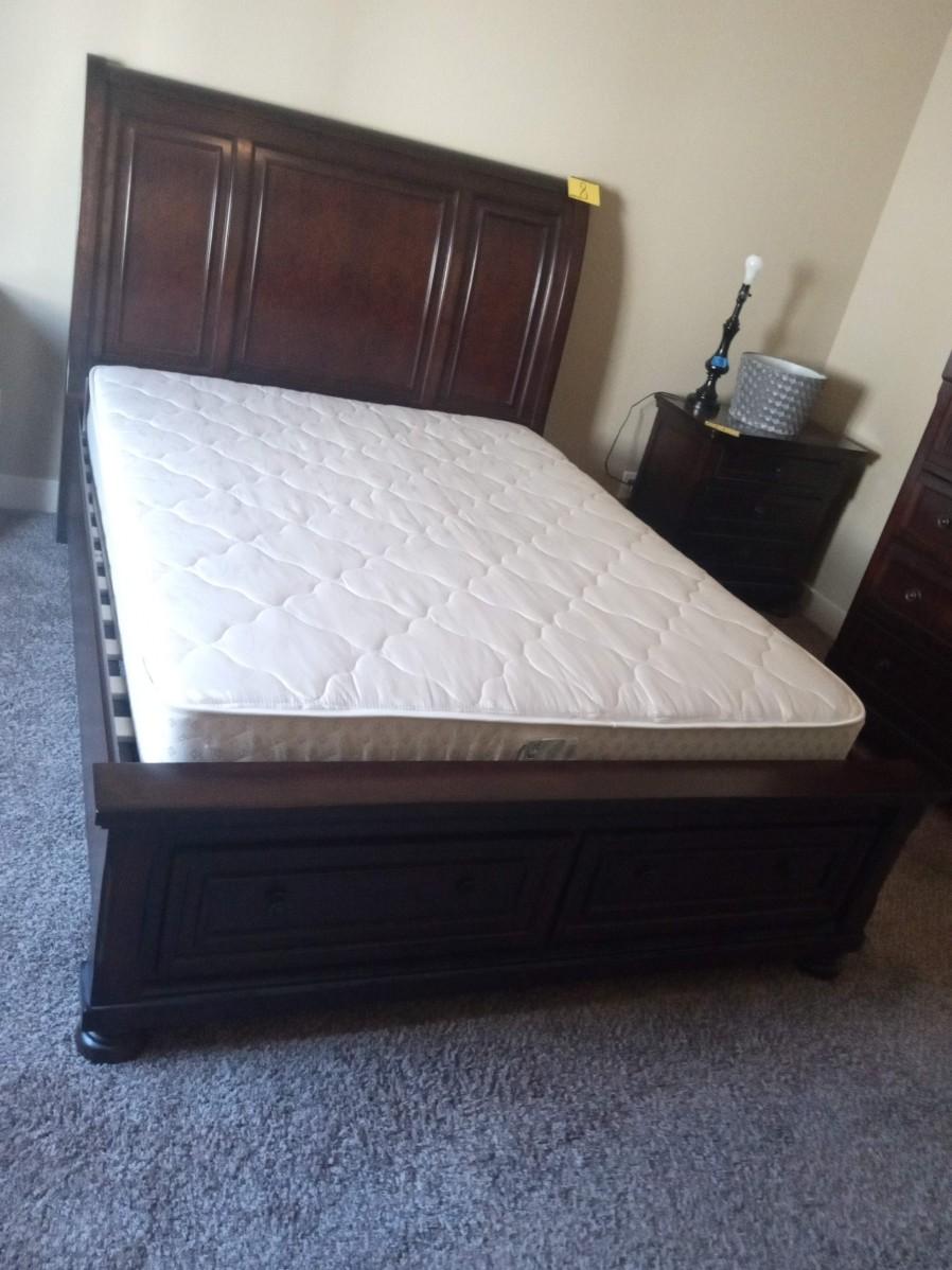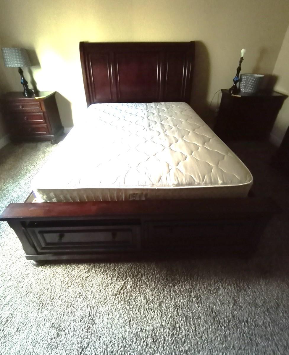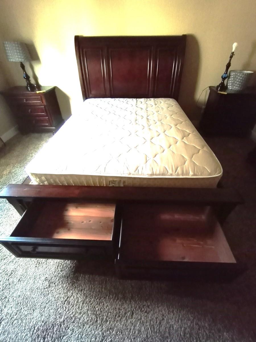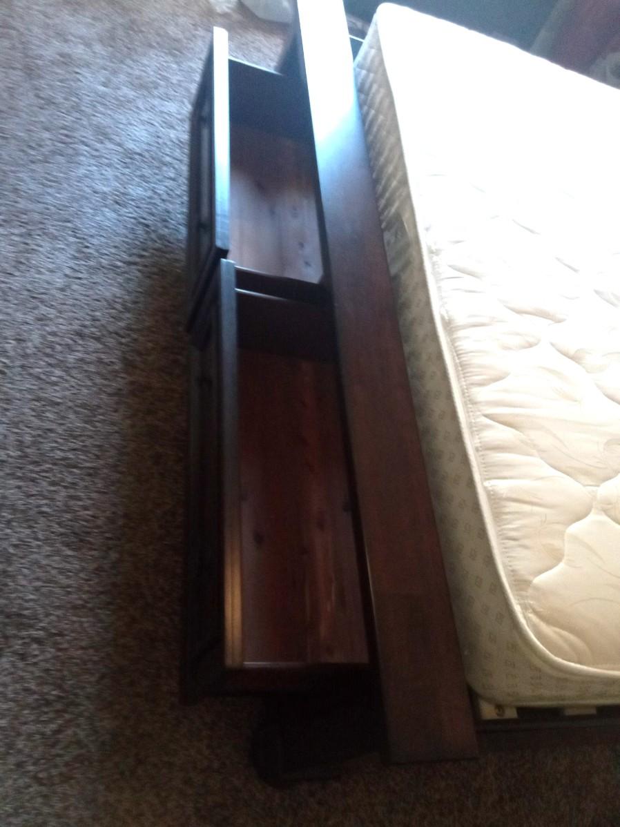 CLEAN SERTA MATTRESS RESTS UPON A PLATFORM FRAME THAT HOLDS A TALL, BOLD, SLIGHTLY CURVED HEADBOARD AND A FOOTBOARD THAT CONCEALS 2 NICE SIZE CEDAR DRAWERS MEASURES 65X89" HEADBOARD APPROX.67" TALL