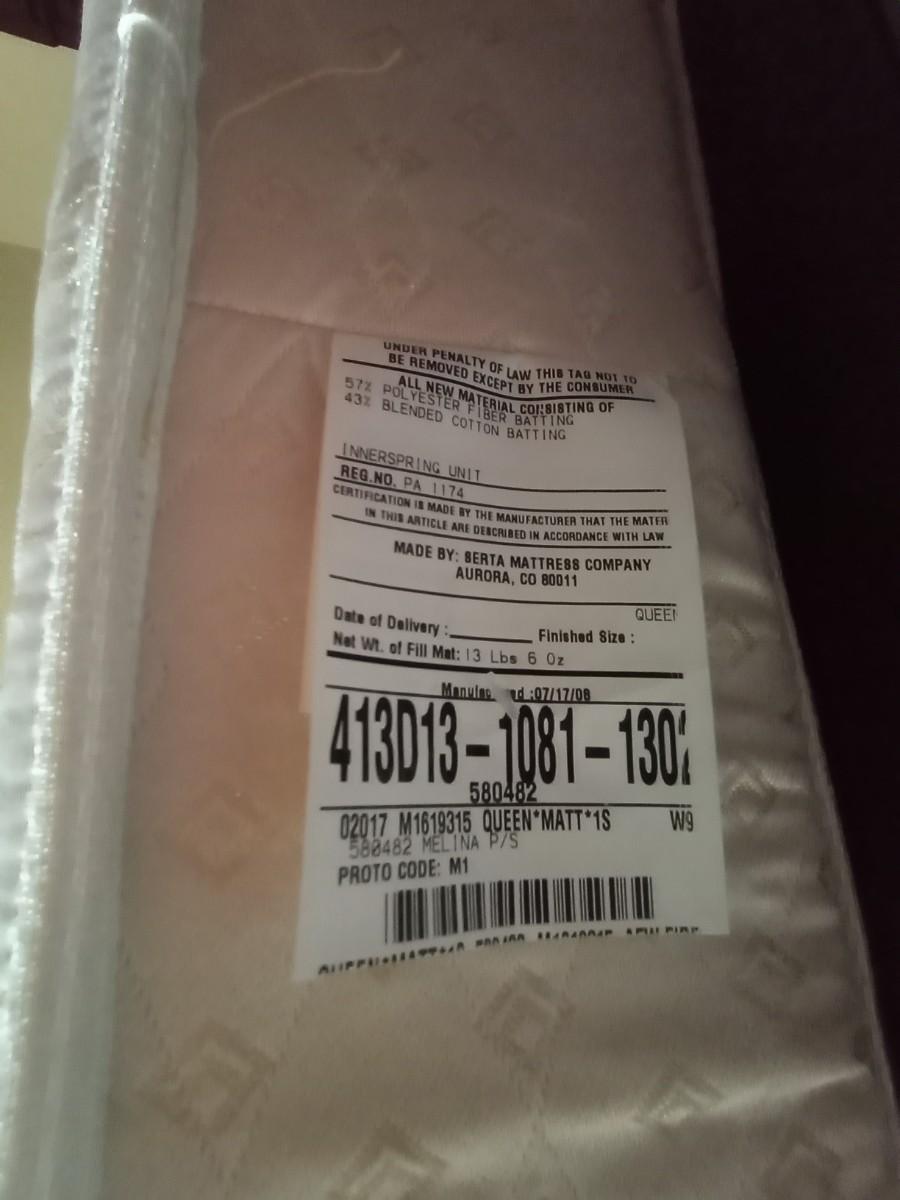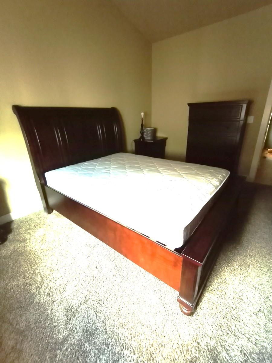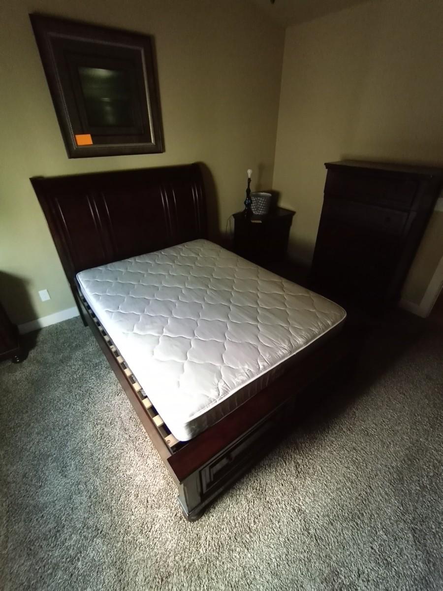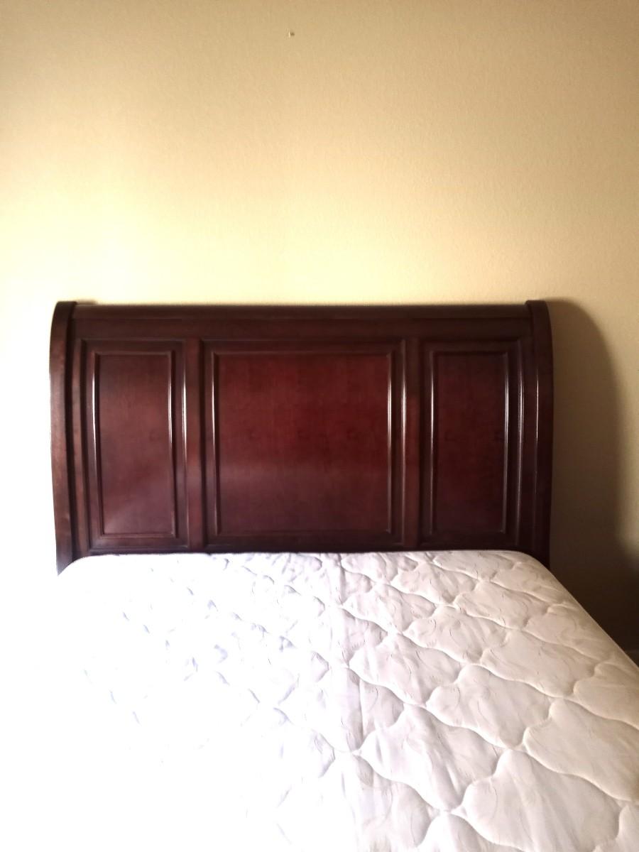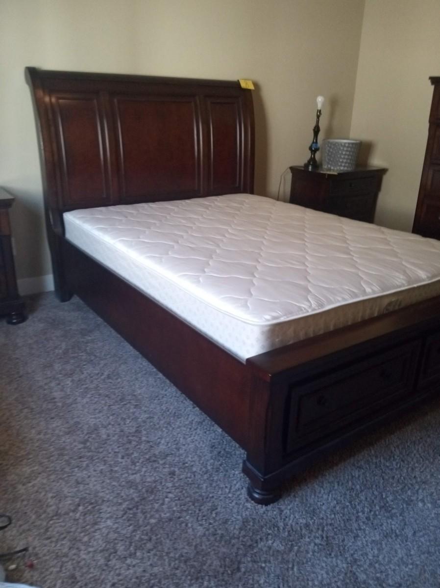 CLEAN SERTA MATTRESS RESTS UPON A PLATFORM FRAME THAT HOLDS A TALL, BOLD, SLIGHTLY CURVED HEADBOARD AND A FOOTBOARD THAT CONCEALS 2 NICE SIZE CEDAR DRAWERS MEASURES 65X89" HEADBOARD APPROX.67" TALL