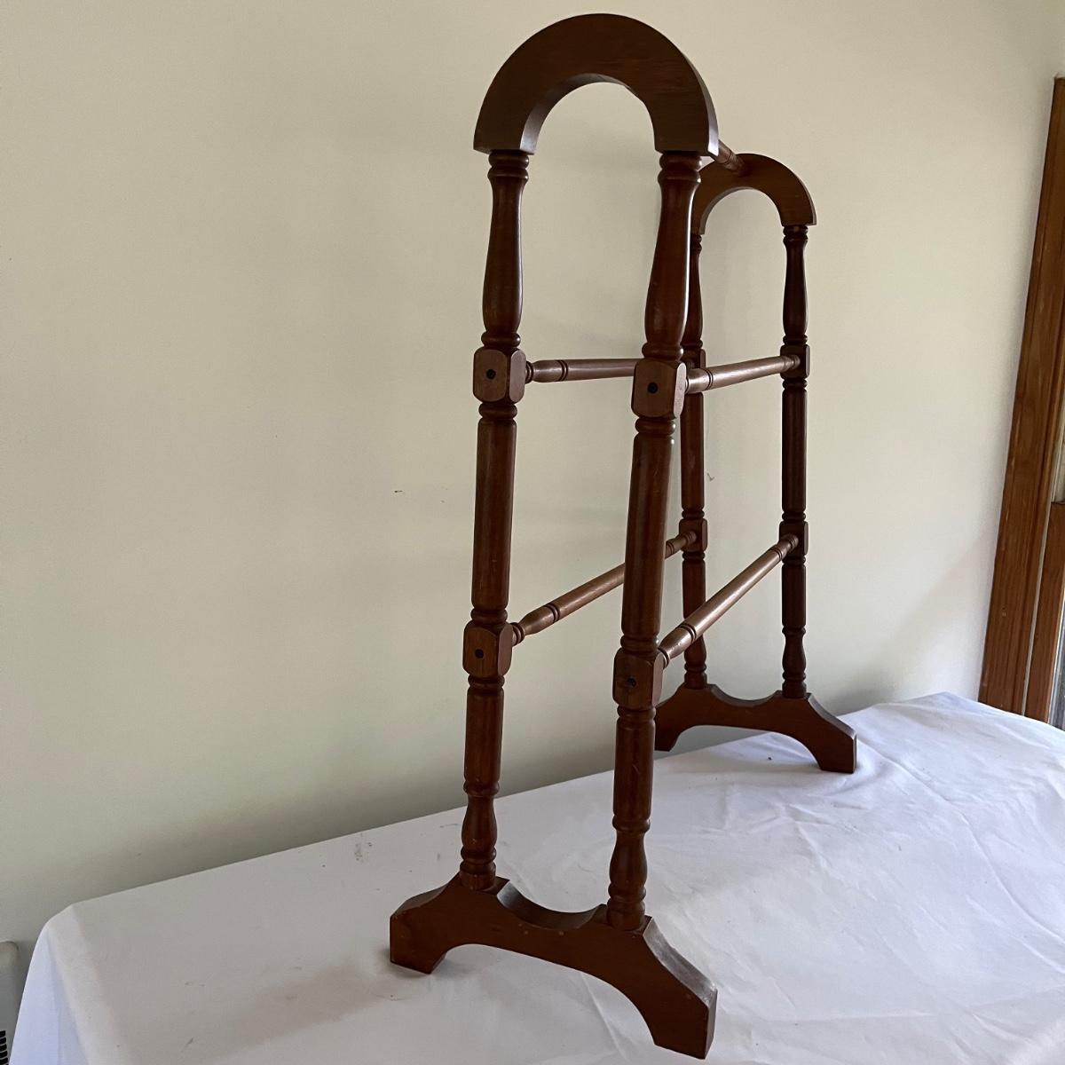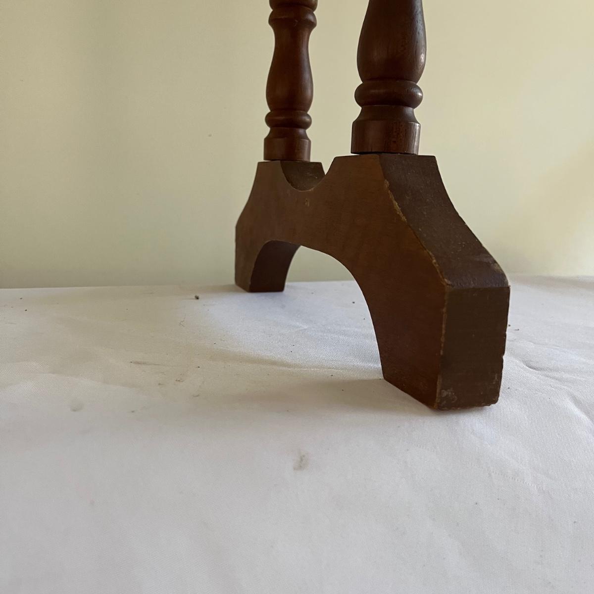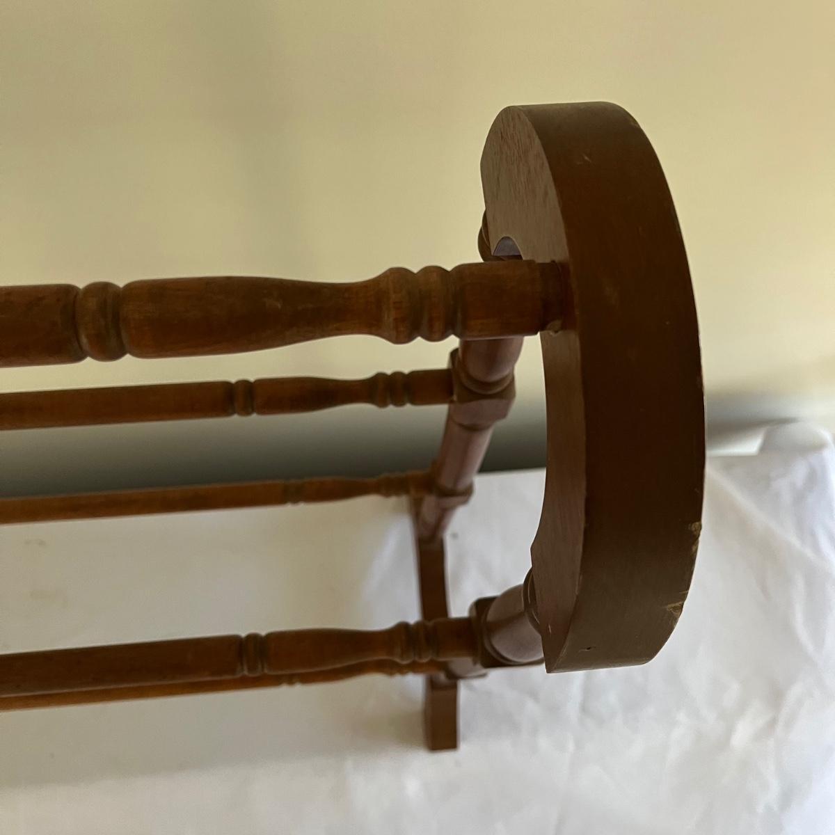 This wooden quilt display rack has a rounded top and is in good condition. It does have a few small scratches. It measures 12” x 27” x 33”.