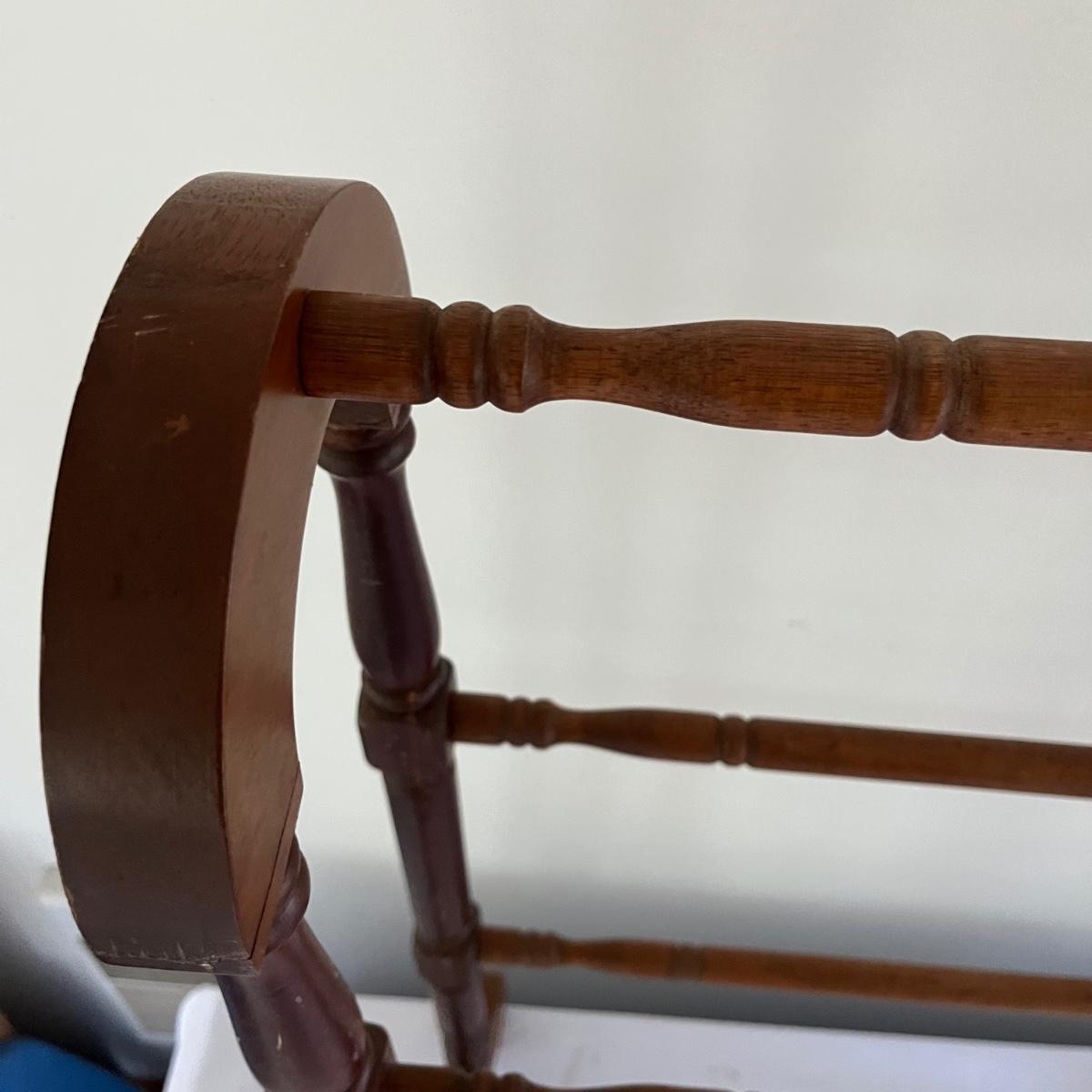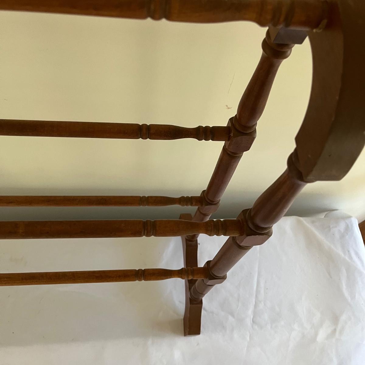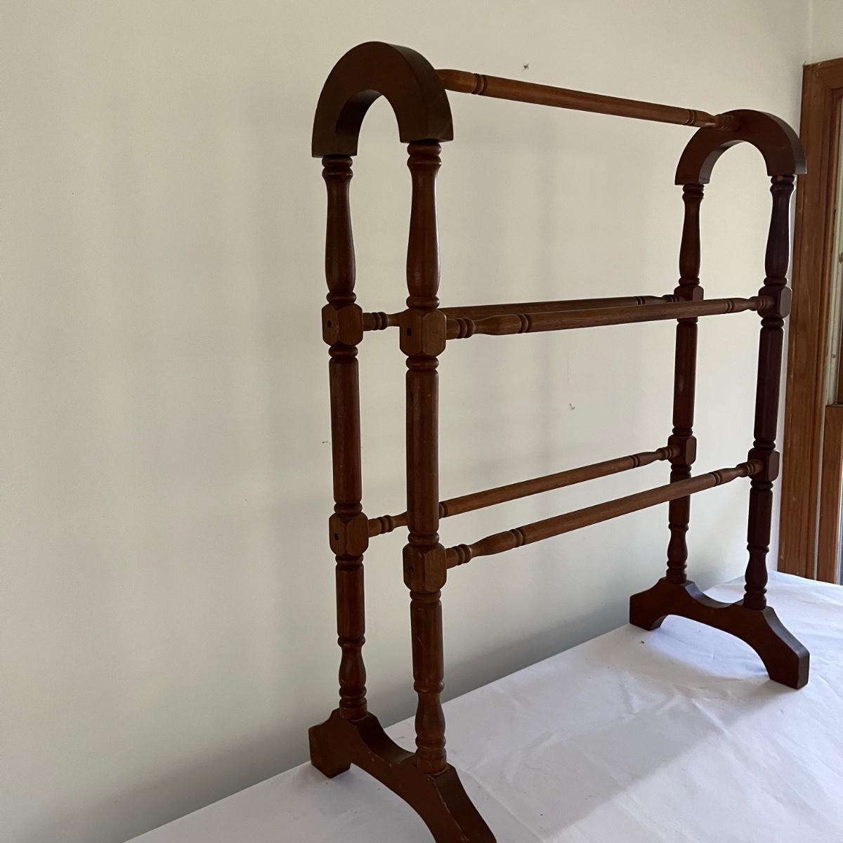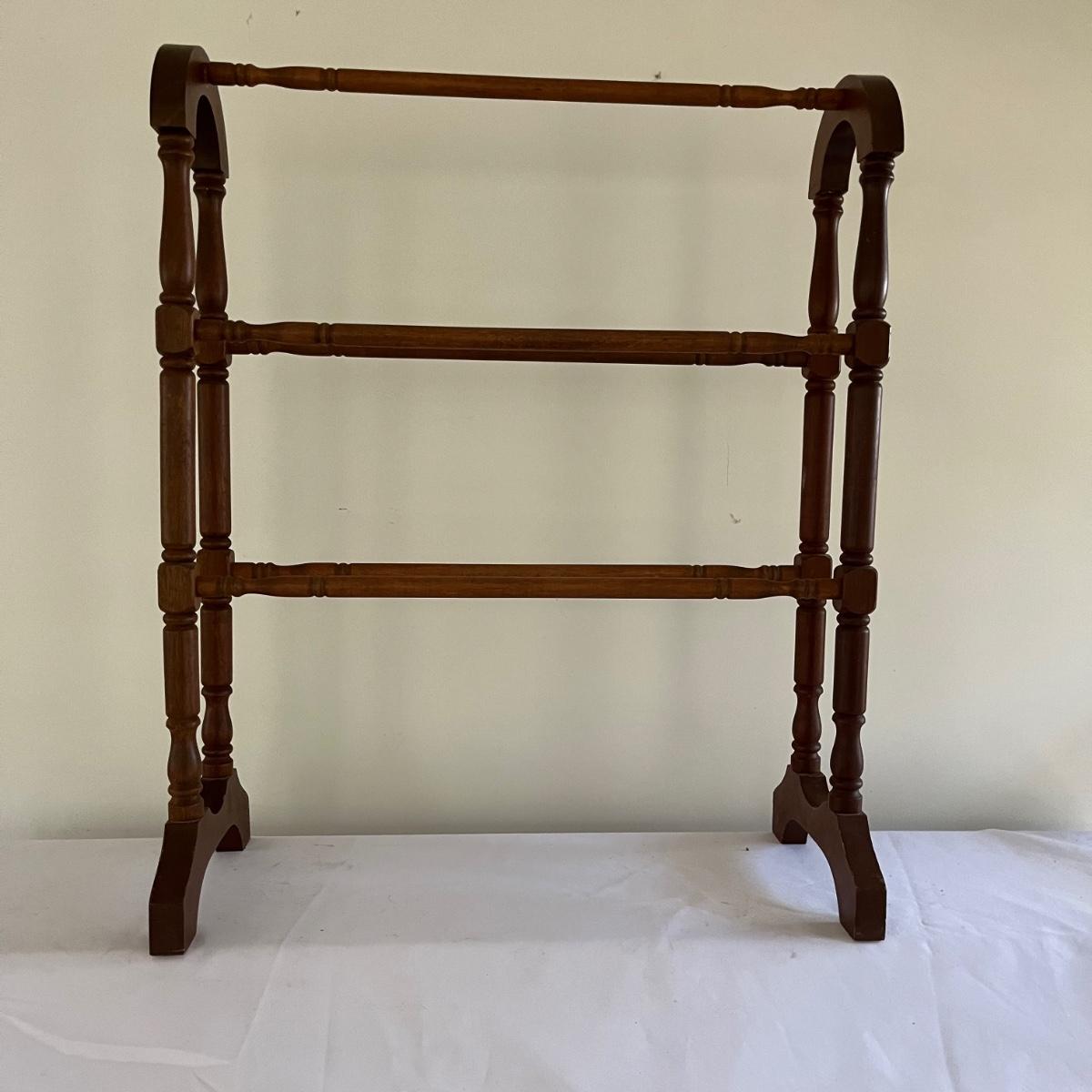 This wooden quilt display rack has a rounded top and is in good condition. It does have a few small scratches. It measures 12” x 27” x 33”.