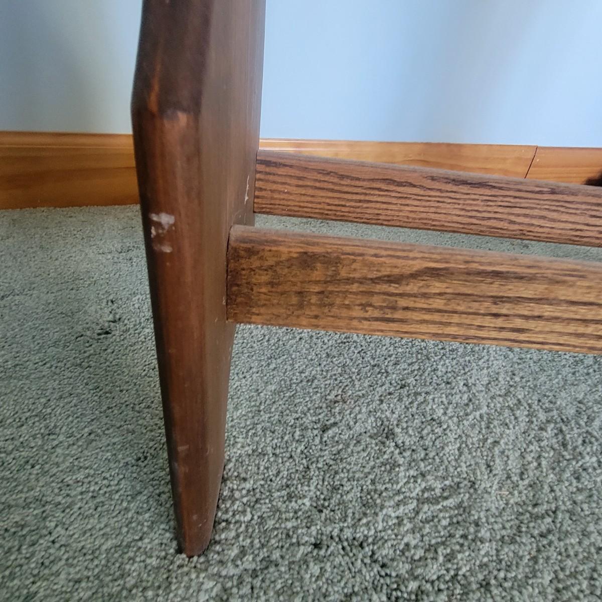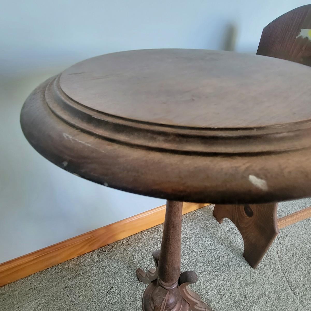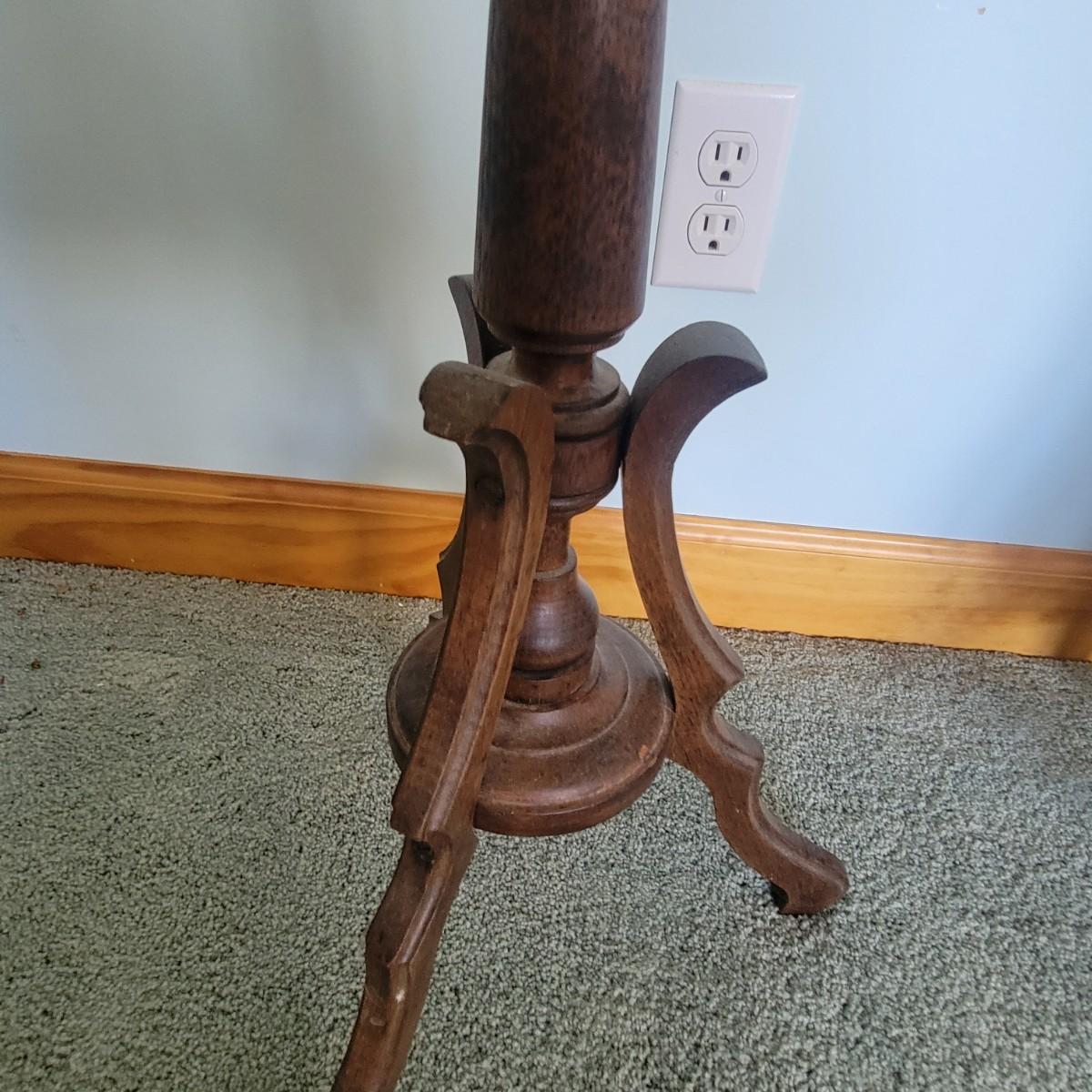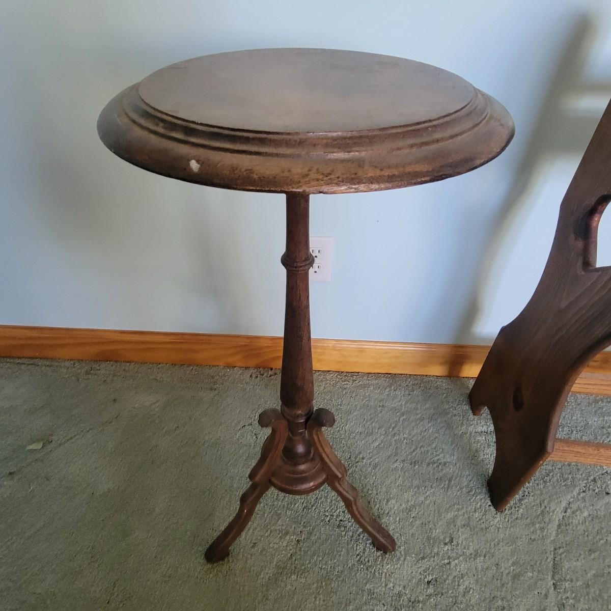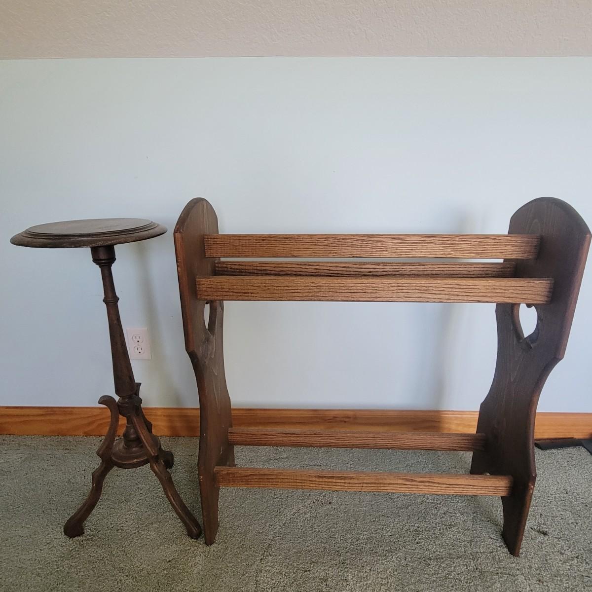 Wooden quilt rack in good condition with a few minor scuffs. Measures 33" x 30" x 11". Tri-foot wooden plant stand. Top plate of stand is little loose. Measures 30" x 12".