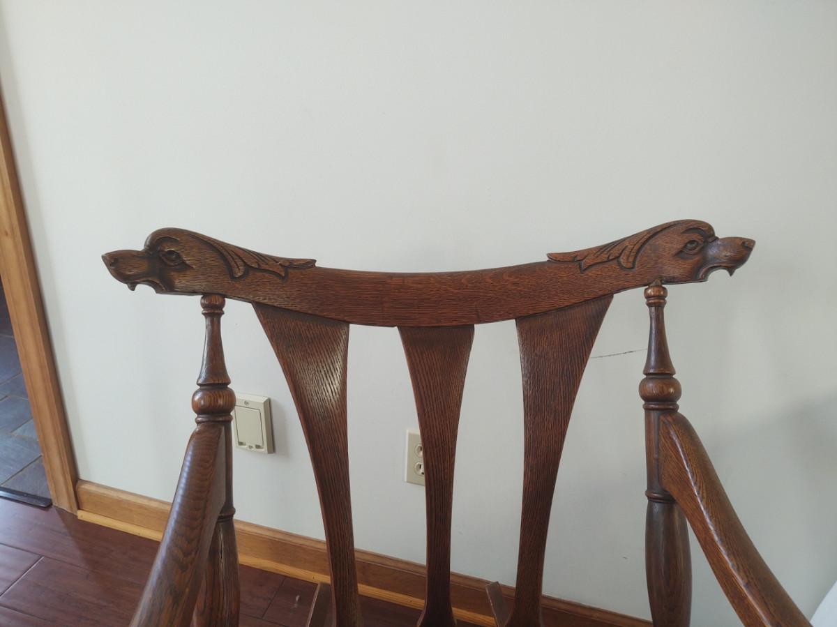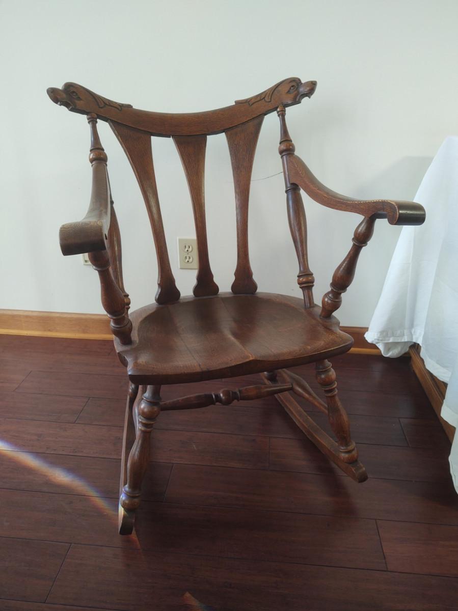 Wooden rocking chair has unique carvings on the upper back rest. Please see pictures for details.