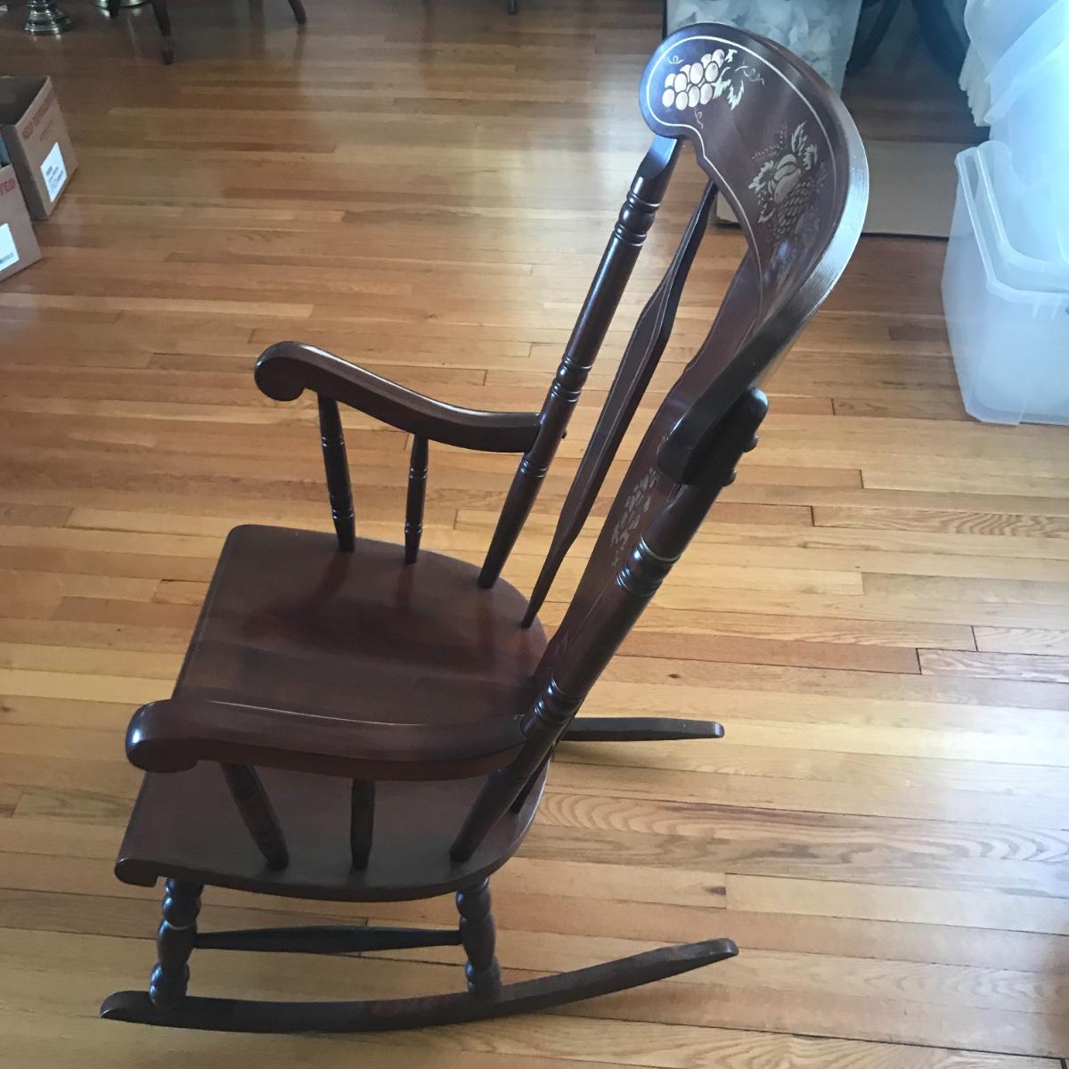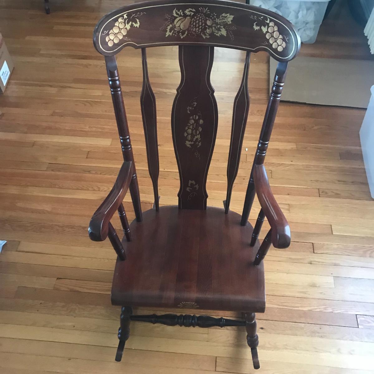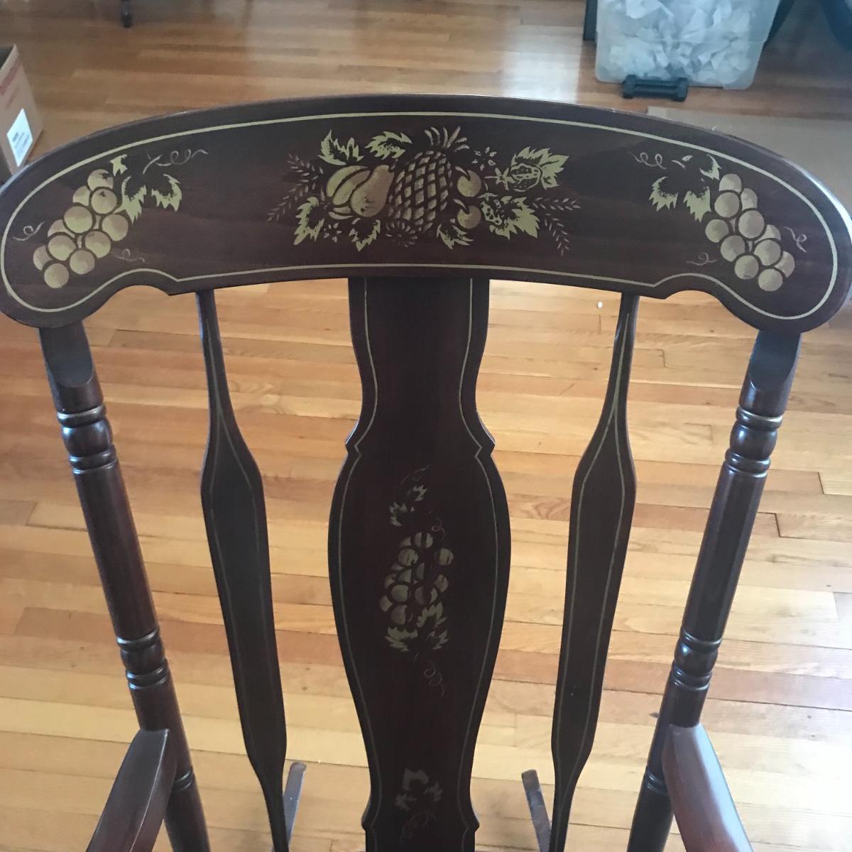 Solid wooden ornate hardwood rocking chair. Gold painted design of Hitchcock style. Stamped underneath with “Made in Yugoslavia” Local pick up only.