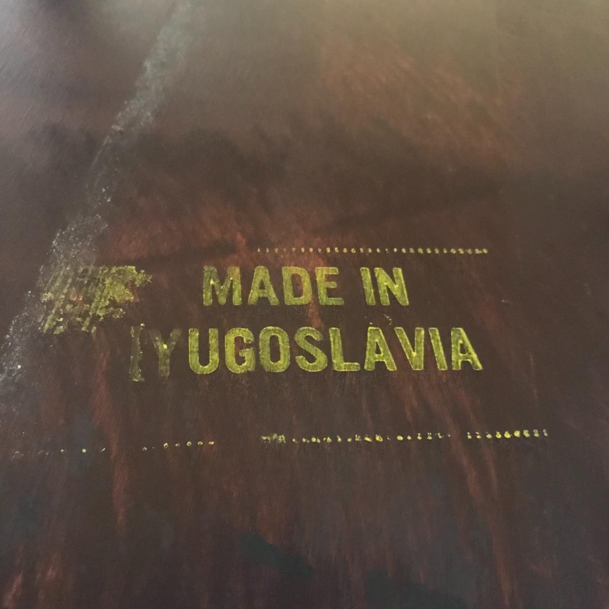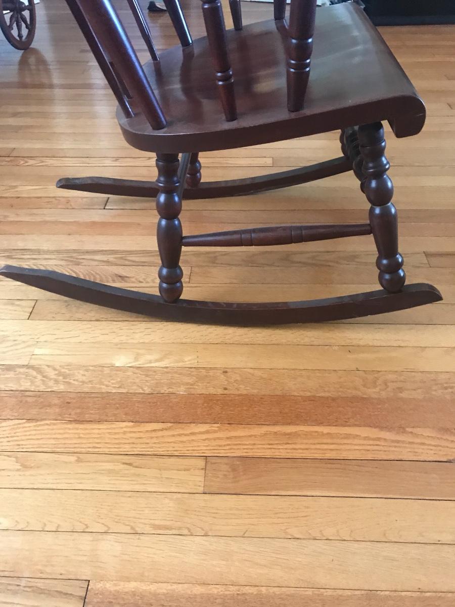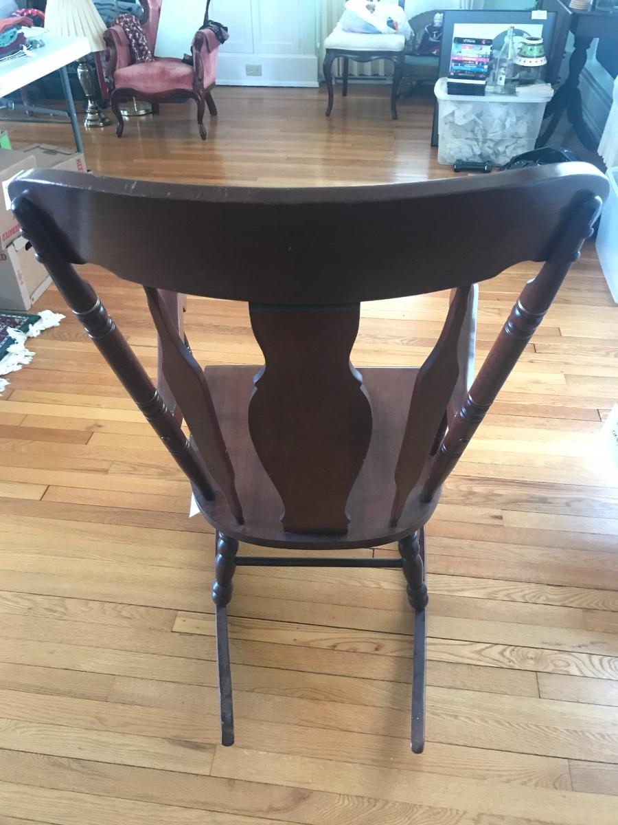 Solid wooden ornate hardwood rocking chair. Gold painted design of Hitchcock style. Stamped underneath with “Made in Yugoslavia” Local pick up only.