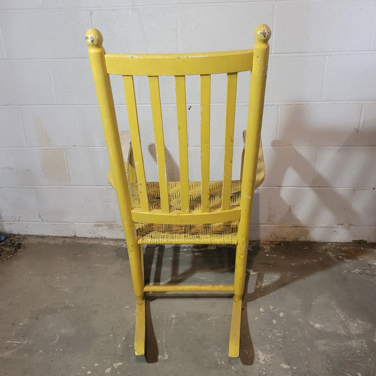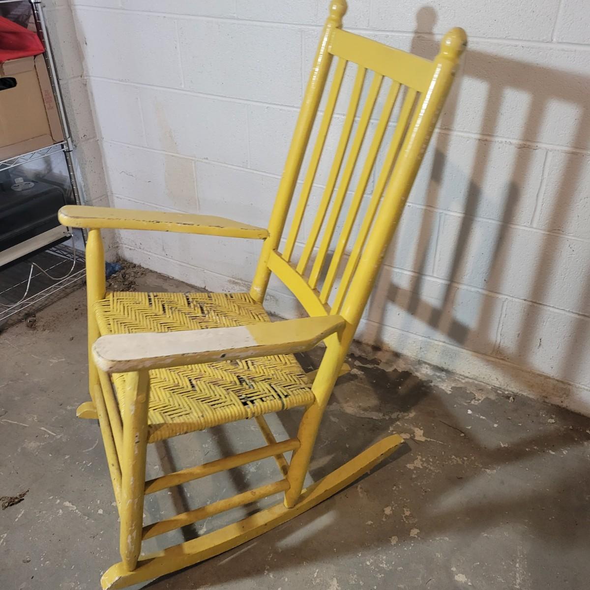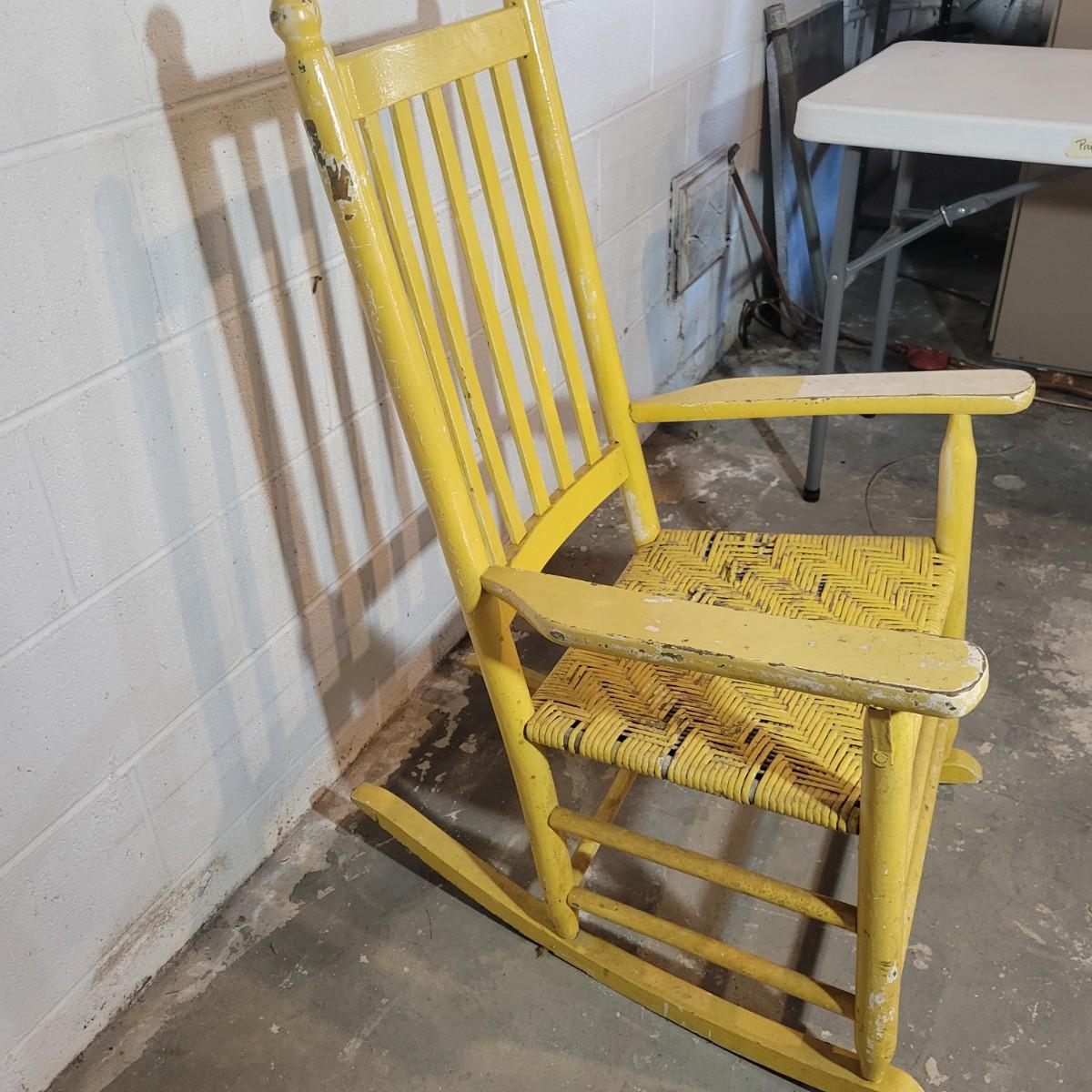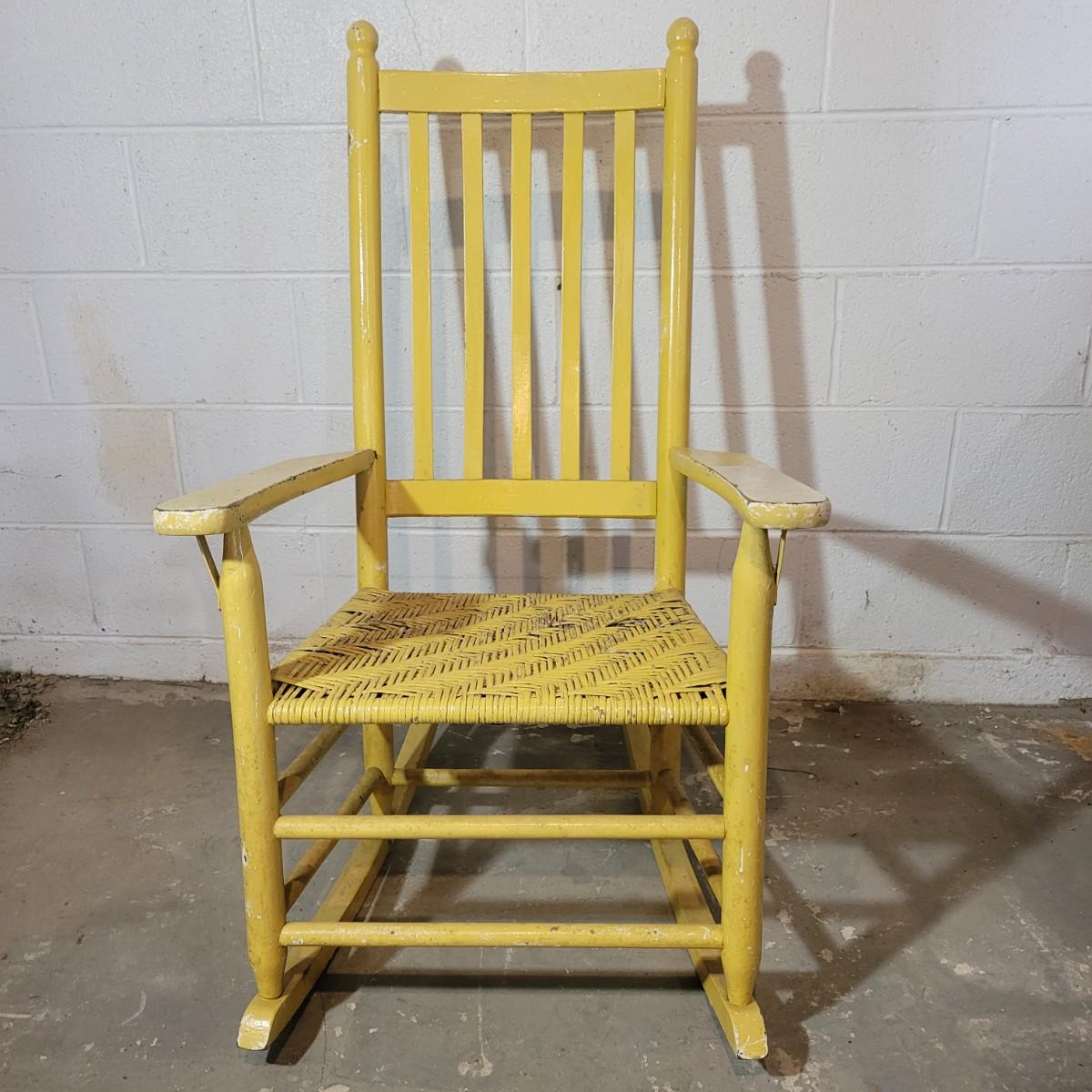 A wooden rocking chair with a woven seat in fair condition, but could easily be refinished or painted to bring it new life as it is still structurally sound. Woven seat has some broken pieces. Measures approximately 29" x 23.5" x 41" with a seat height of 16" Local pickup only