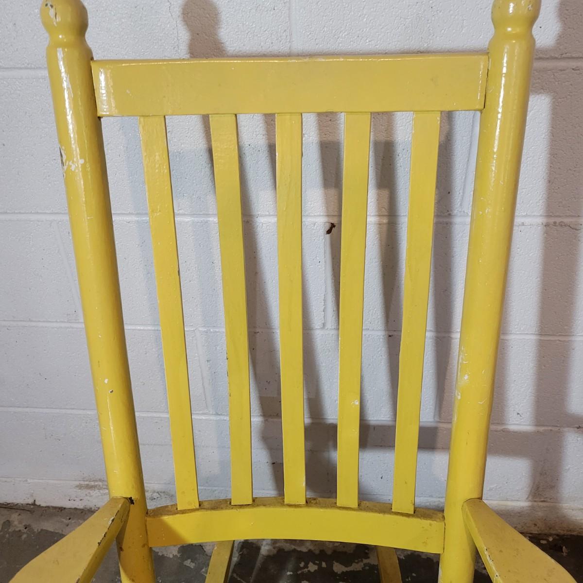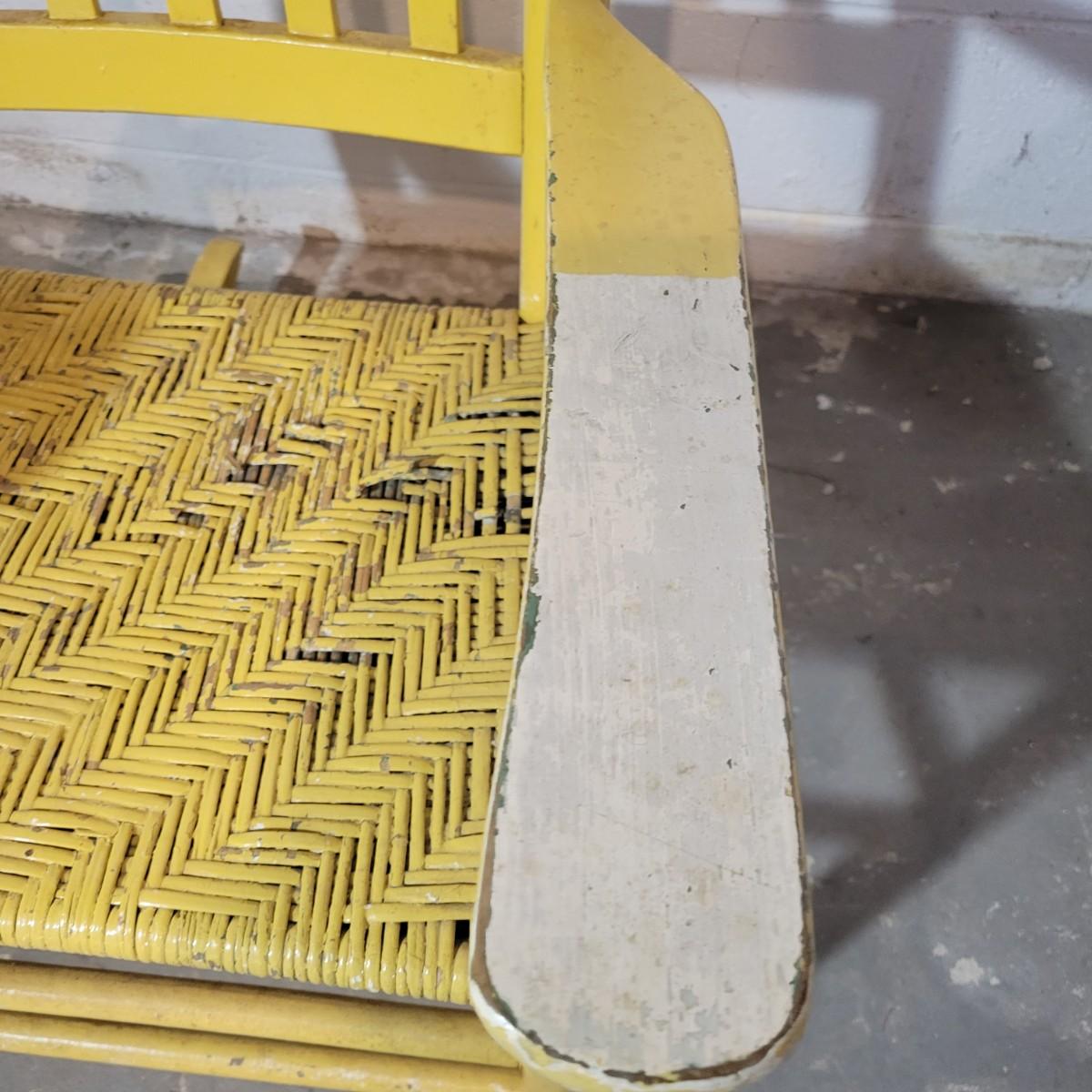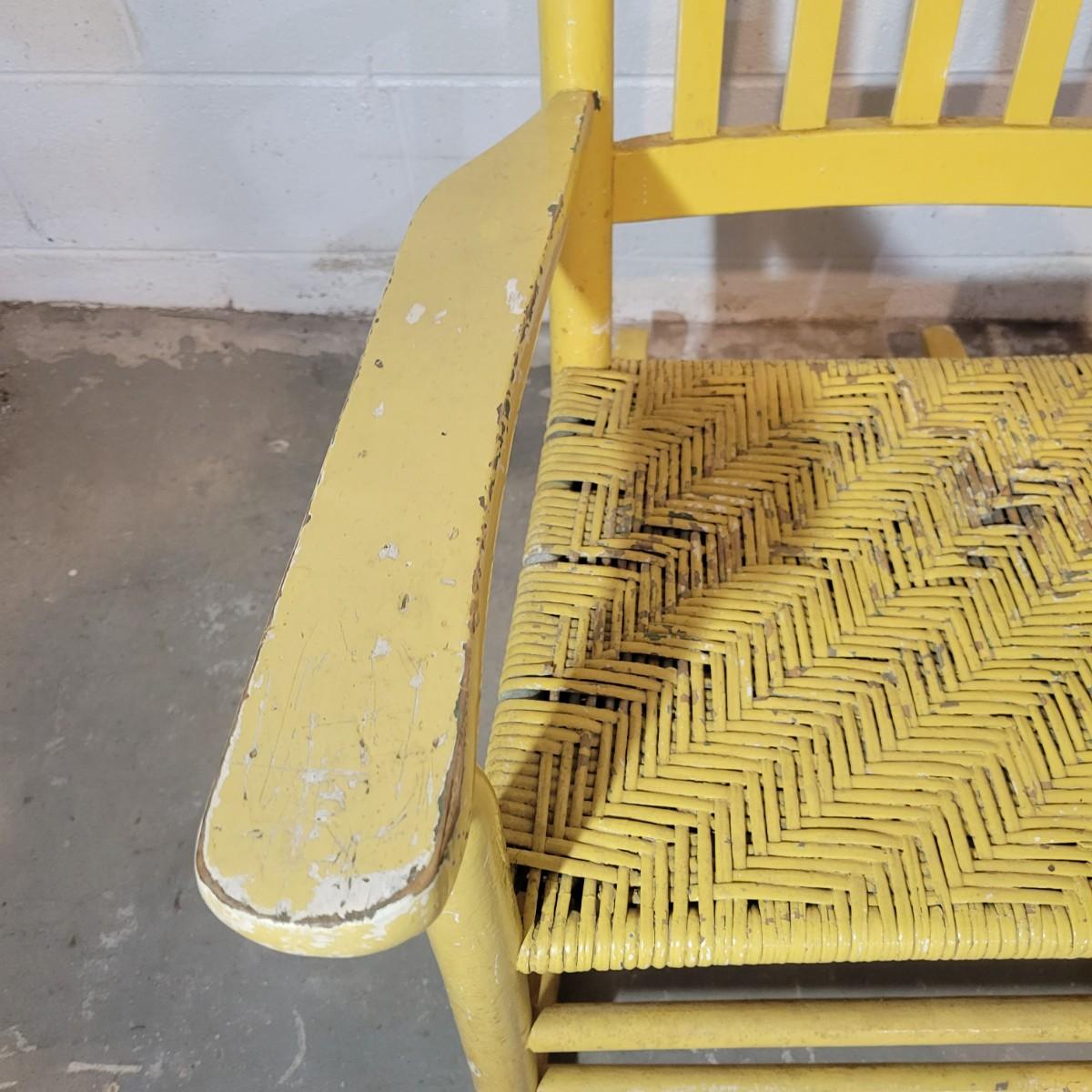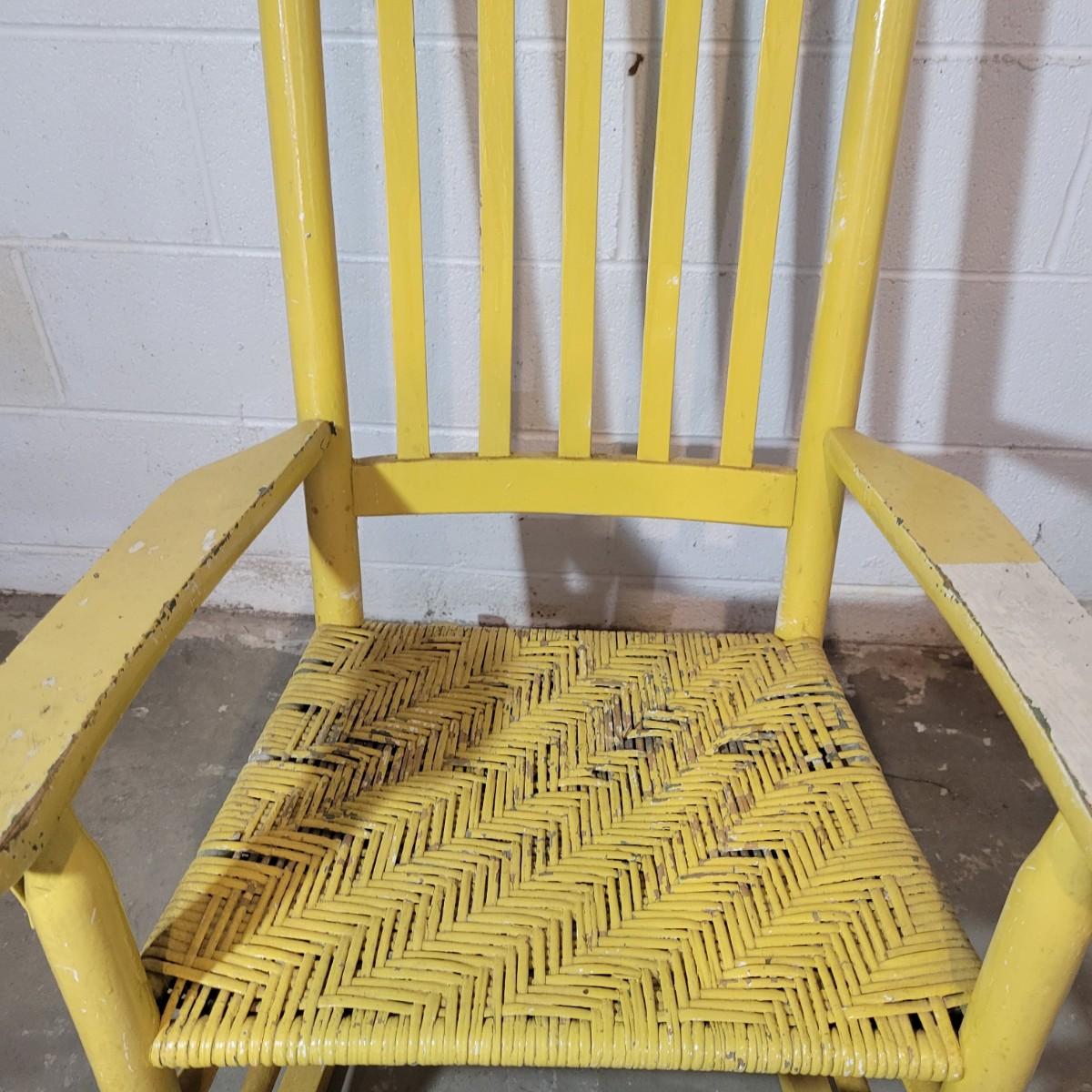 A wooden rocking chair with a woven seat in fair condition, but could easily be refinished or painted to bring it new life as it is still structurally sound. Woven seat has some broken pieces. Measures approximately 29" x 23.5" x 41" with a seat height of 16" Local pickup only