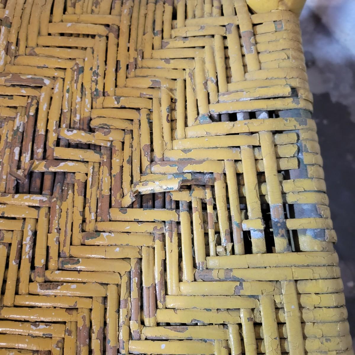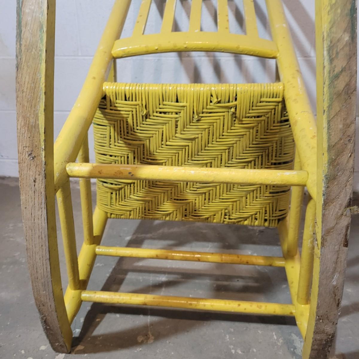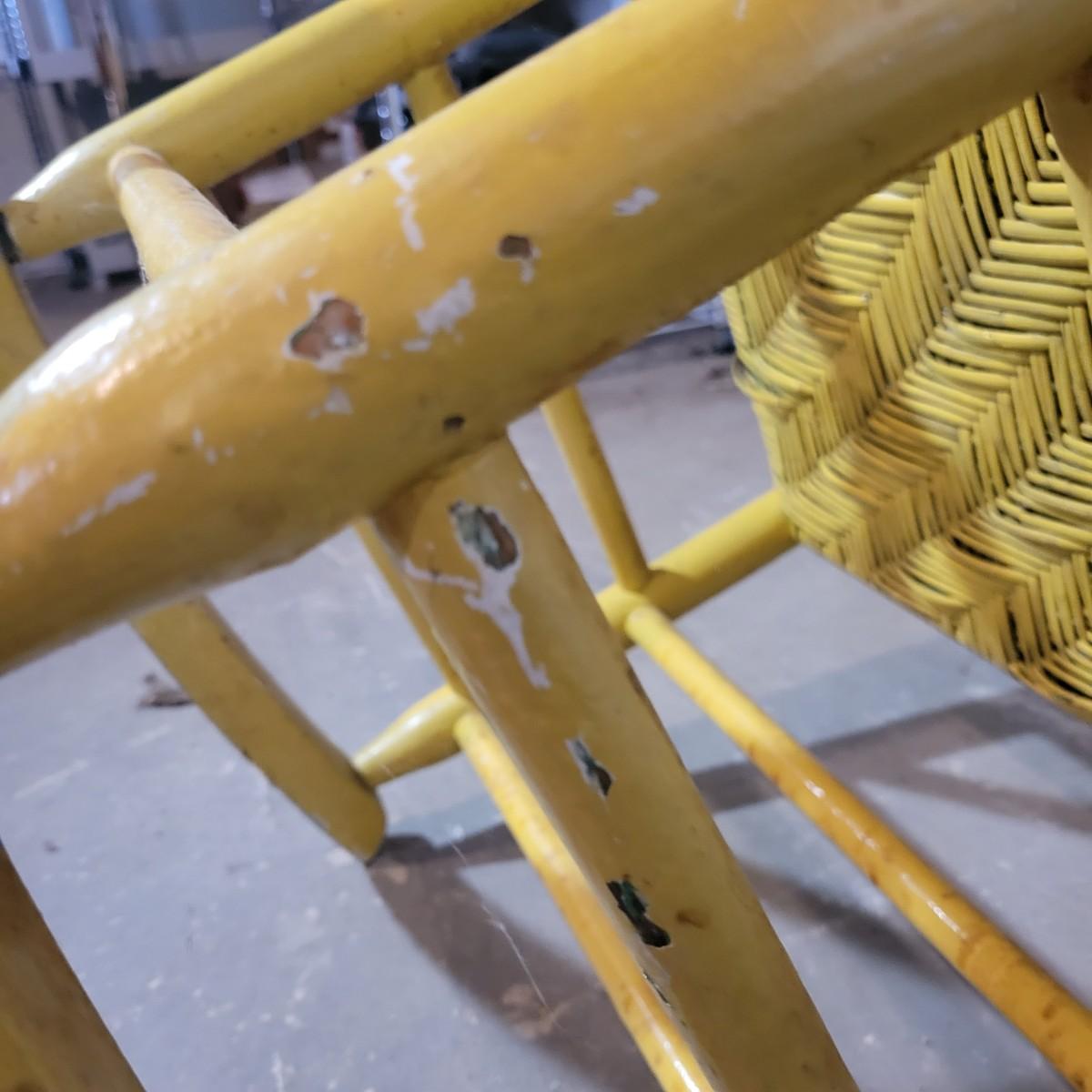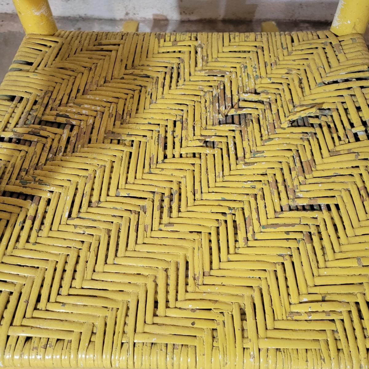 A wooden rocking chair with a woven seat in fair condition, but could easily be refinished or painted to bring it new life as it is still structurally sound. Woven seat has some broken pieces. Measures approximately 29" x 23.5" x 41" with a seat height of 16" Local pickup only