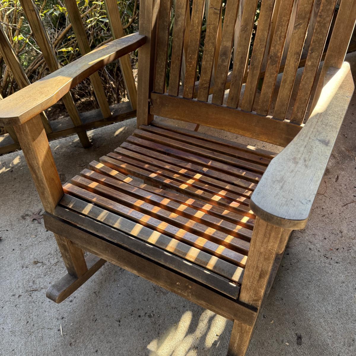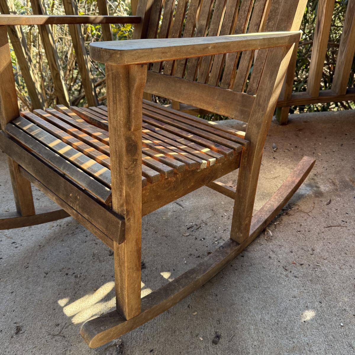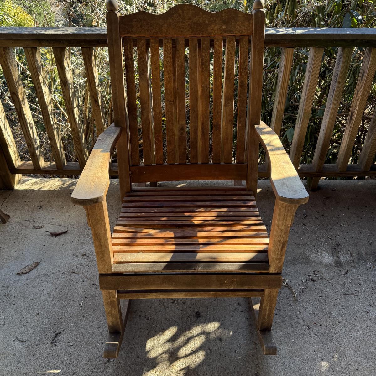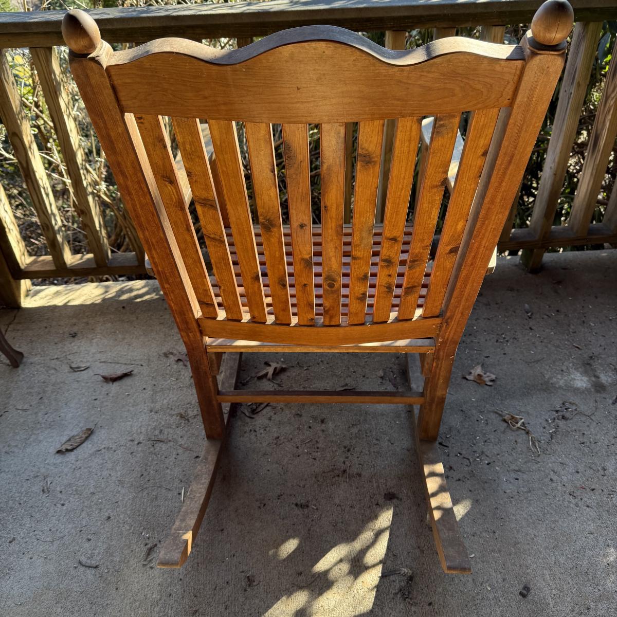 Sturdy wooden rocking chair. Measures approximately 26” x 40” x 41”H with an 18” seat height. The chair has been outside and would benefit from a good cleaning and/or refinishing. One slat in the seat is cracked, see photos.