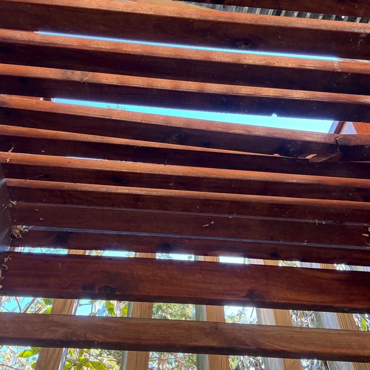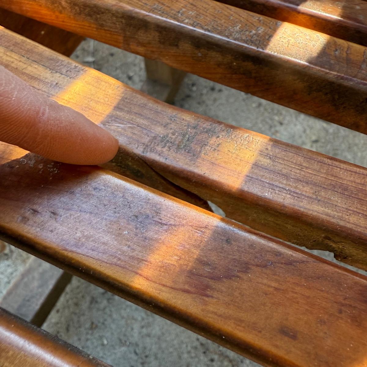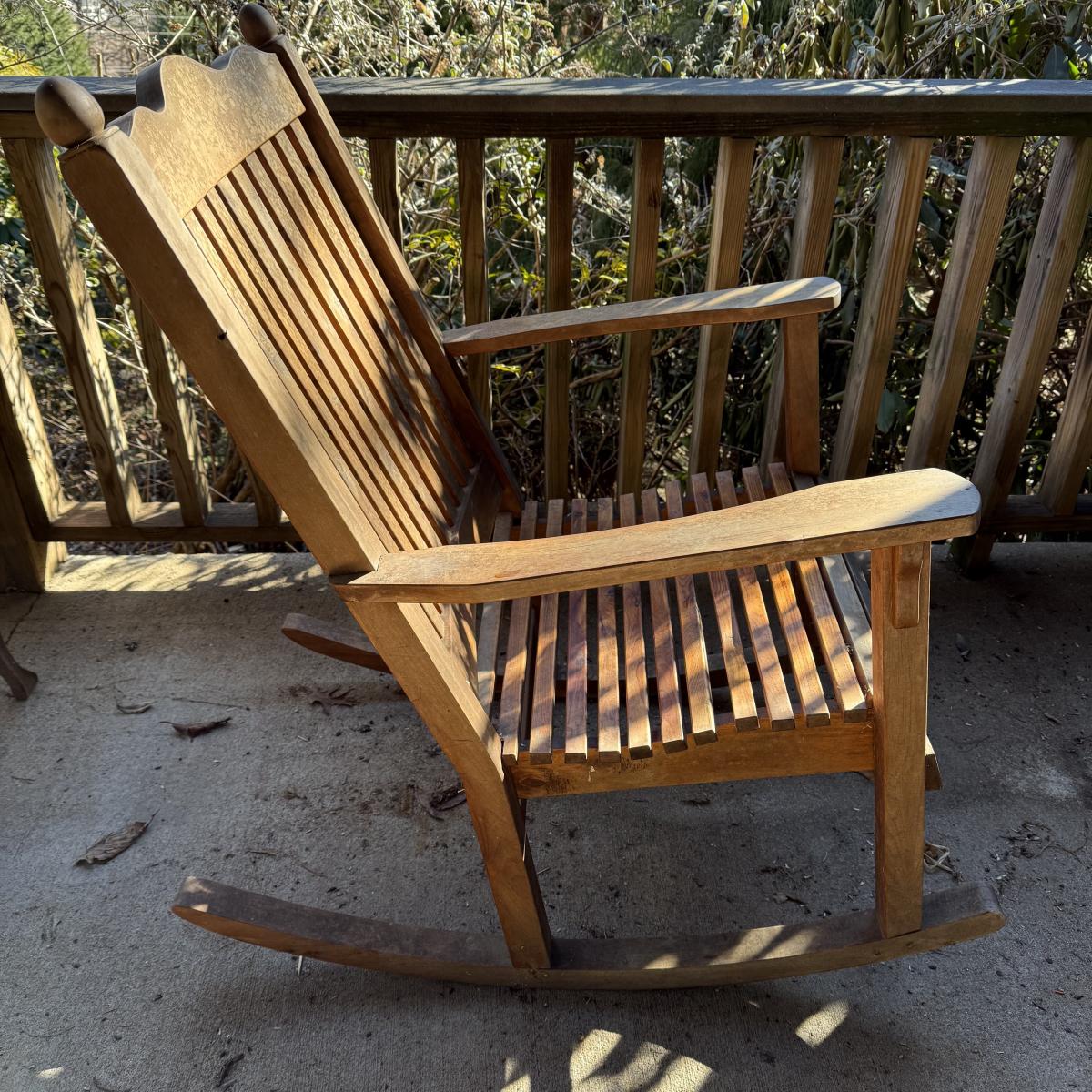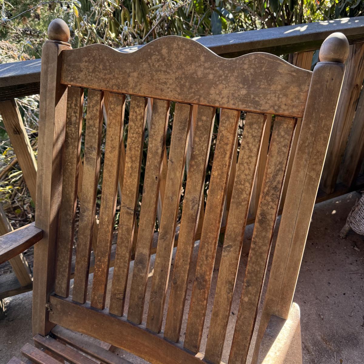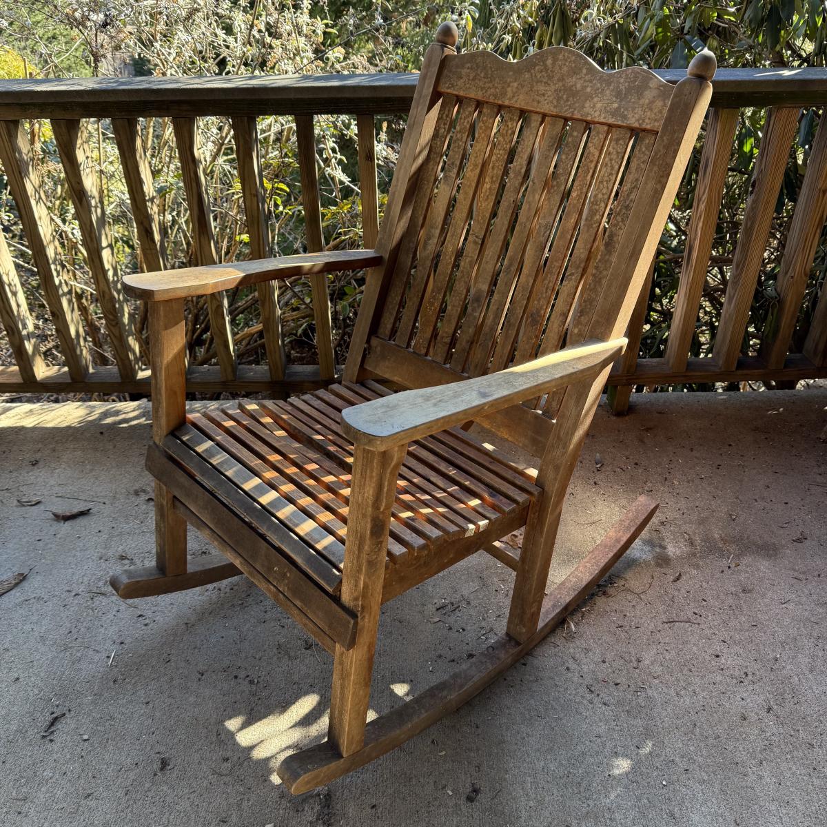 Sturdy wooden rocking chair. Measures approximately 26” x 40” x 41”H with an 18” seat height. The chair has been outside and would benefit from a good cleaning and/or refinishing. One slat in the seat is cracked, see photos.
