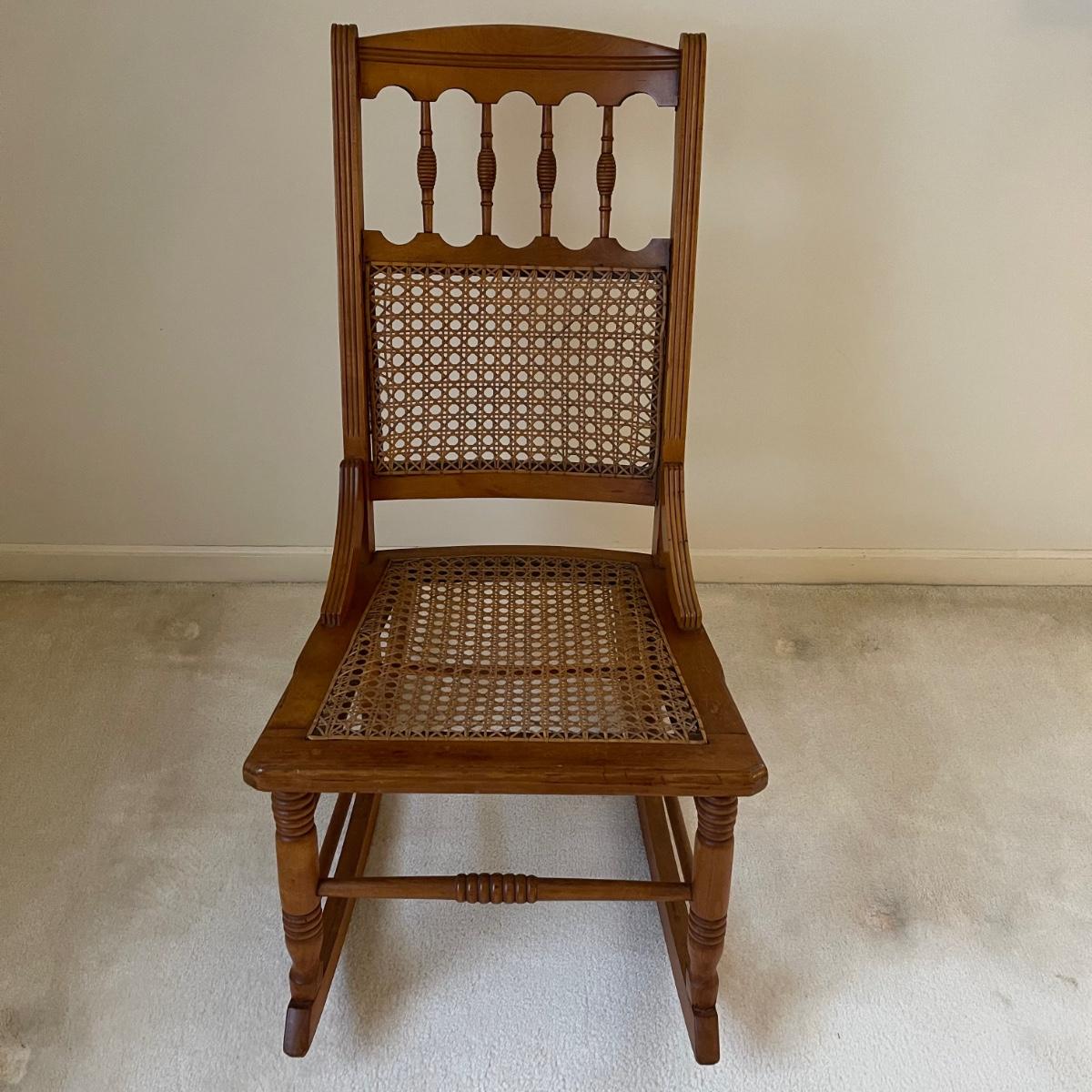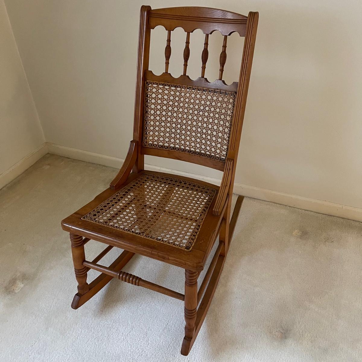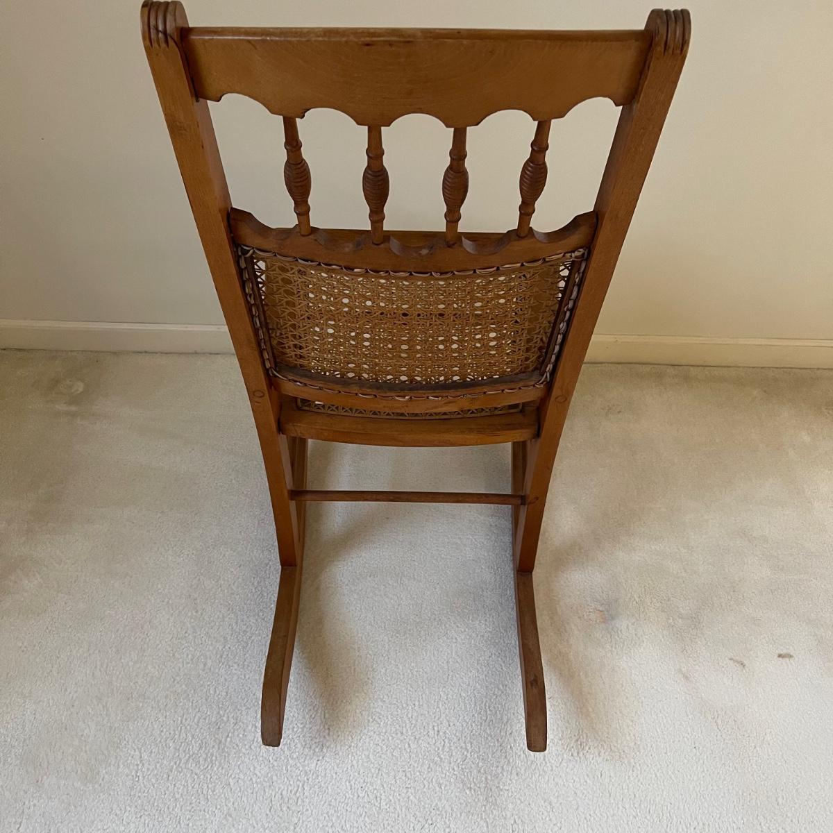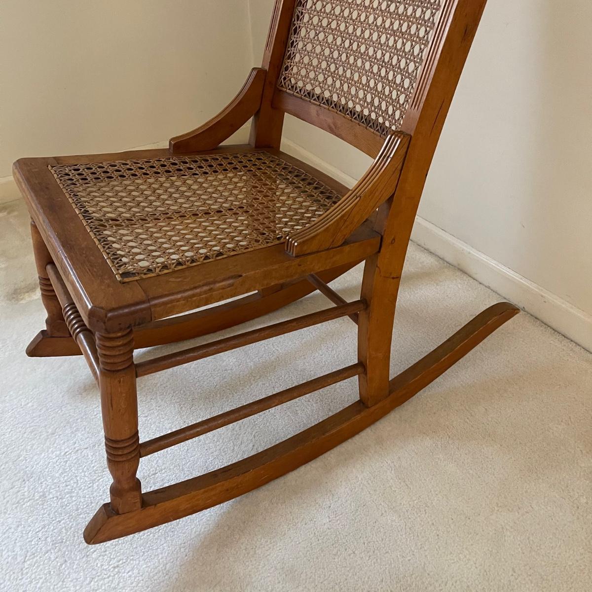 This wooden rocking chair has a wicker seat and partial back, the wicker is in good condition and there is no noticeable fraying or breakage. The chair rocks well and creaks mildly. Overall, this rocking chair seems comfortable and solid.