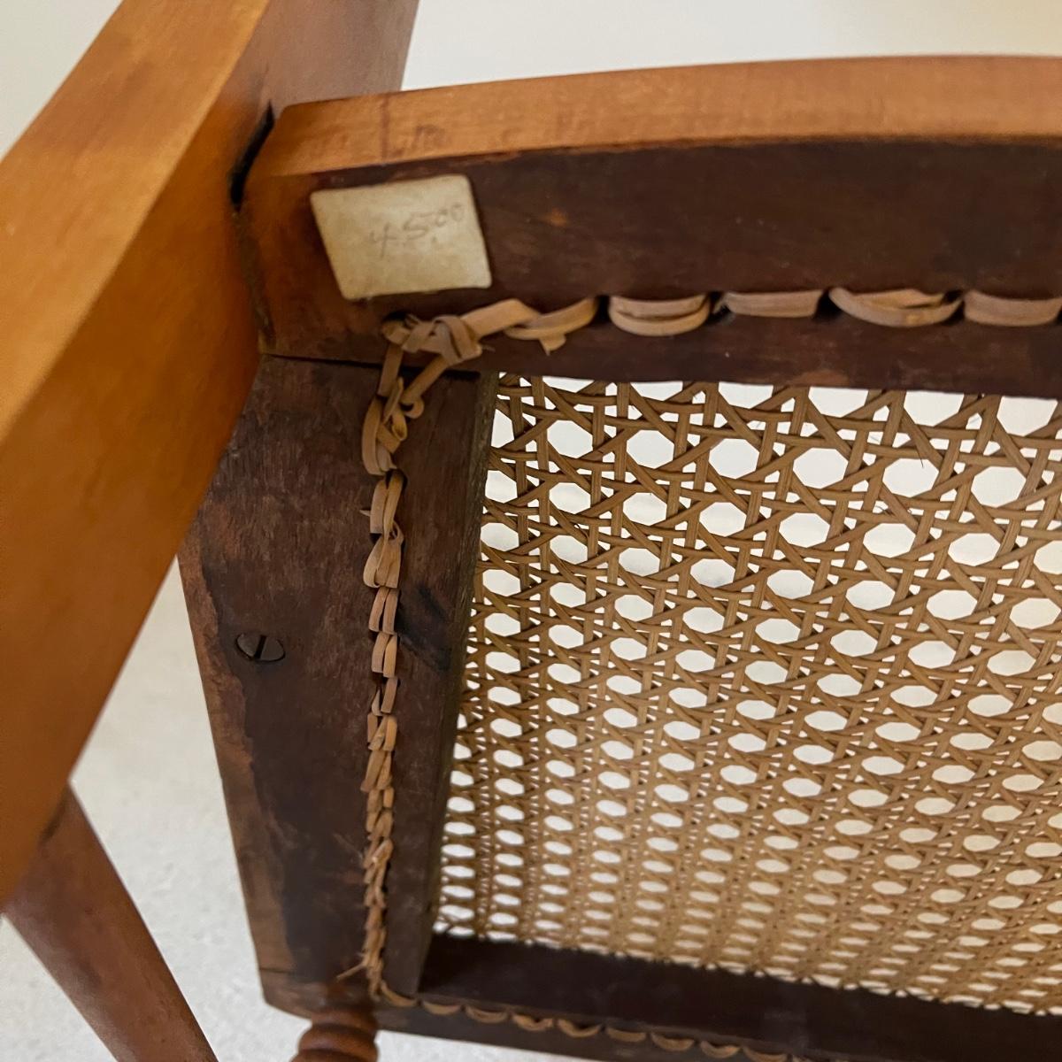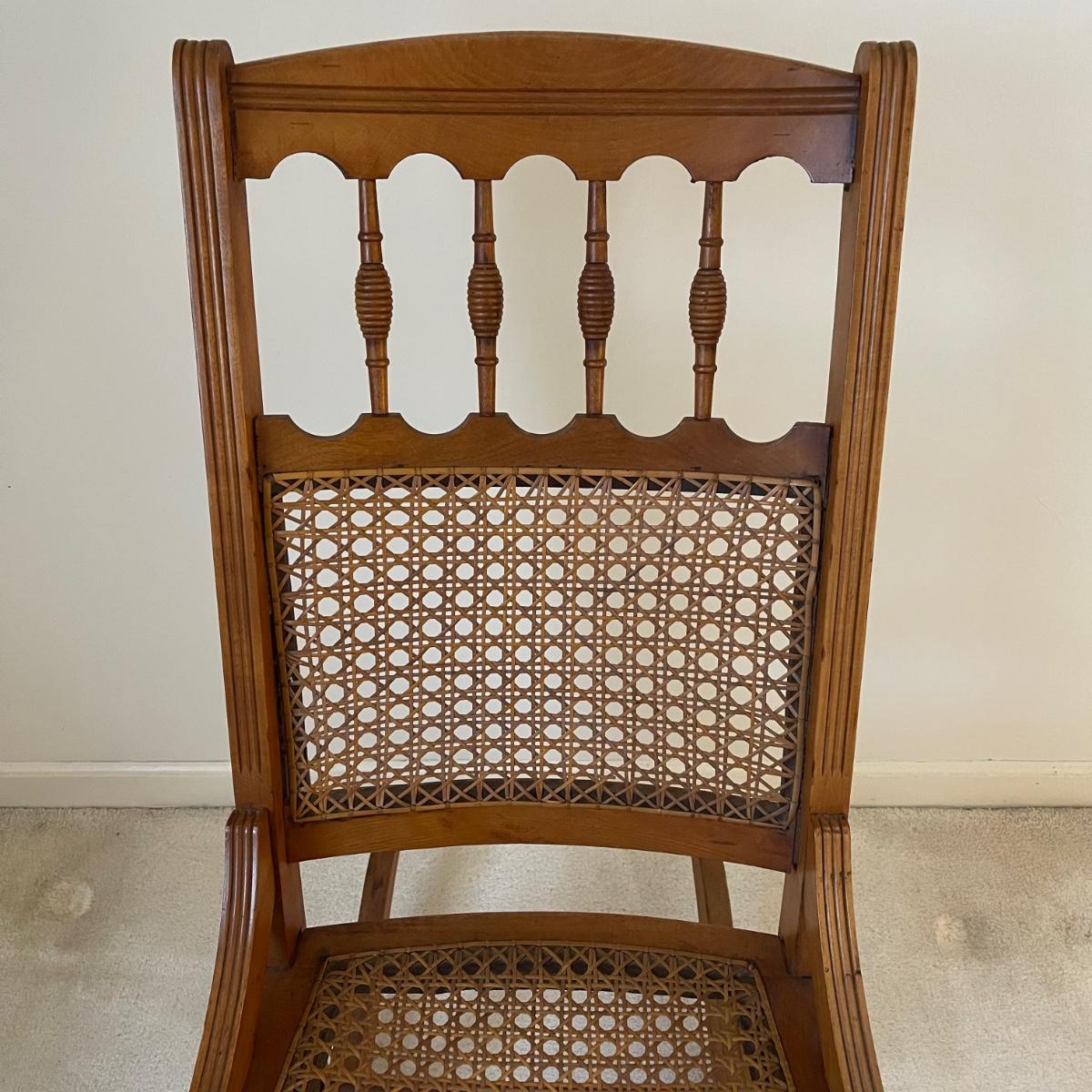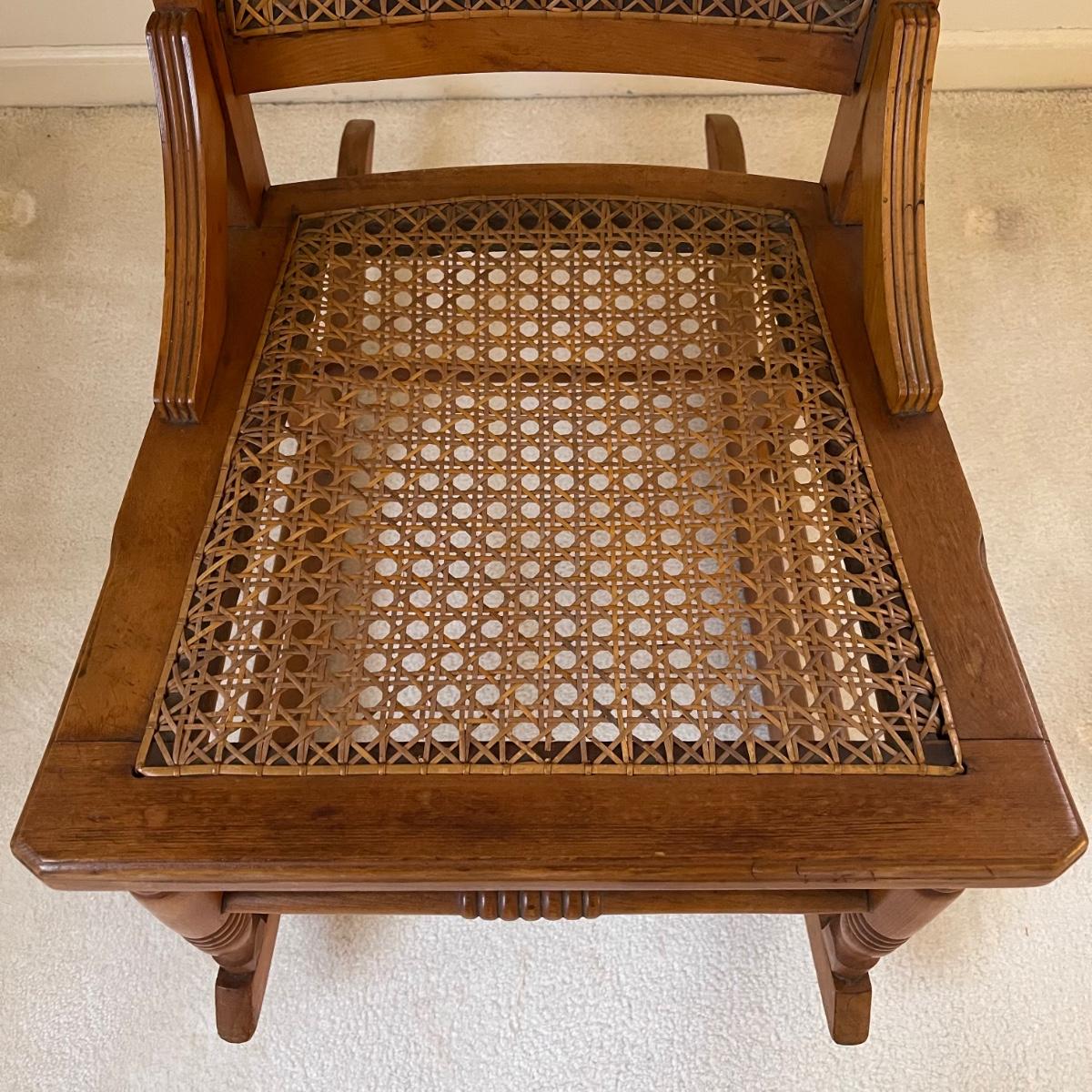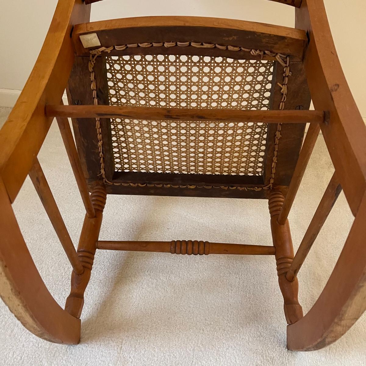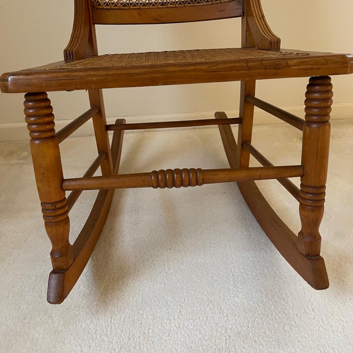 This wooden rocking chair has a wicker seat and partial back, the wicker is in good condition and there is no noticeable fraying or breakage. The chair rocks well and creaks mildly. Overall, this rocking chair seems comfortable and solid.