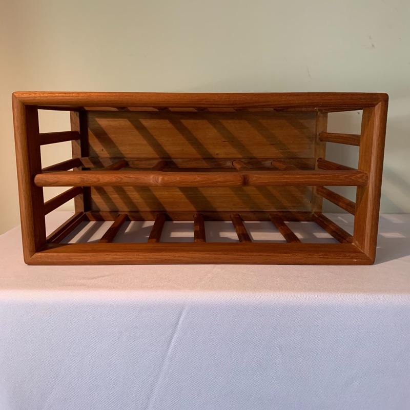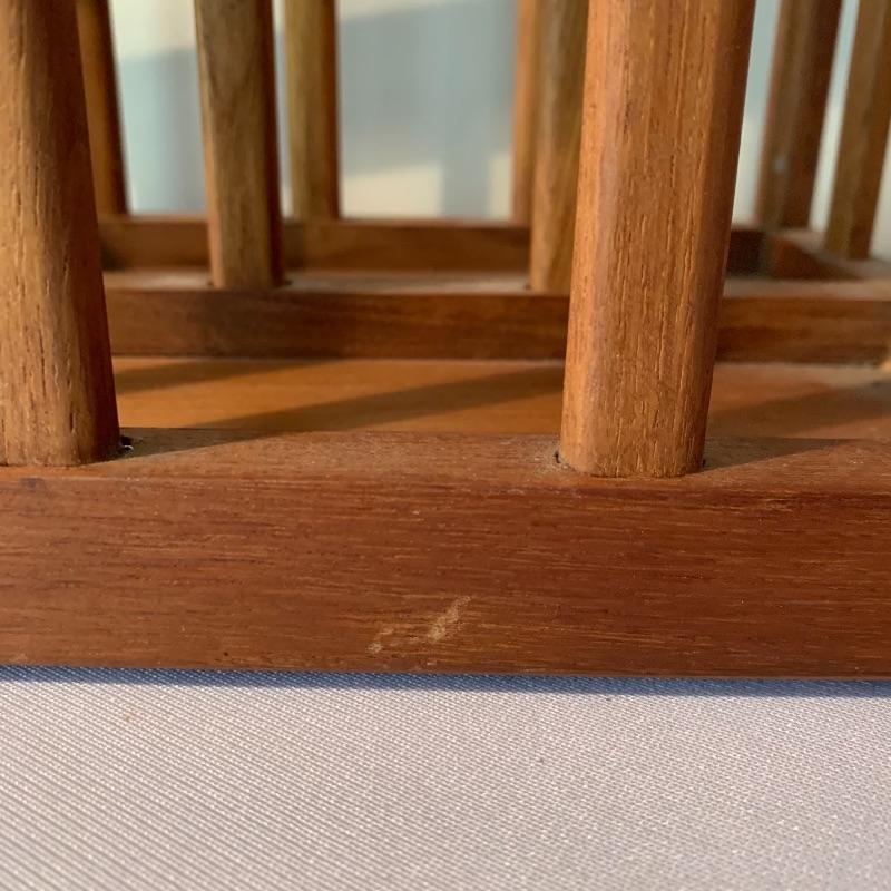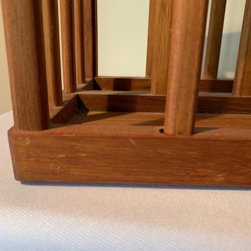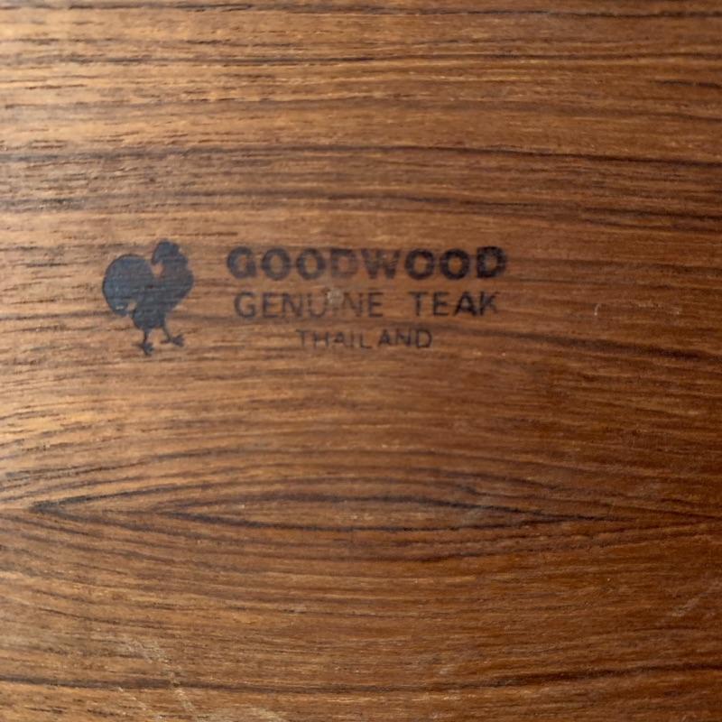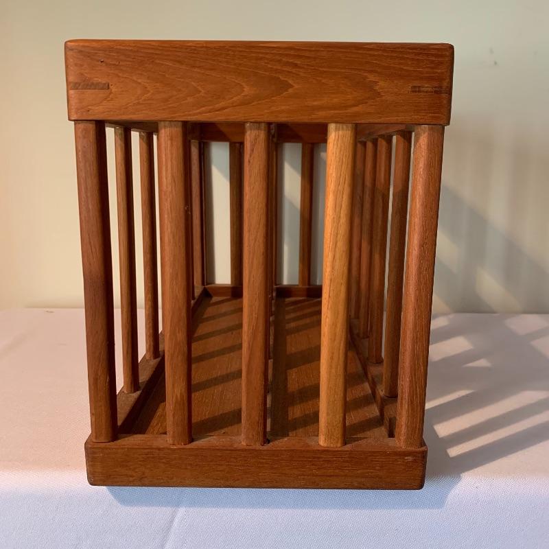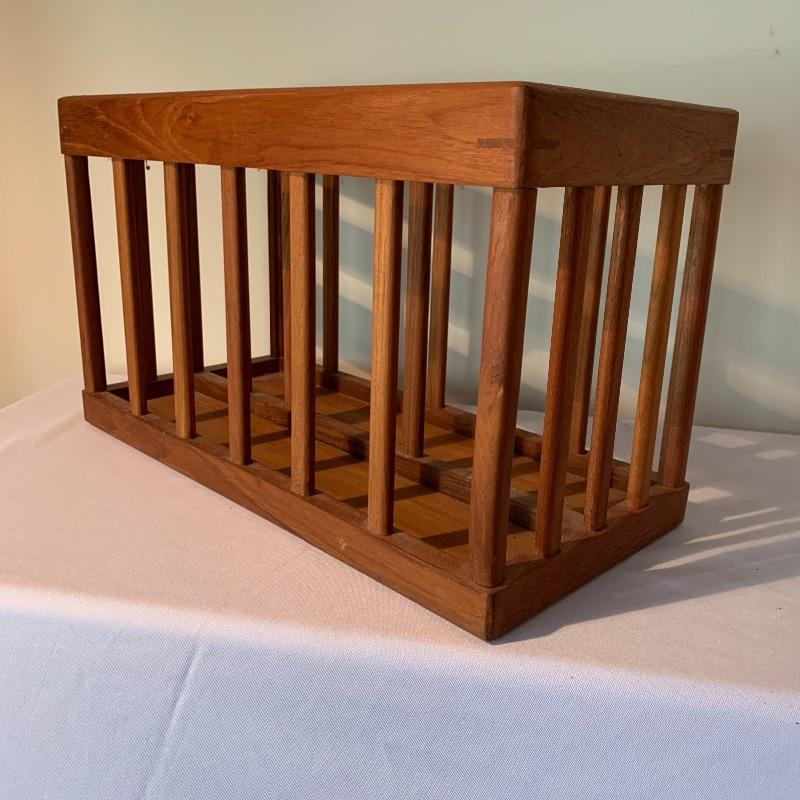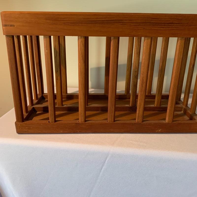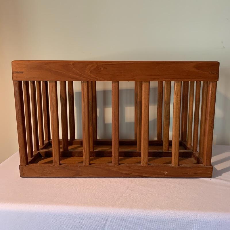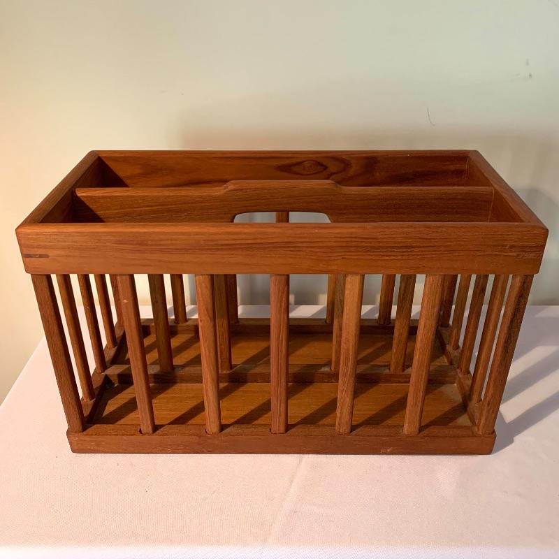 The magazine rack has a handle in the middle and measures 18.25”L x 8.75”W x 10.75”H. The stamp on the bottom the the magazine rack says Goodwood Genuine Teak from Thailand. In used but great condition, with a few small scratches (pictured). Local pickup only.