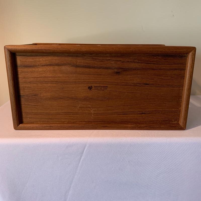 Lot includes a rolling cart and magazine rack by Goodwood made of teak. The cart has four wheels and measures 30.5”L x 19.25”W x 30.5”H. In excellent condition.