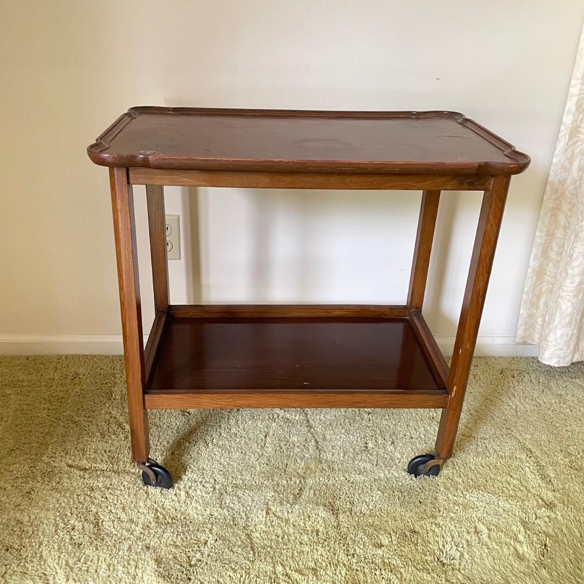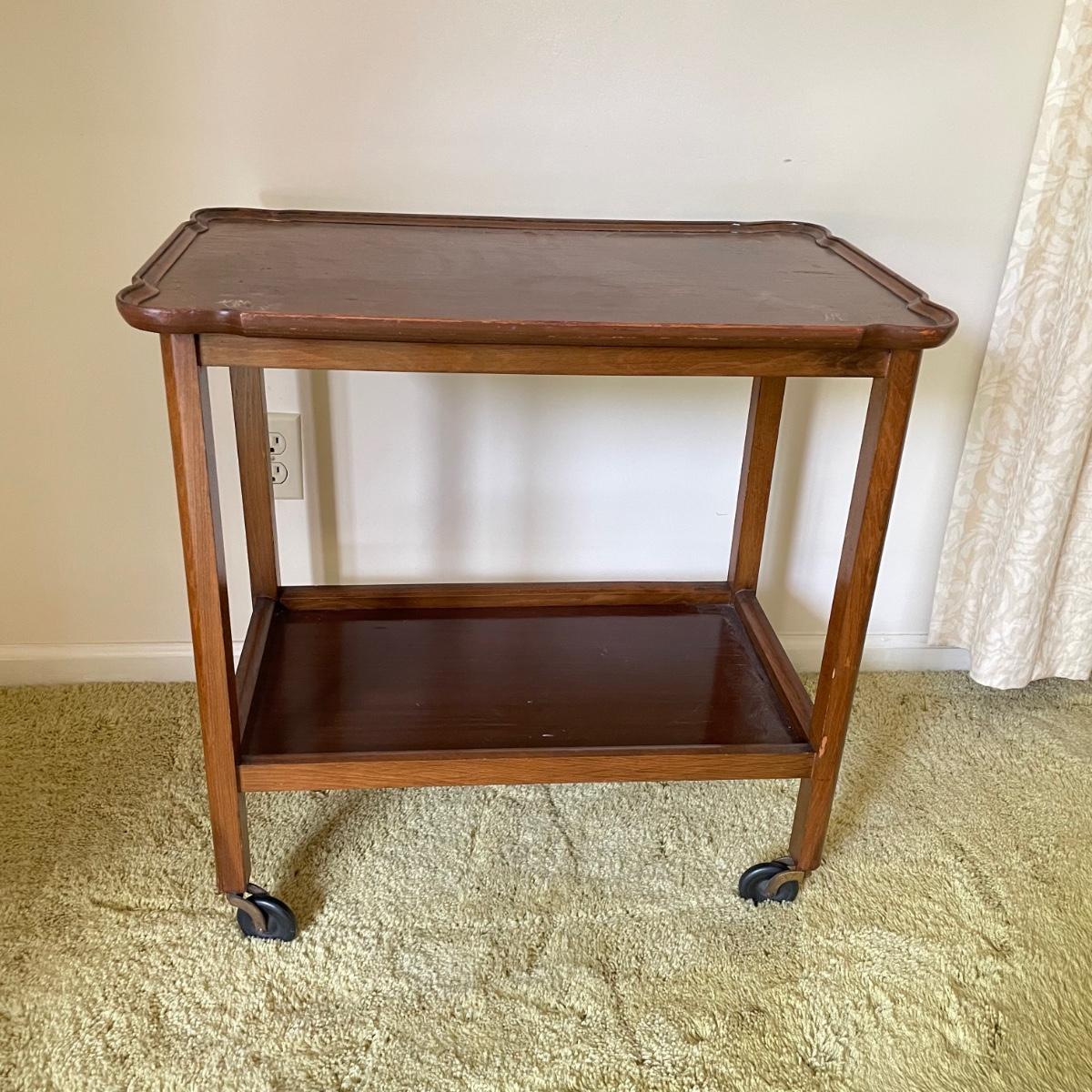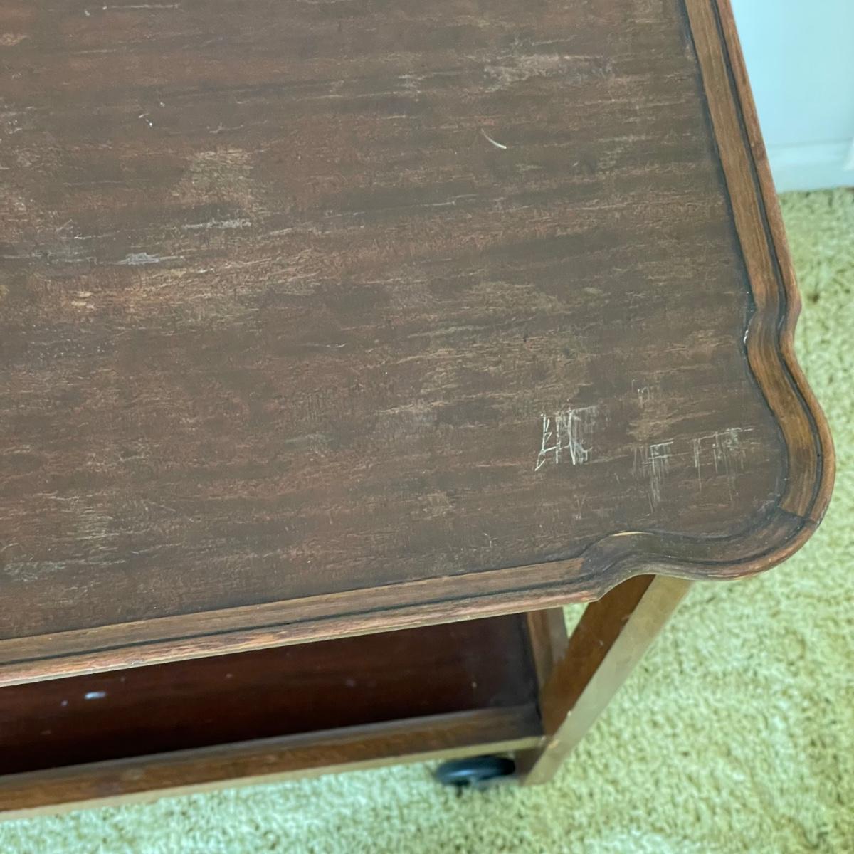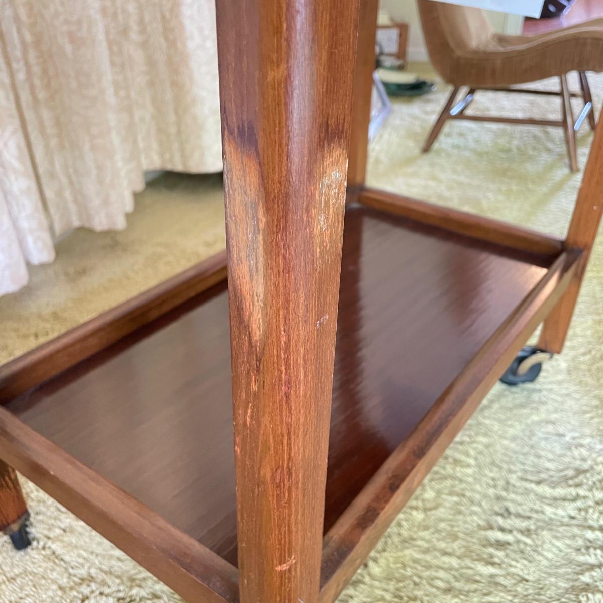 Rolling wooden cart sits on four casters. The cart is a bit wobbly and has some scratches to the top. Cart measures 25.5” x 15.5” x 25.25”. See images. Local pick up only.