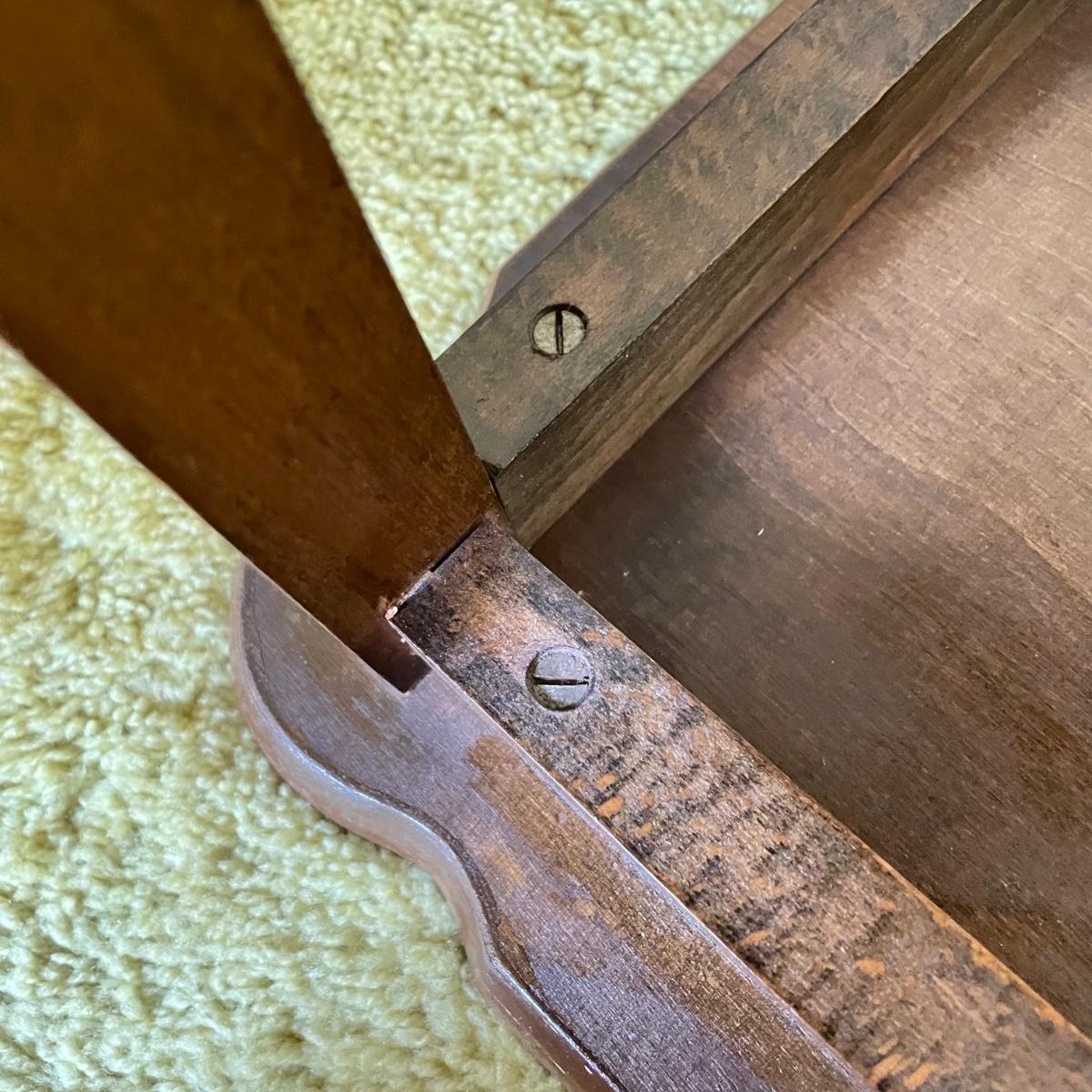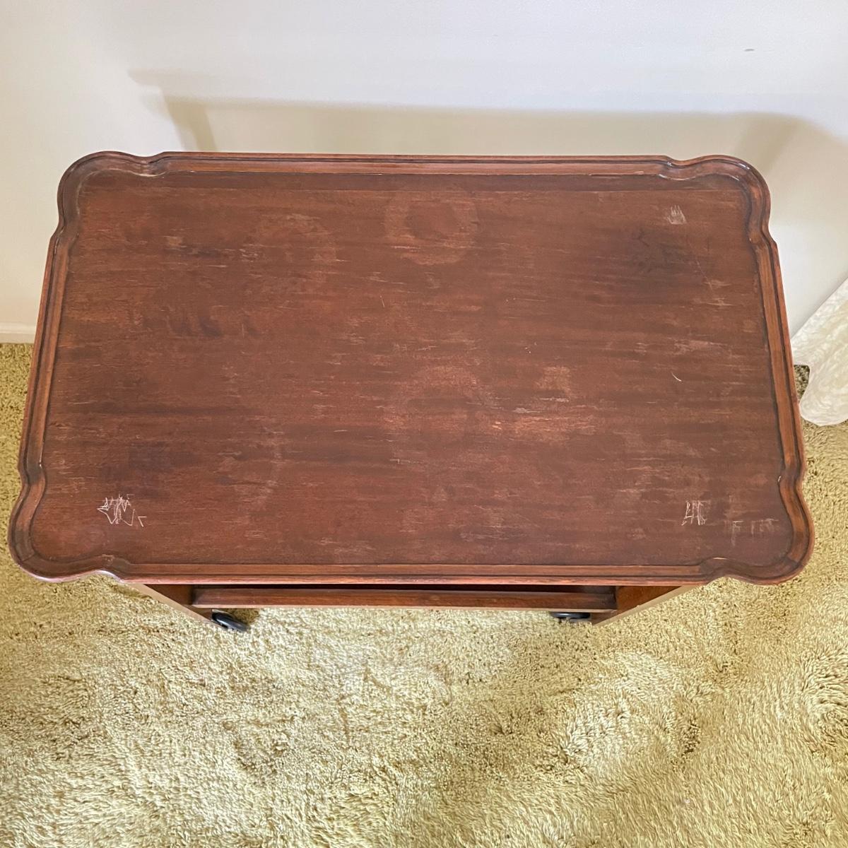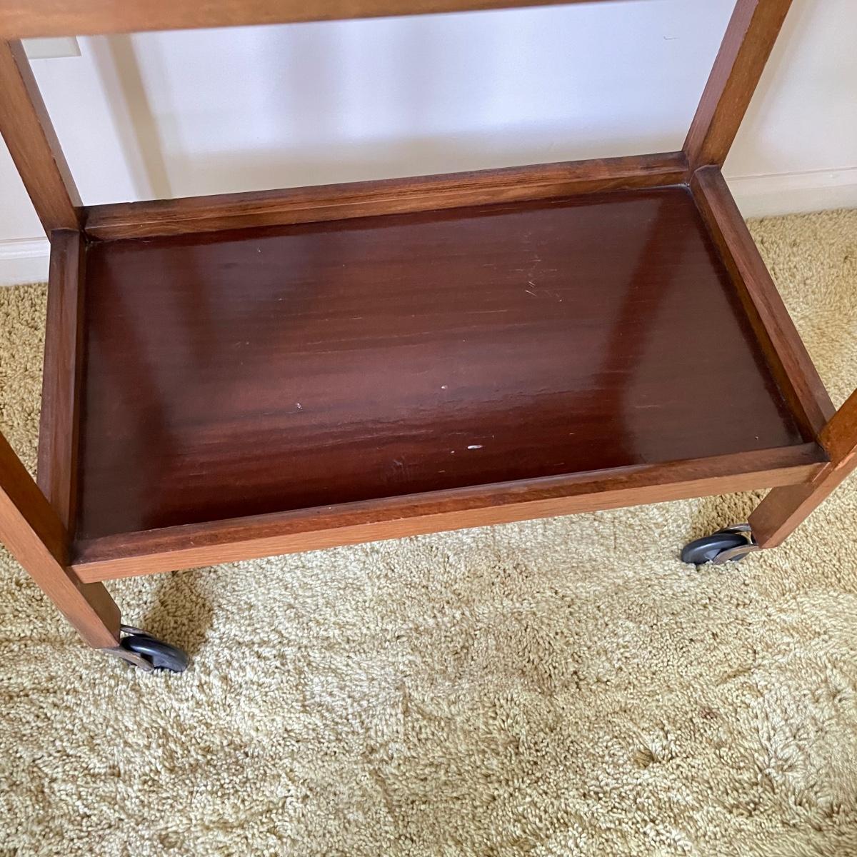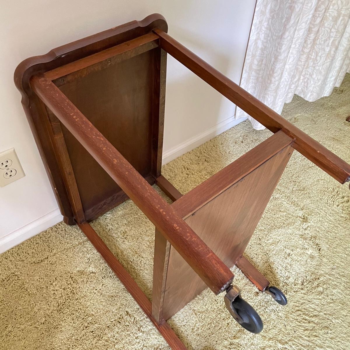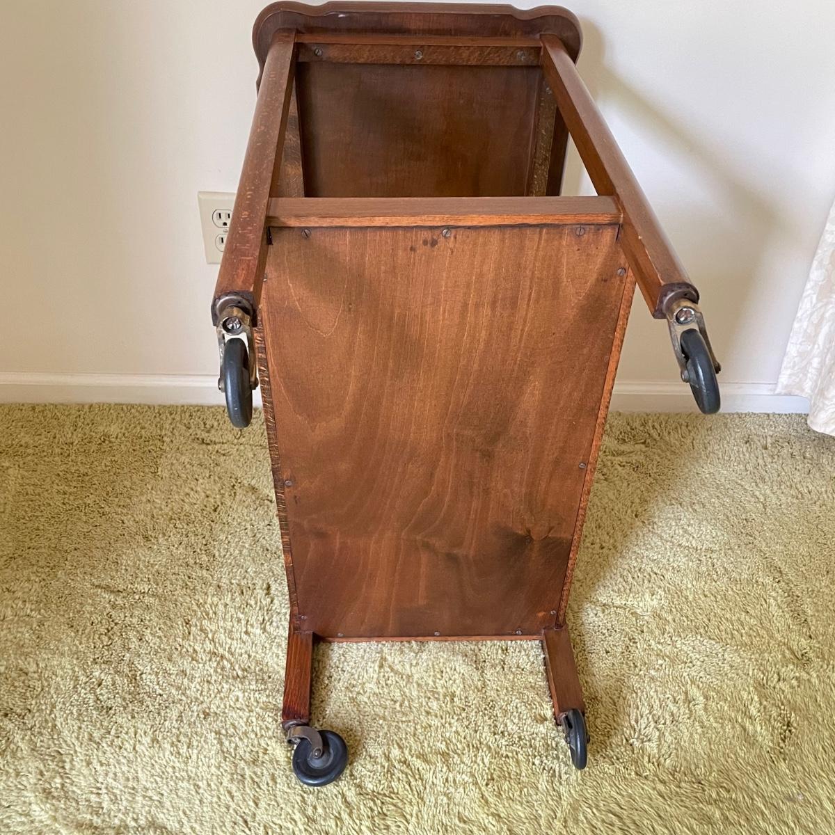 Rolling wooden cart sits on four casters. The cart is a bit wobbly and has some scratches to the top. Cart measures 25.5” x 15.5” x 25.25”. See images. Local pick up only.
