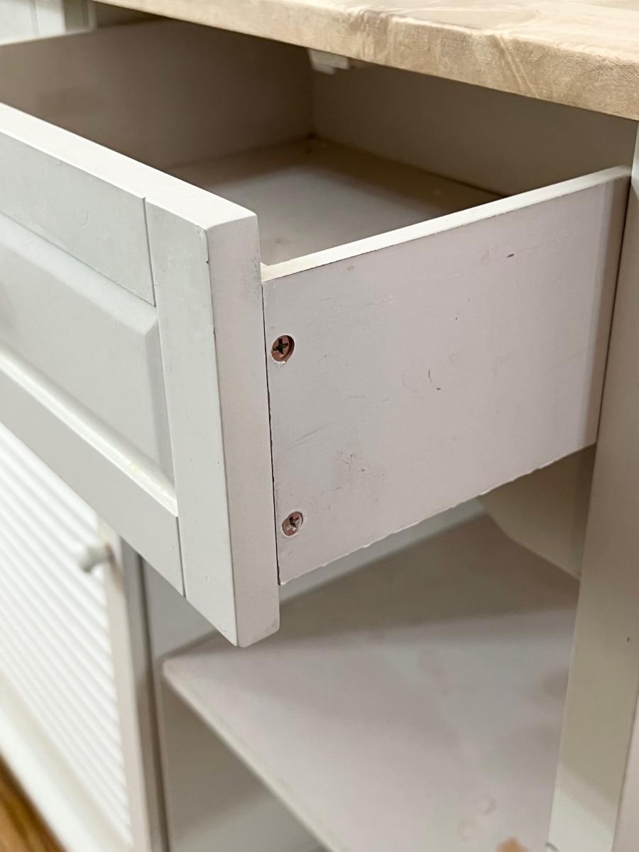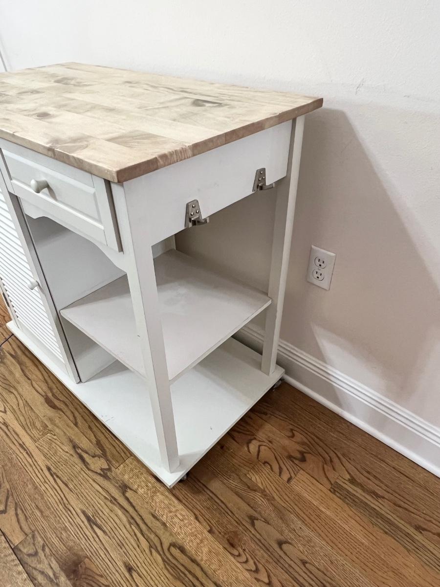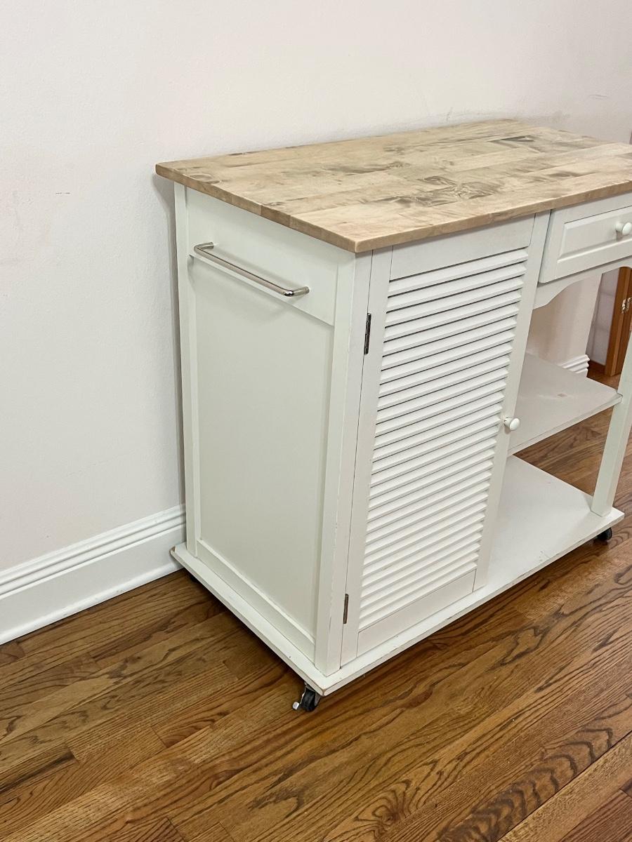 Rolls easily ~ Drawer slides easily ~ Has wear from use, see photos for condition ~ 34.5” H x 36” W x 20” D