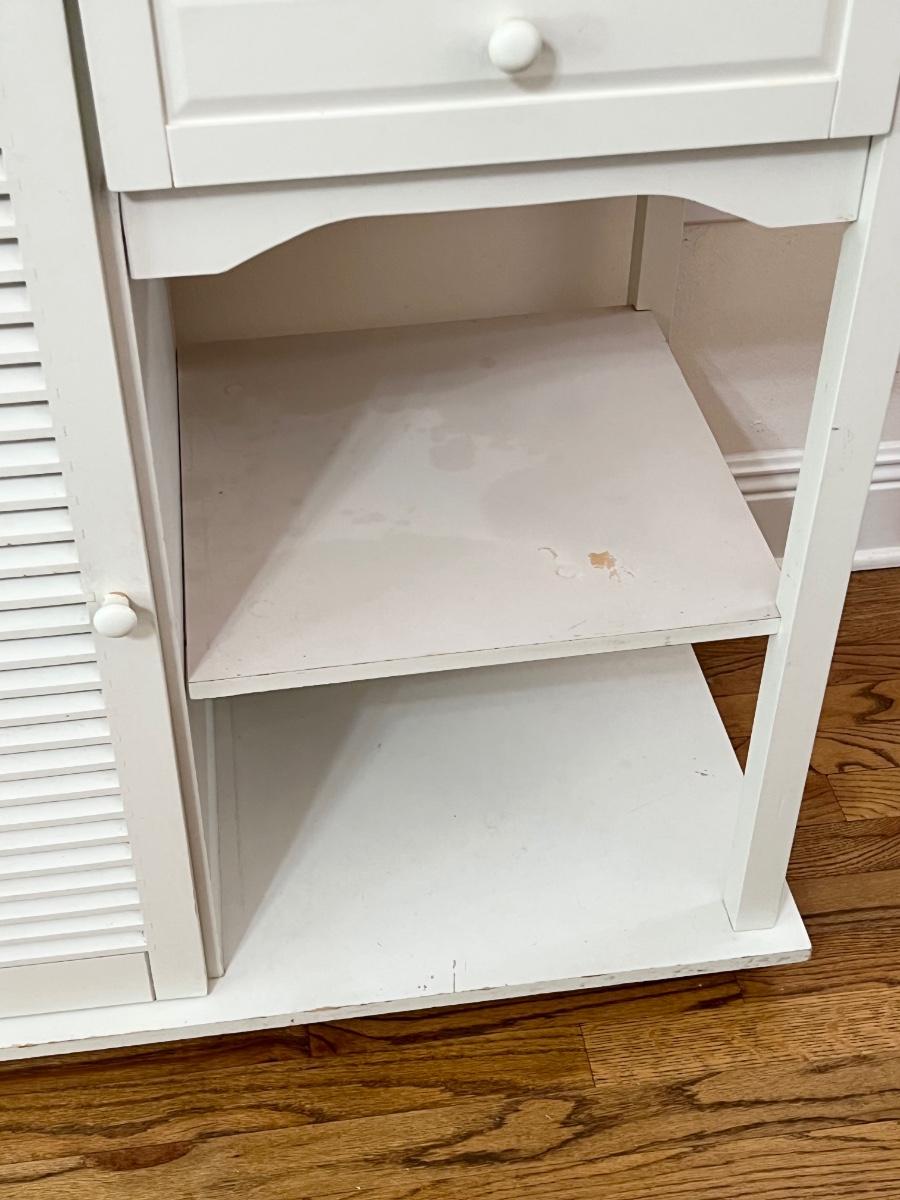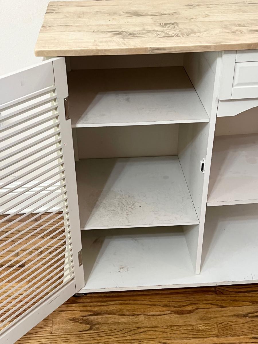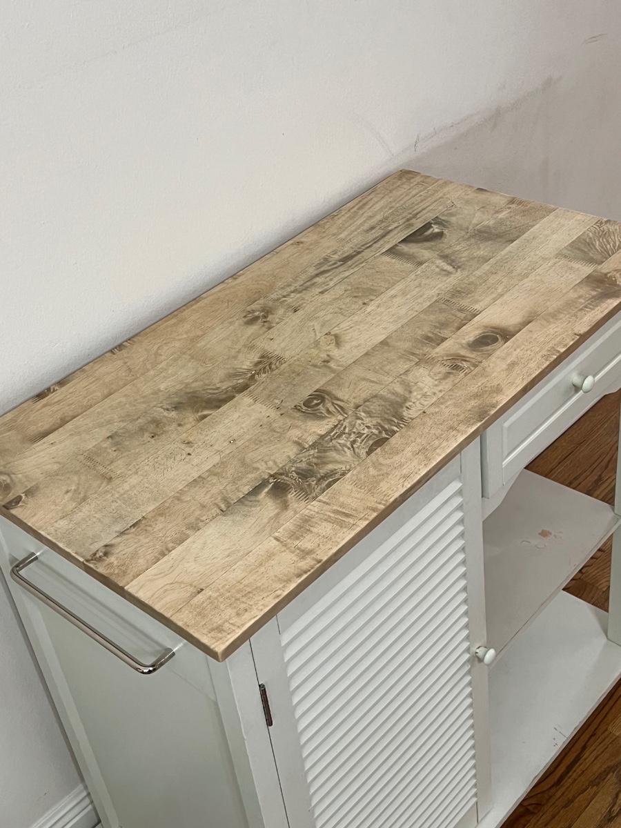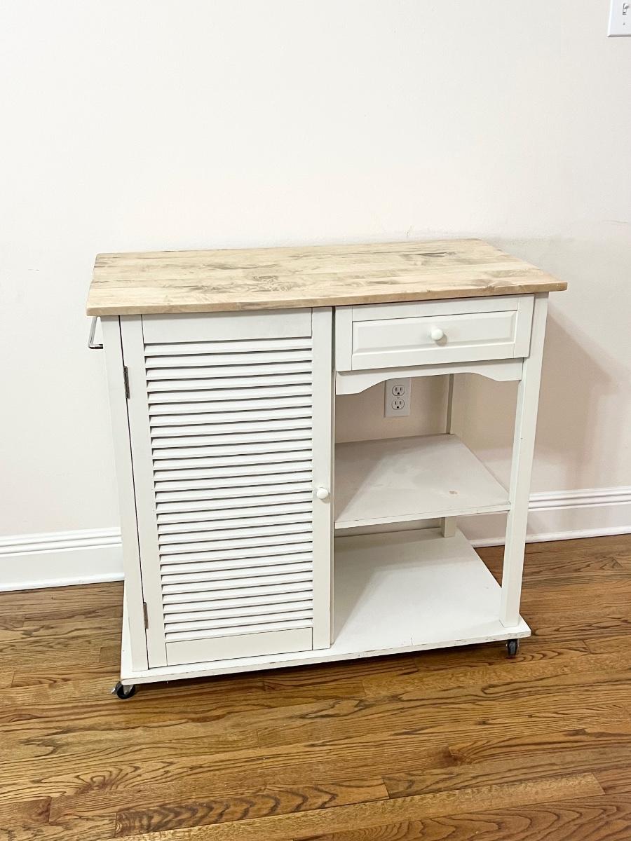 Rolls easily ~ Drawer slides easily ~ Has wear from use, see photos for condition ~ 34.5” H x 36” W x 20” D