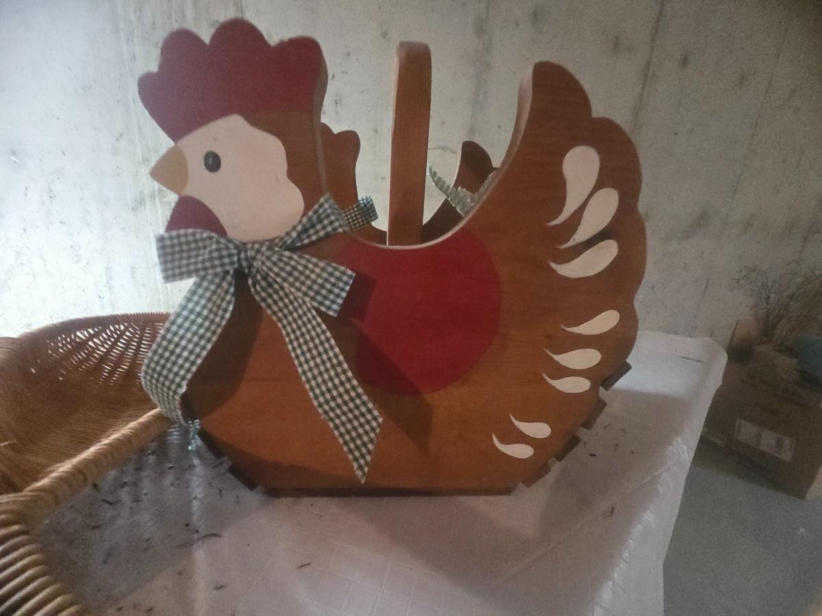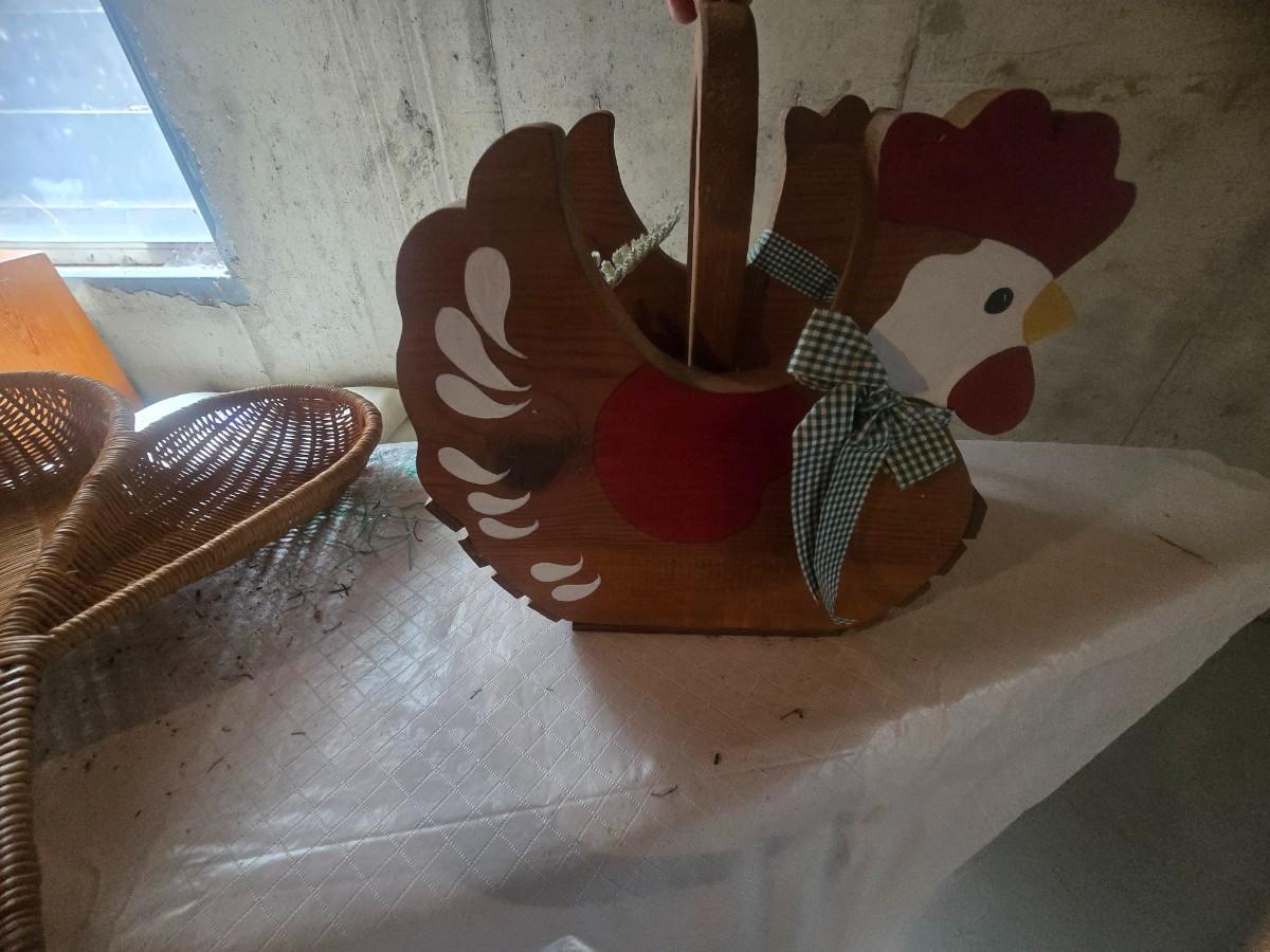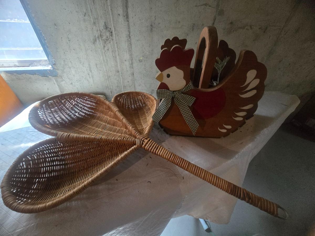 WOODEN ROOSTER BASKET AND A WICKER MCM WALL HANGING