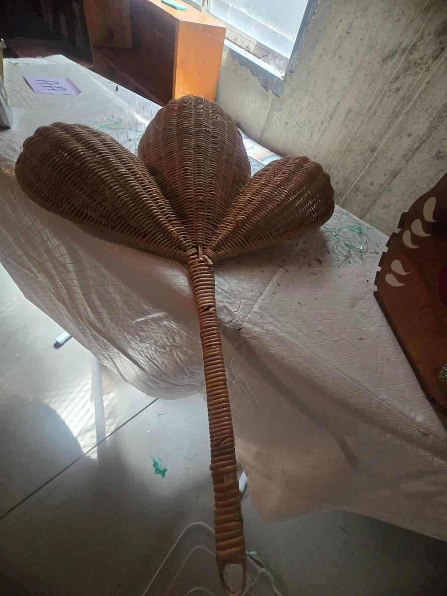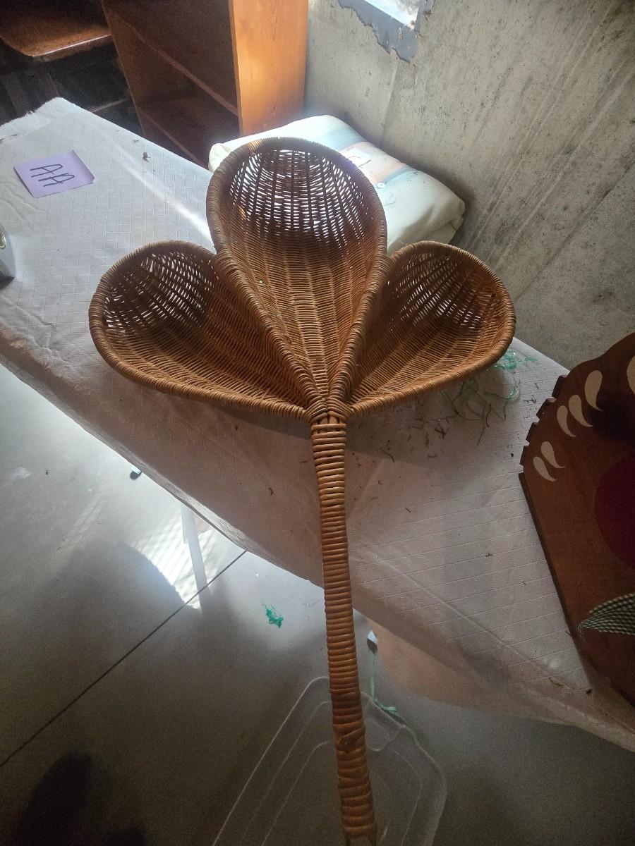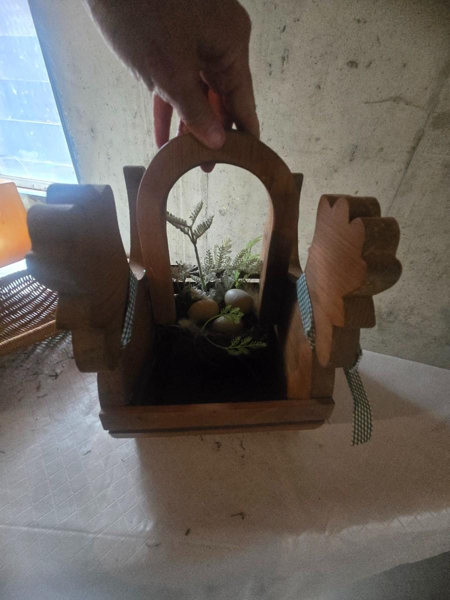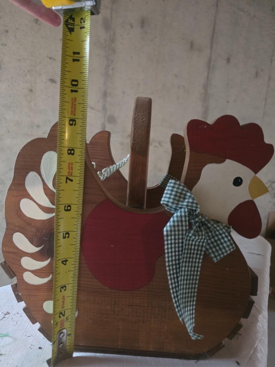 WOODEN ROOSTER BASKET AND A WICKER MCM WALL HANGING
